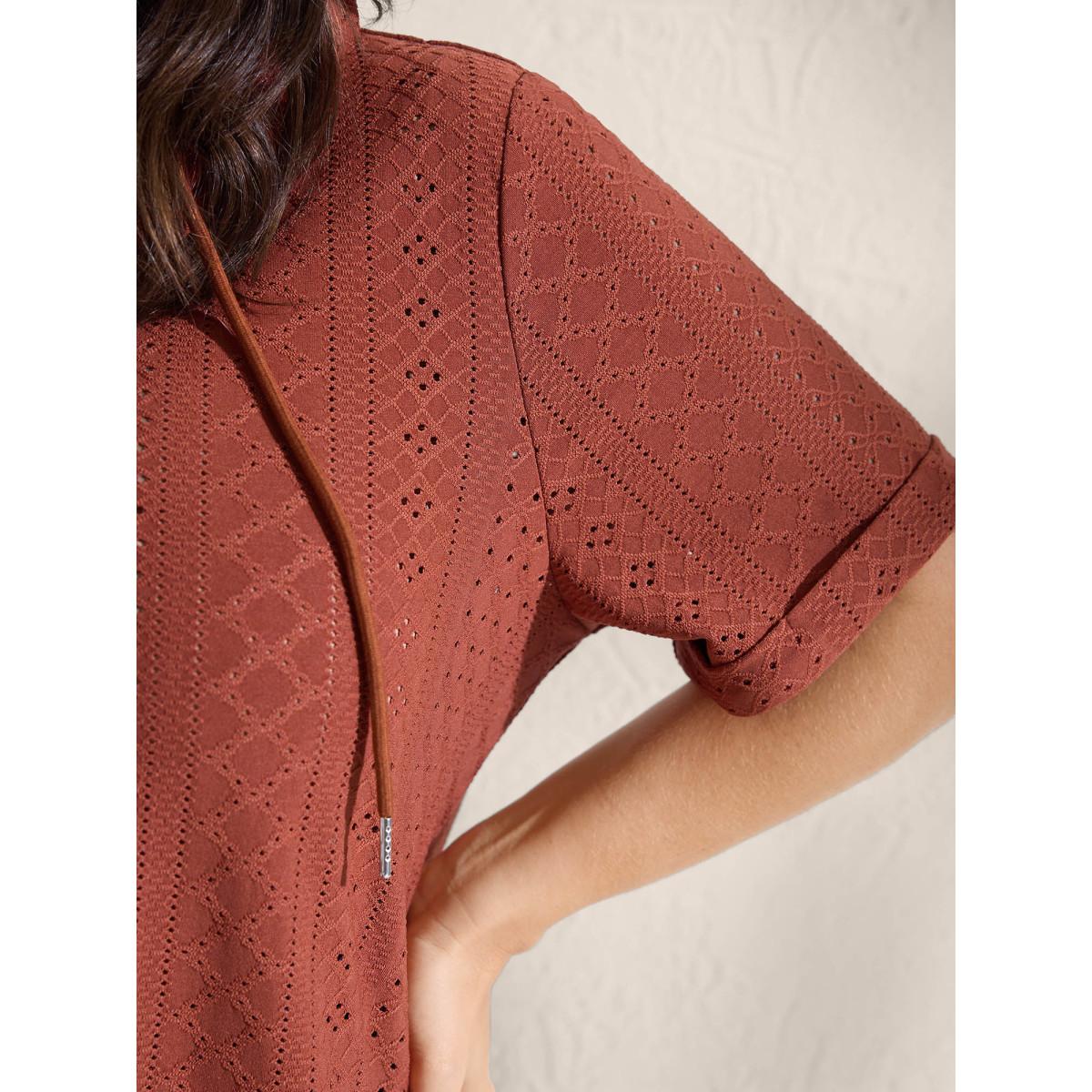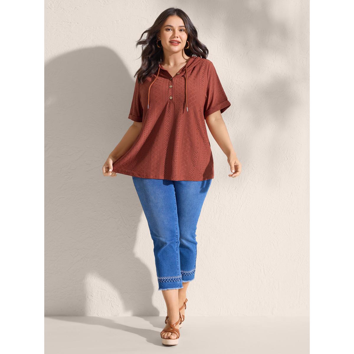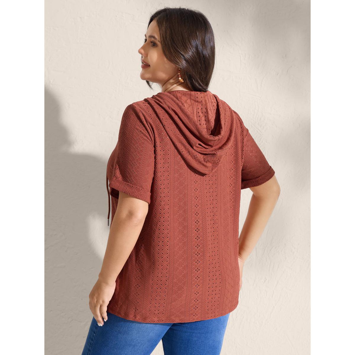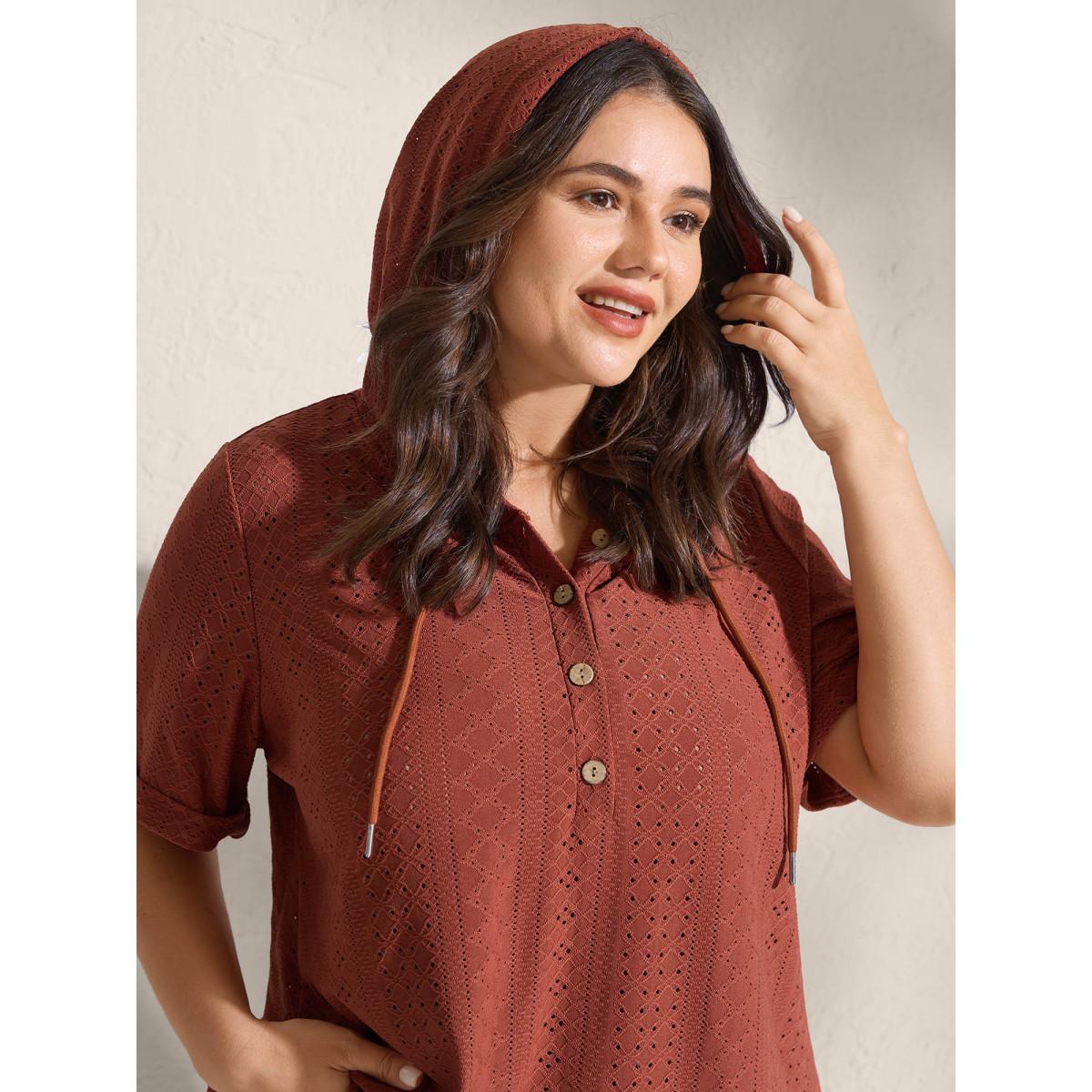 Plus Size Textured Hooded Half Button Placket T-Shirt Rust Women Boho Texture Hooded Vacation T-shirts BloomChic 18-20/2X Product Image