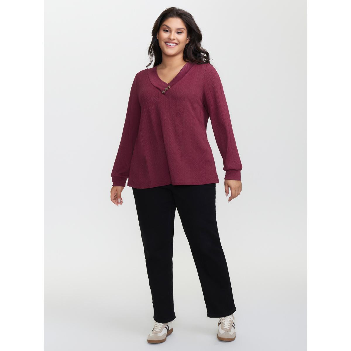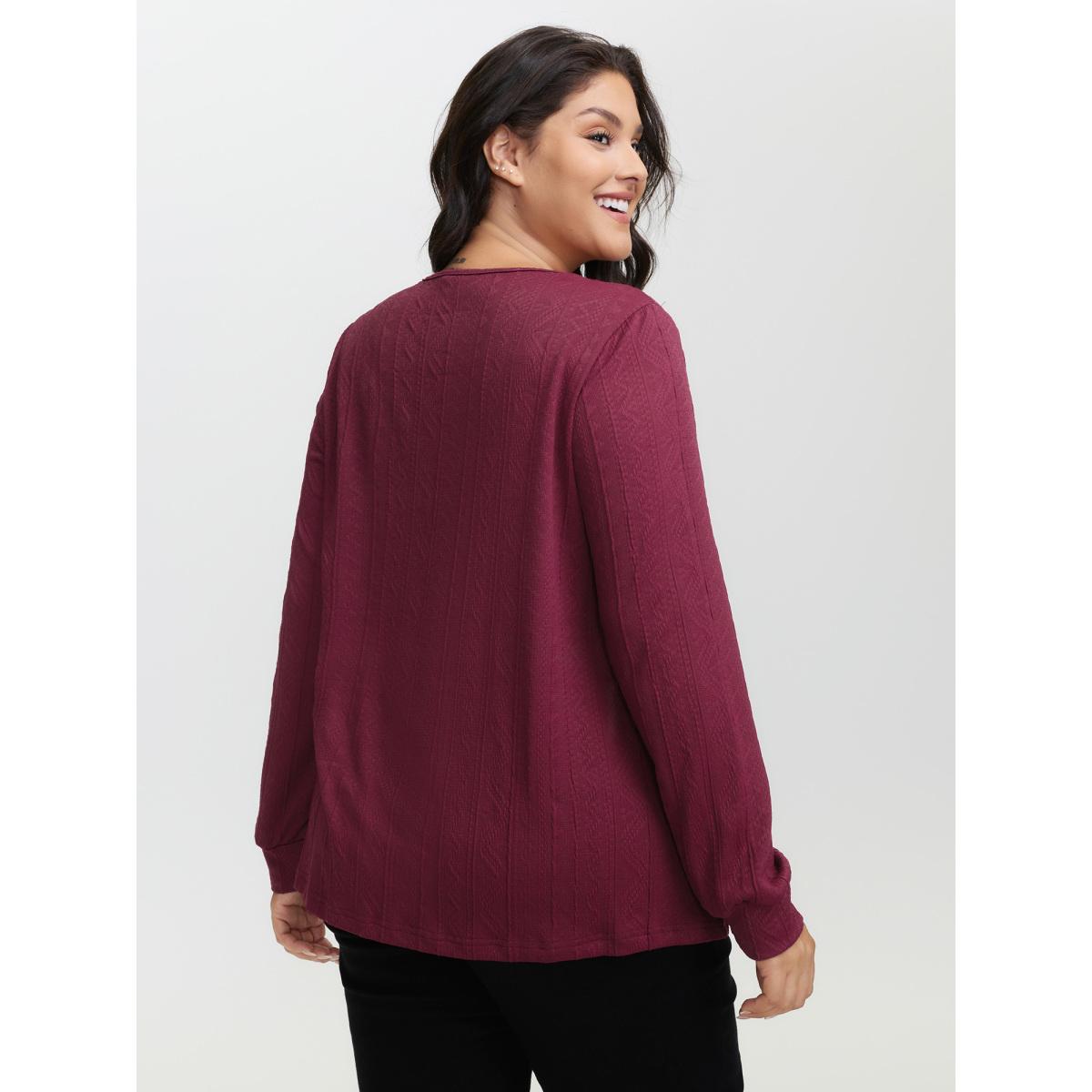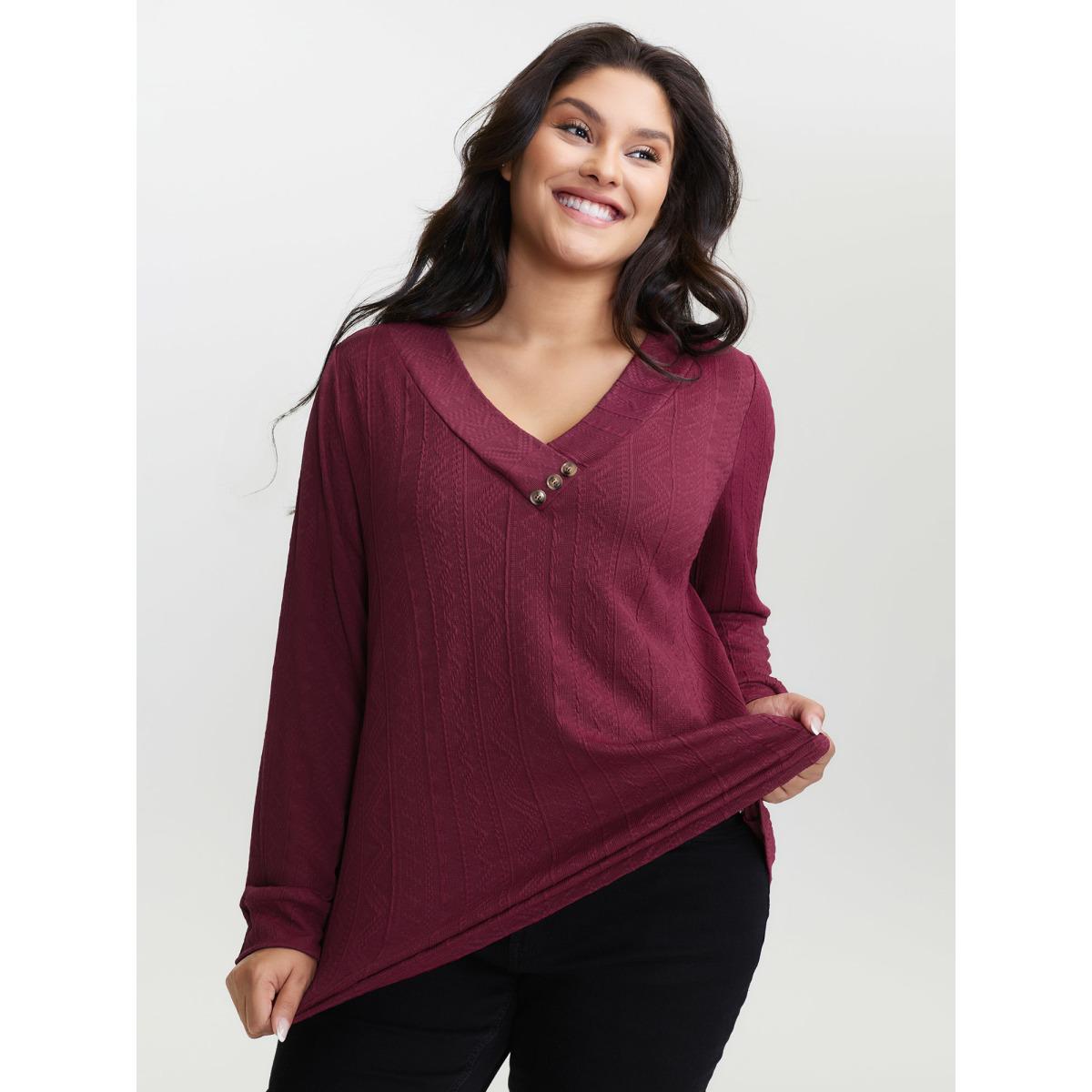 Plus Size Textured Stretchy Buttons T-Shirt Burgundy Women Leisure Texture V-neck Casual T-shirts BloomChic 14-16/1X Product Image