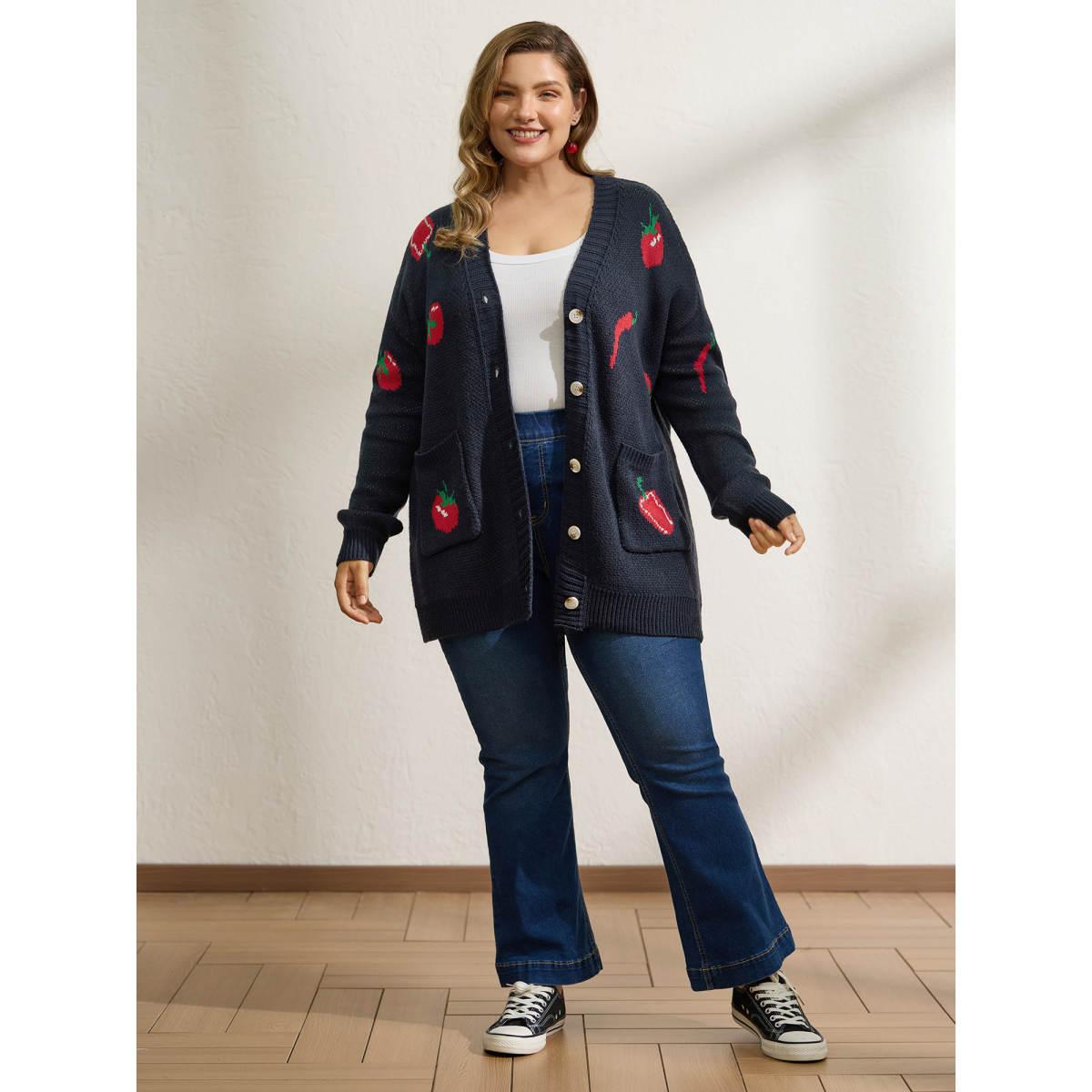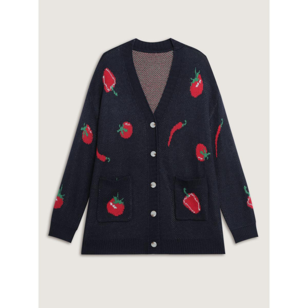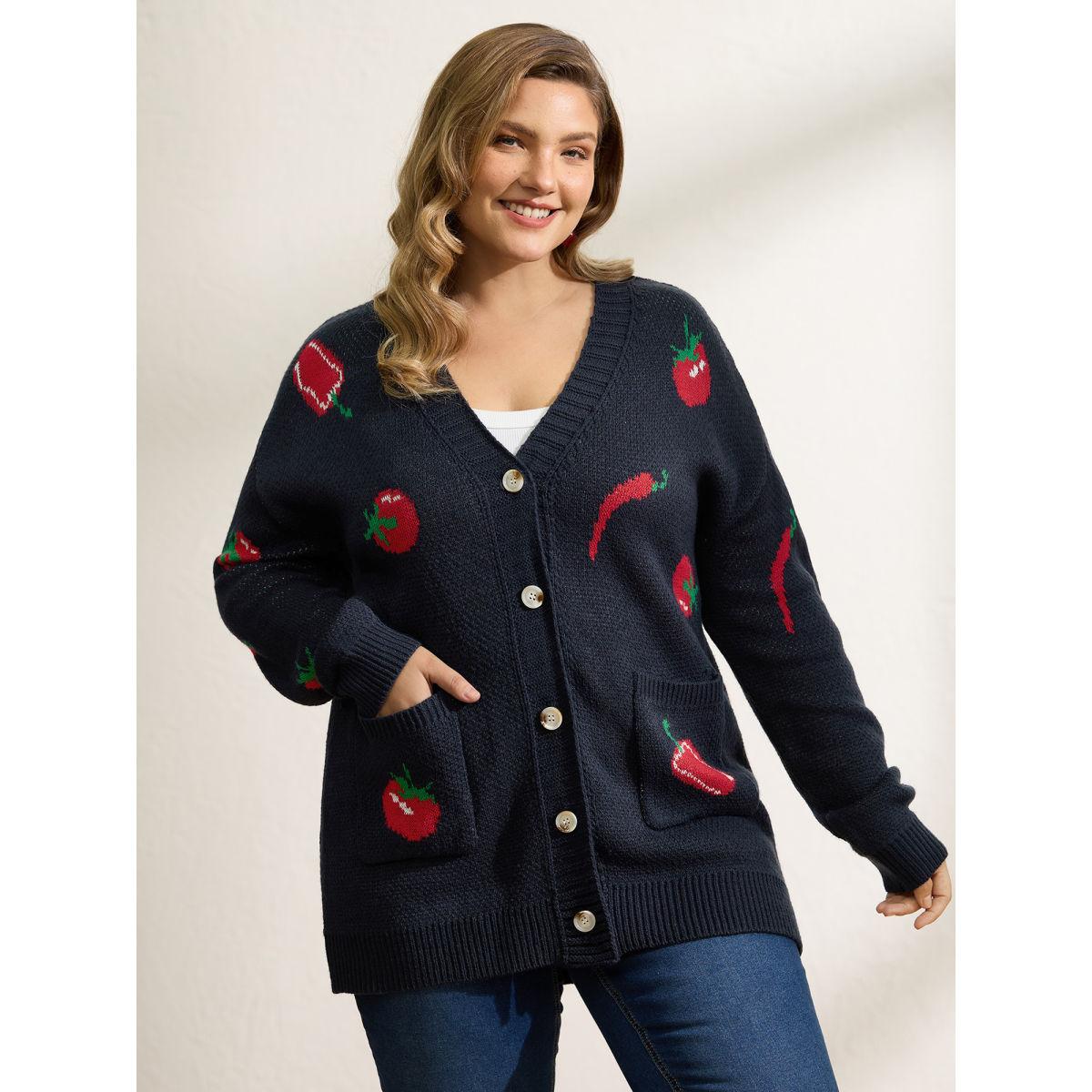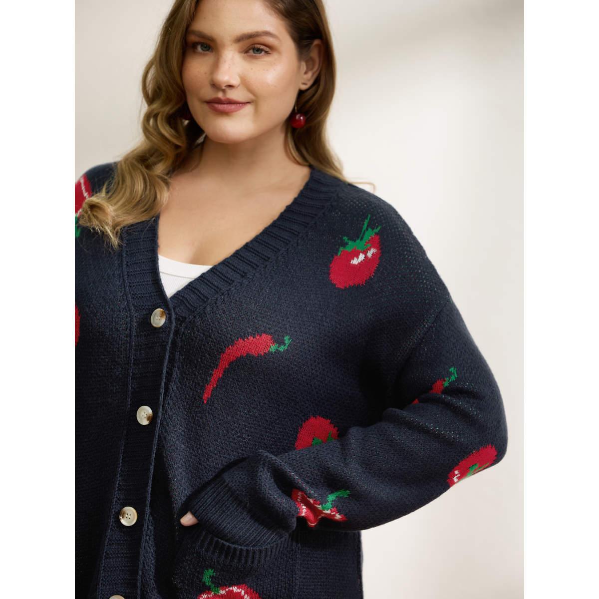 Plus Size Tomato Chili Print Button Knit Cardigan Midnight Women Playful Loose Long Sleeve Casual Cardigans BloomChic 10/M