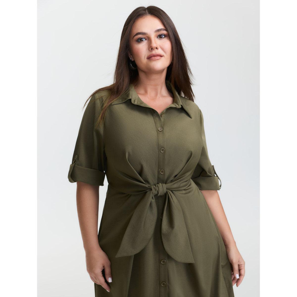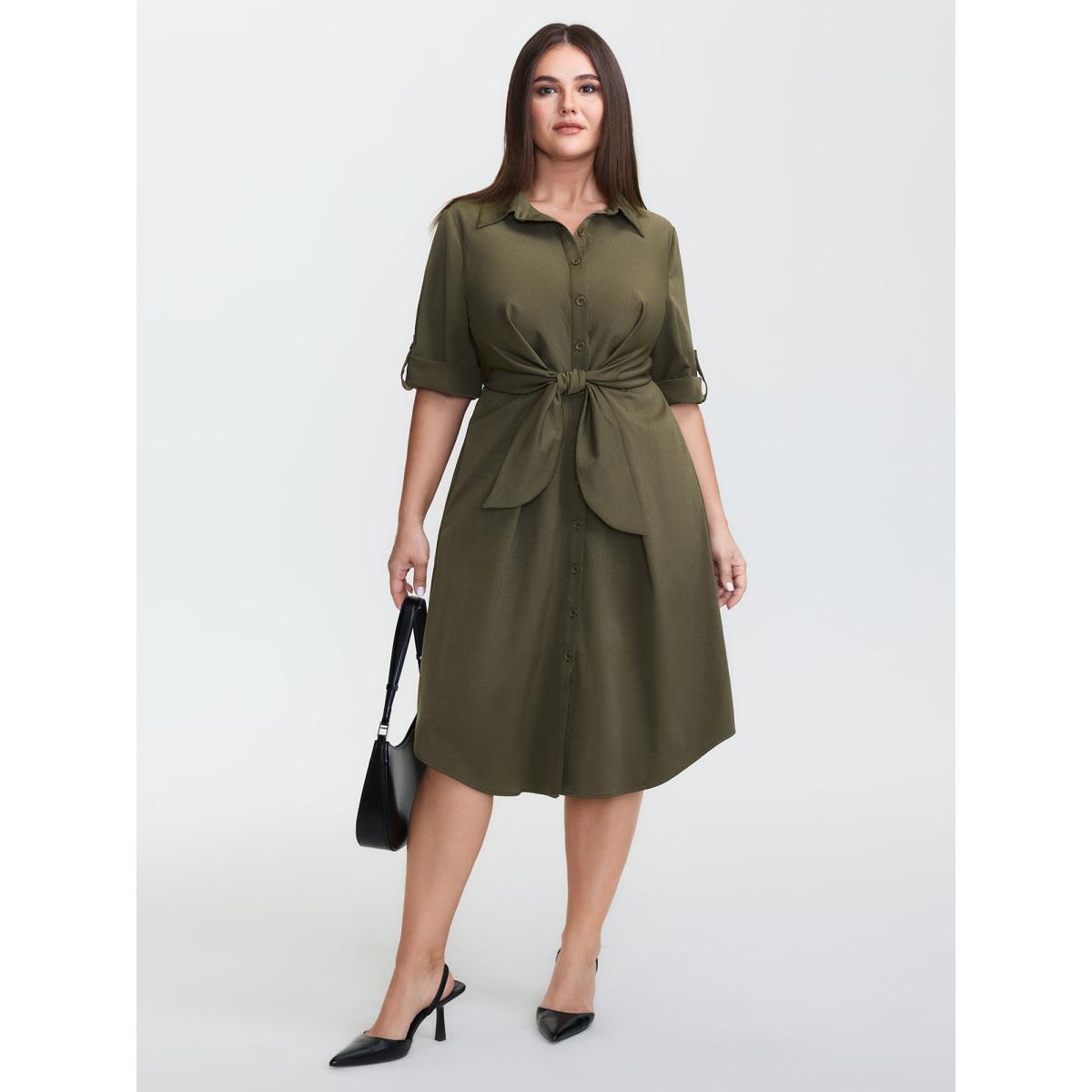 Plus Size Twist Knot Waist Button Midi Dress ArmyGreen Women Office Shirt collar Half Sleeve Curvy BloomChic 12/L