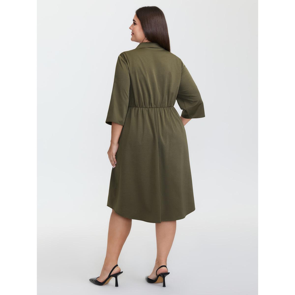 Plus Size Shirred Belted Pocket Shirt Collar Button Through Dress ArmyGreen Women Office Elastic cuffs Shirt collar Long Sleeve Curvy Midi Dress BloomChic 22-24/3X