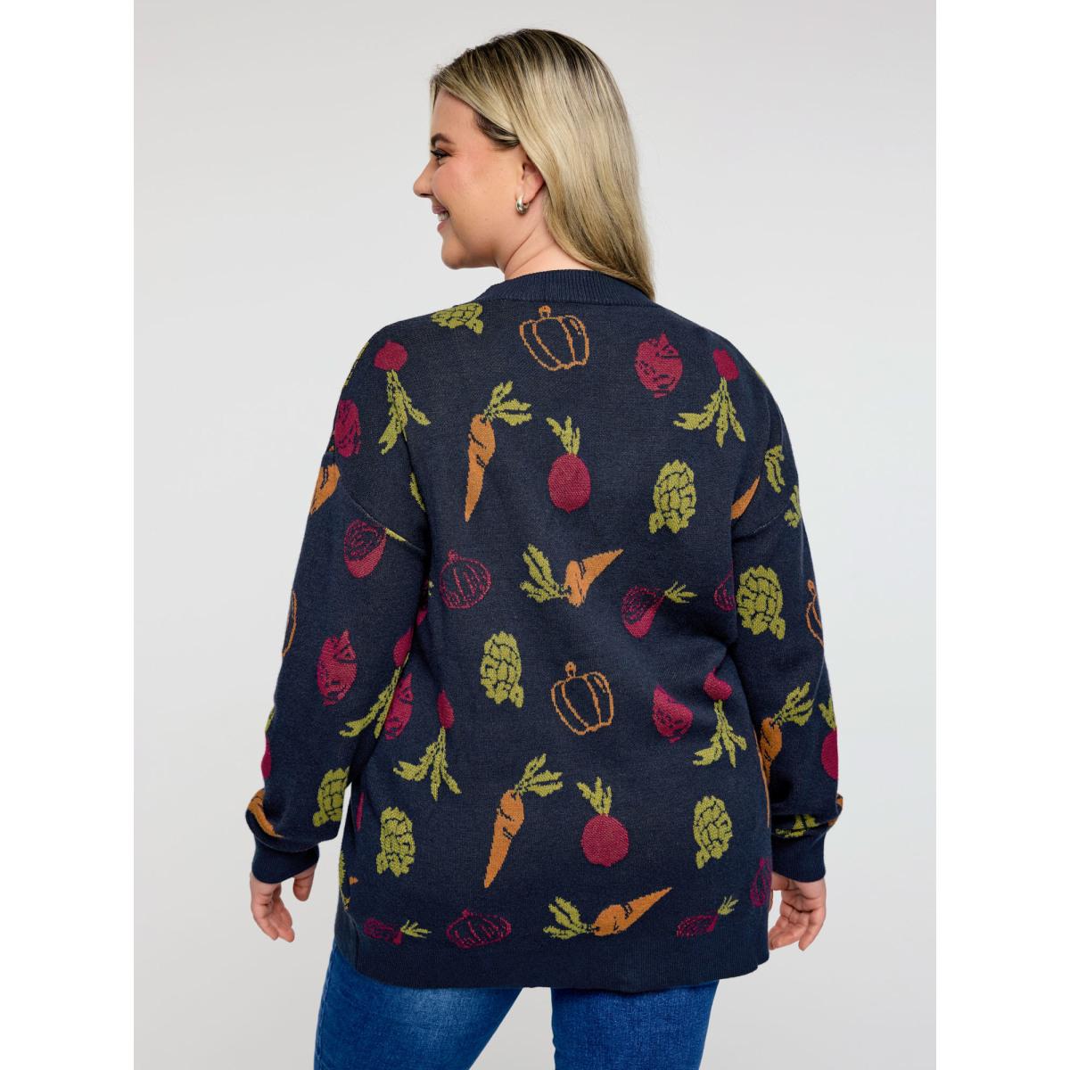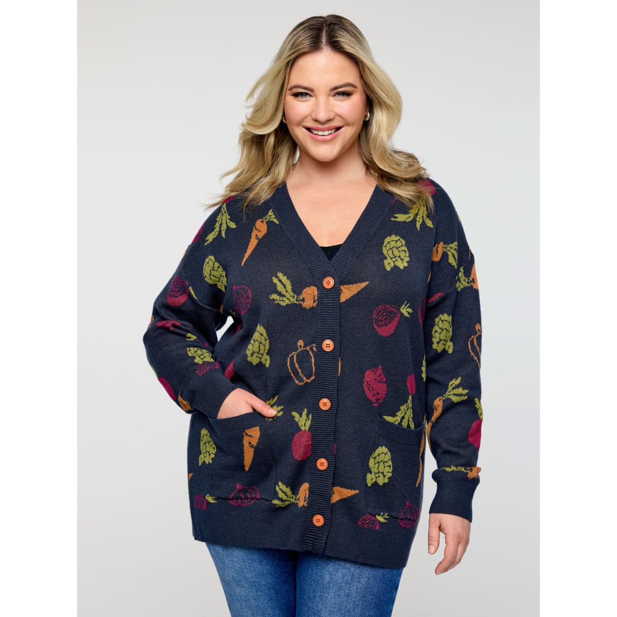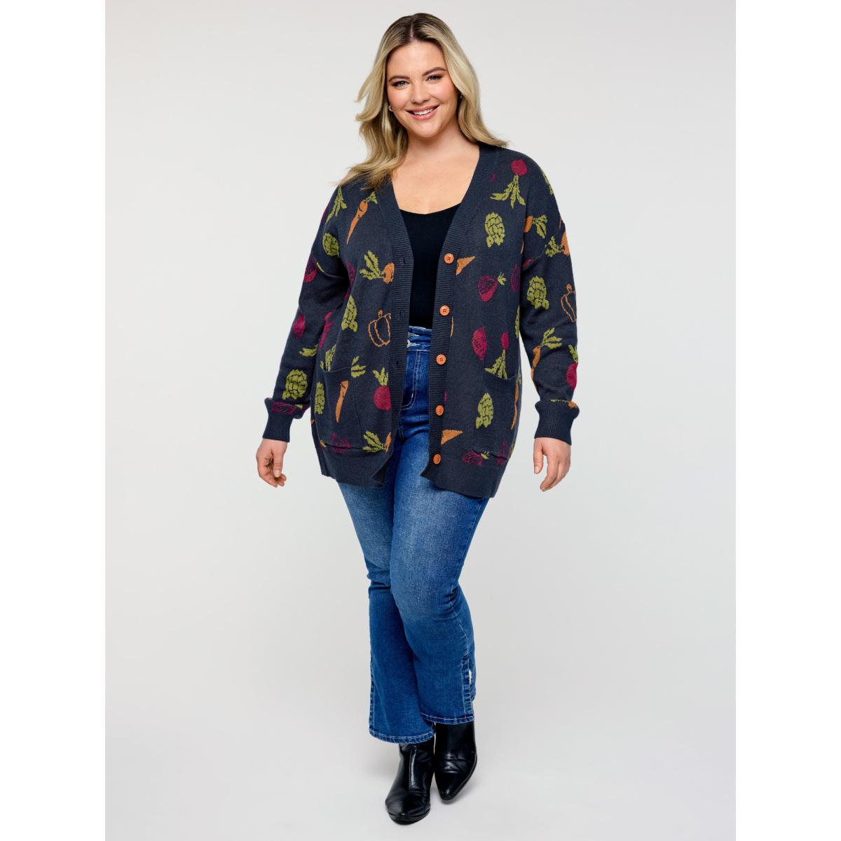 Plus Size Vegetable Print Buttons Colorful Knit Cardigan Midnight Women Playful Loose Long Sleeve Casual Cardigans BloomChic 14-16/1X