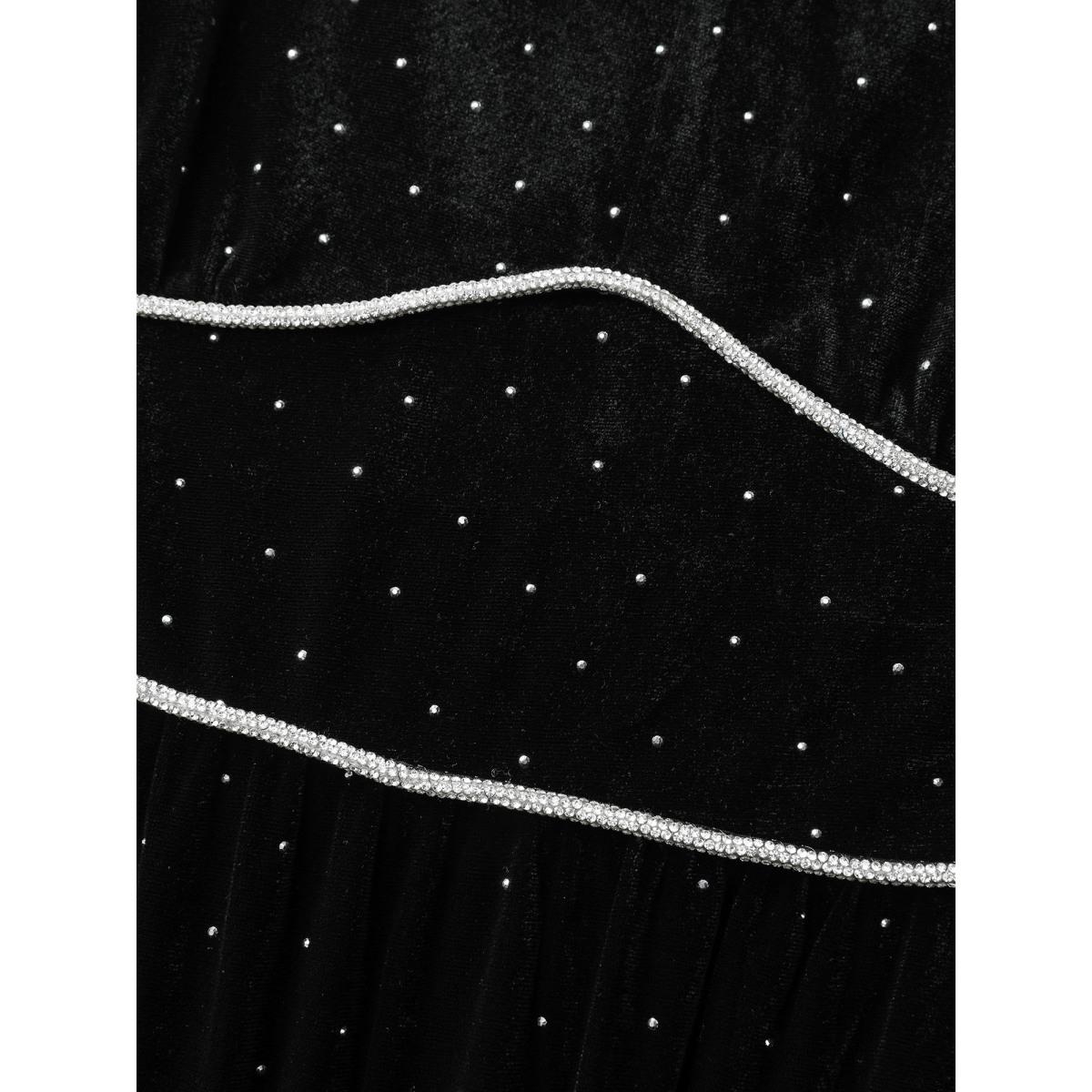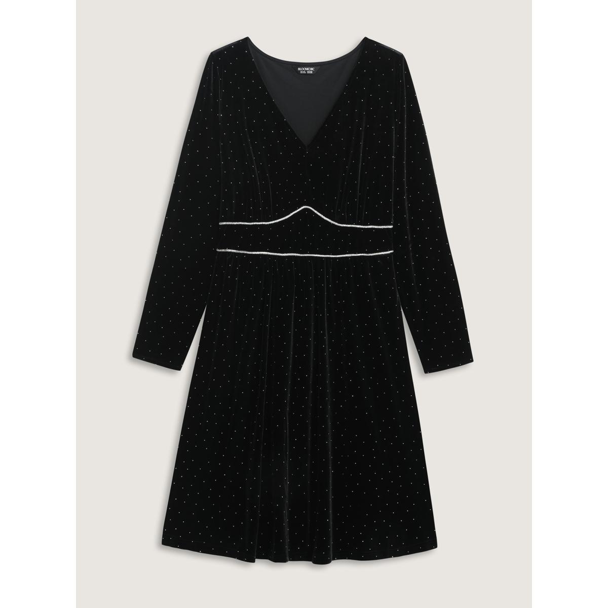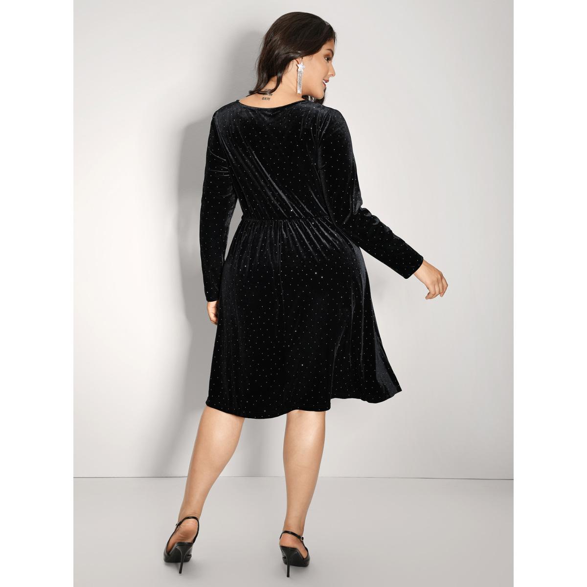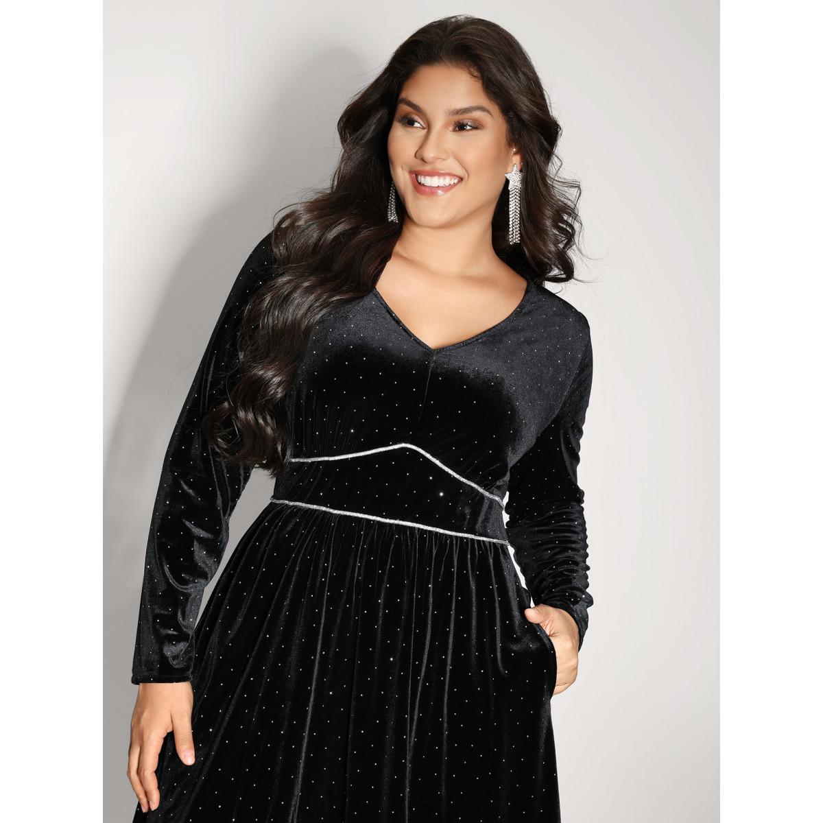 Plus Size Velvet Rhinestone Cinched-Waist Pockets Midi Dress Black Women Party&Cocktail Rhinestone detailing V-neck Long Sleeve Curvy BloomChic 30/6X