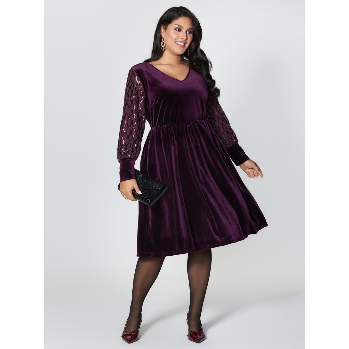 Plus Size Velvet Sequin Sheer Sleeve Midi Dress Deeppurplered Women Party&Cocktail V-neck Extra Long Sleeve Curvy BloomChic 10/M