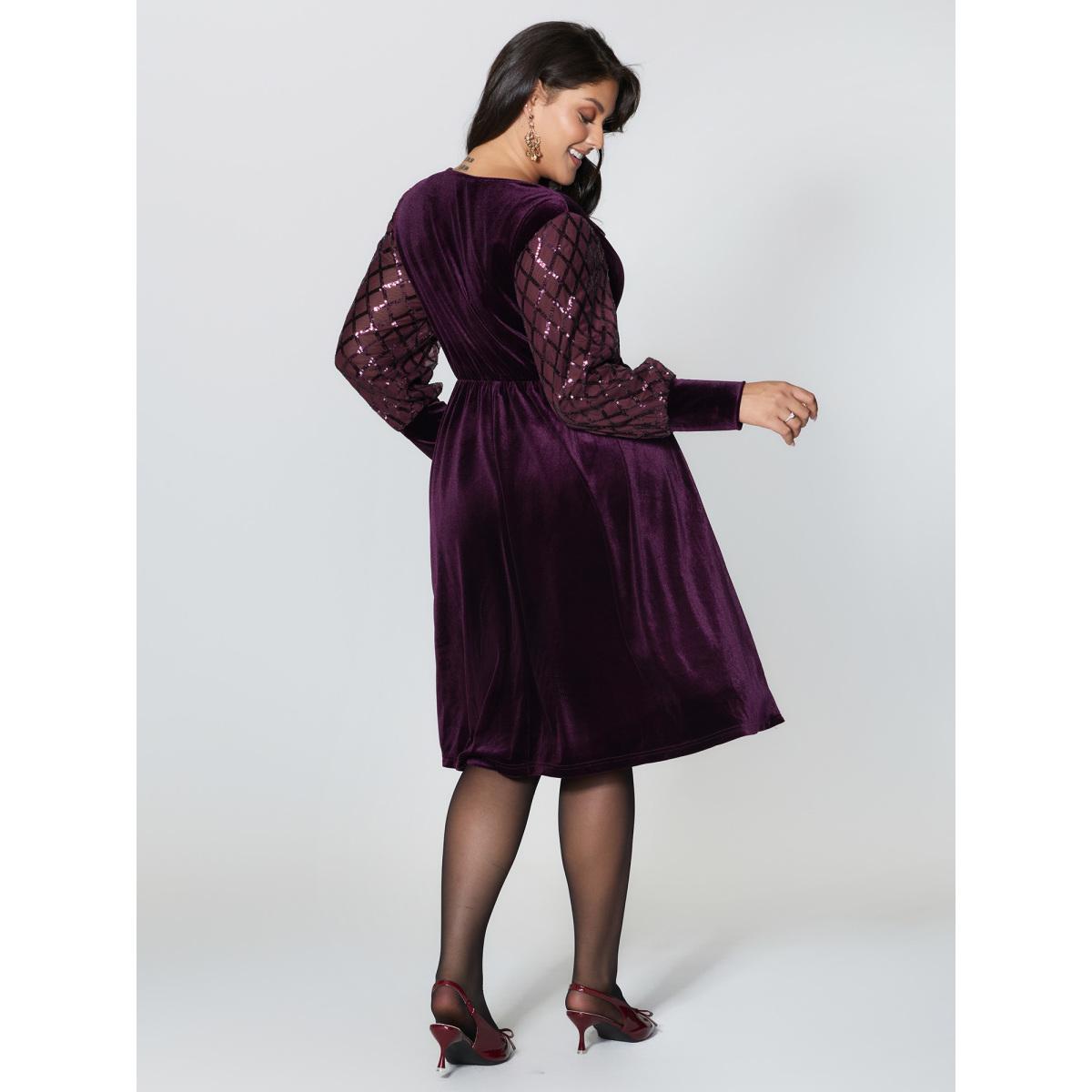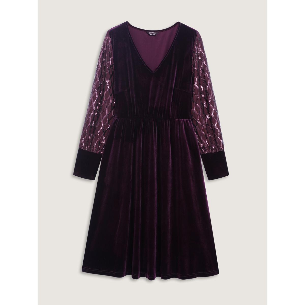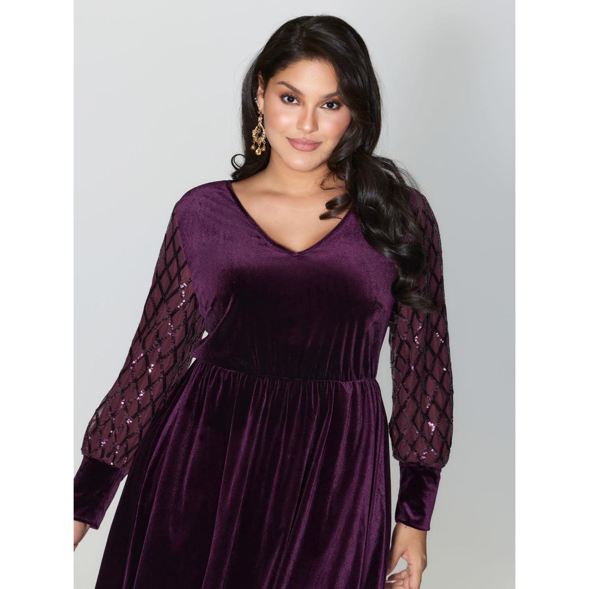 Plus Size Velvet Sequin Sheer Sleeve Midi Dress Deeppurplered Women Party&Cocktail V-neck Extra Long Sleeve Curvy BloomChic 10/M Product Image