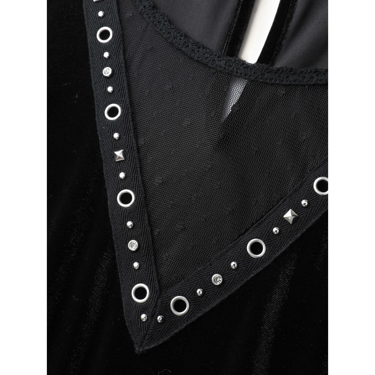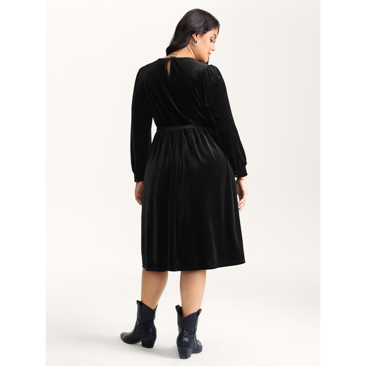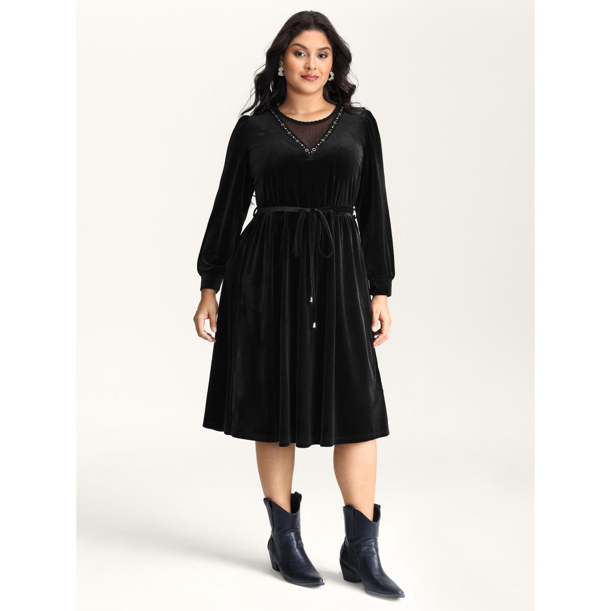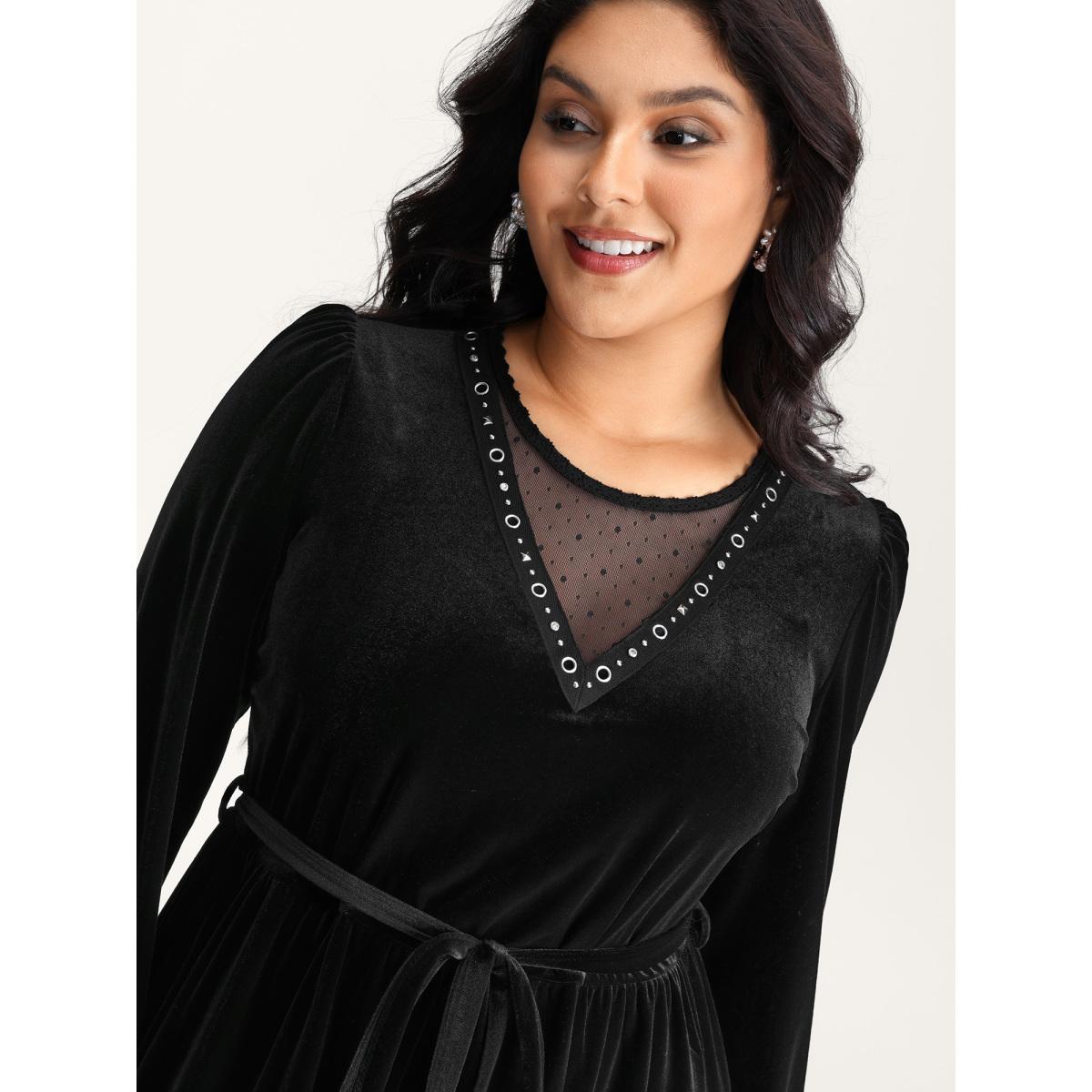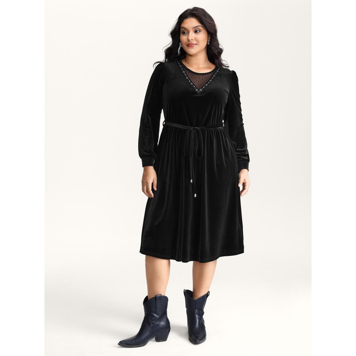 Plus Size Velvet Sheer Neckline Belted Waist Maxi Dress Black Women Boho Woven ribbon&lace trim Round Neck Extra Long Sleeve Curvy BloomChic 14-16/1X