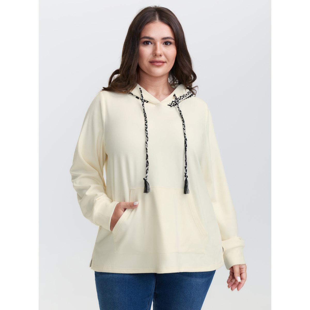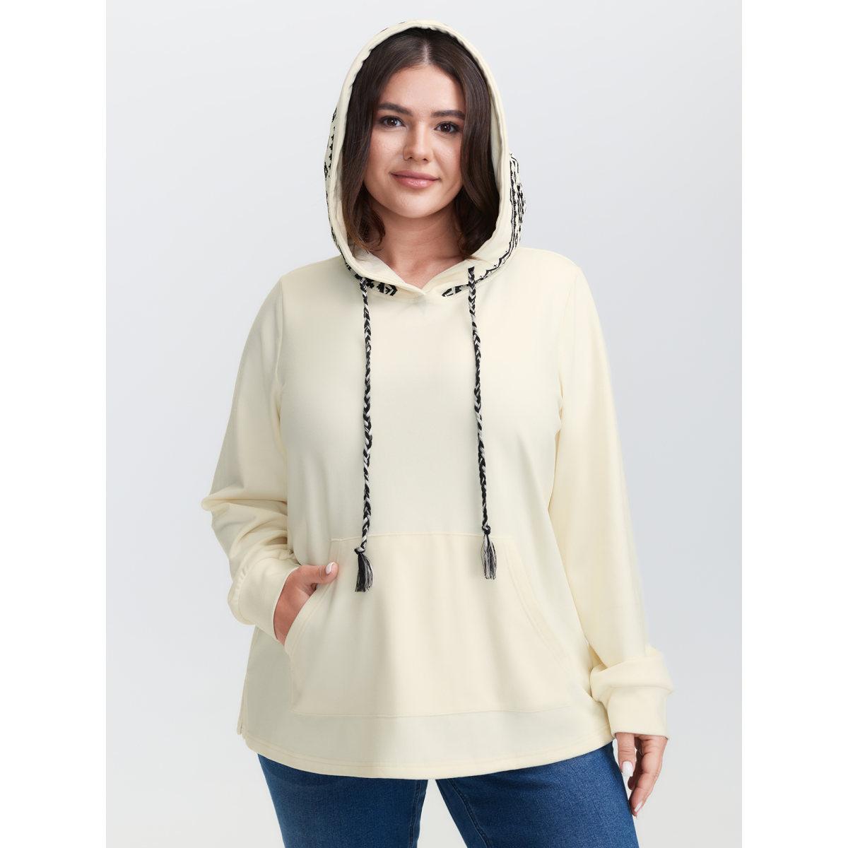 Plus Size Contrast Hooded Tassel Trim Knit Sweatshirt Women White Casual Tassels Hooded Everyday Sweatshirts BloomChic 12/L