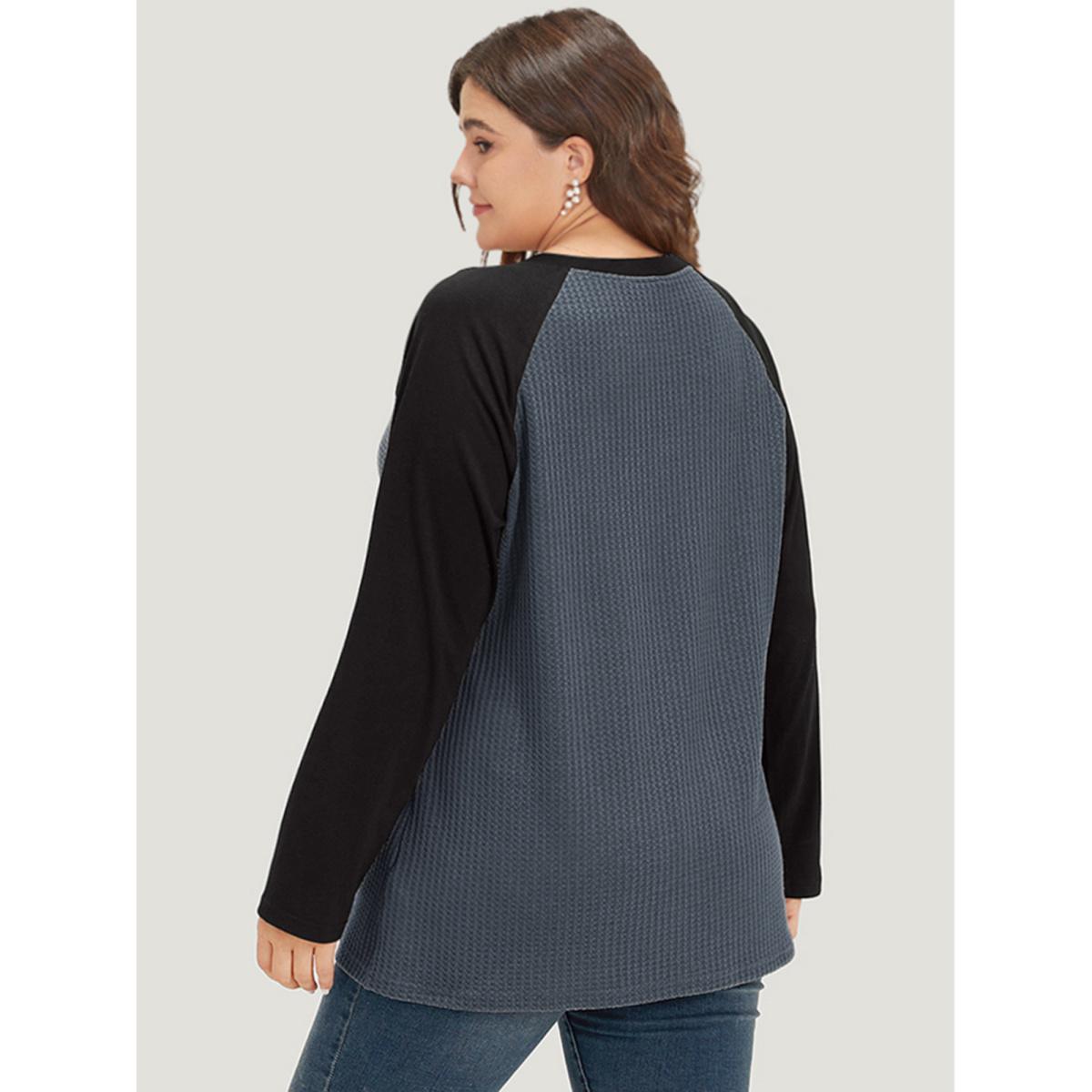 Plus Size Waffle Knit Raglan Sleeve Metal Buckle Detail T-shirt SlateGray Women Leisure Contrast Plain V-neck Casual T-shirts BloomChic 14-16/1X
