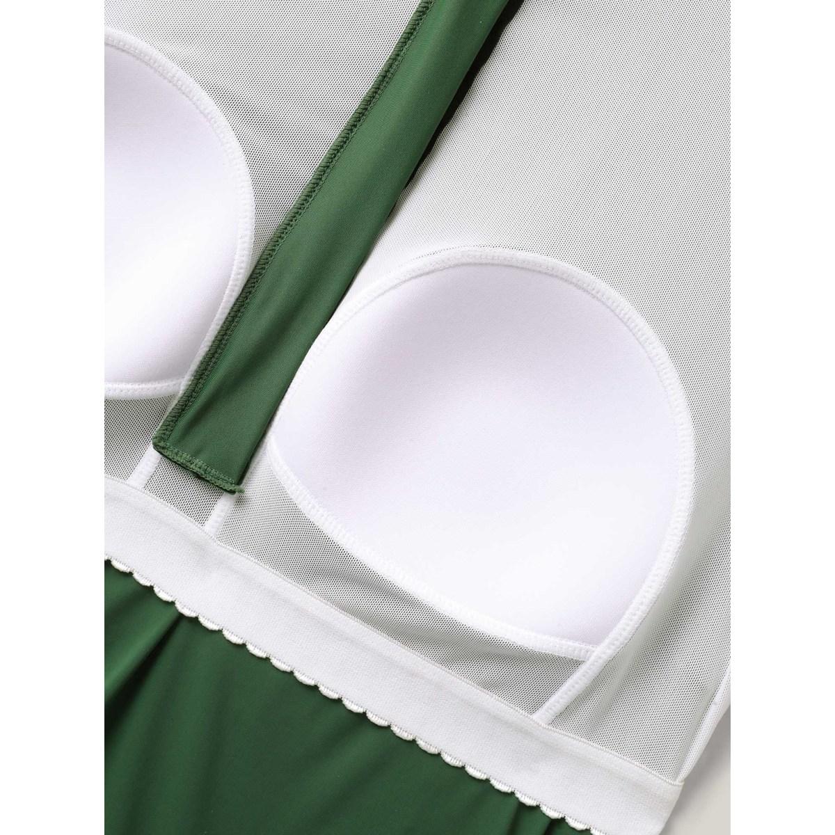 Plus Size Zipper Drawstring Detail Solid Swim Top Women's Swimwear ArmyGreen Beach High stretch Skinny Round Neck Curve Swim Tops BloomChic 18-20/2X