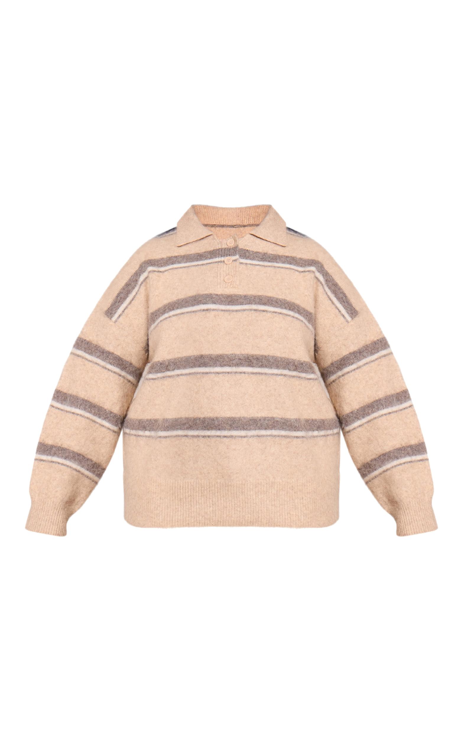 Master the art of effortless dressing with the plus taupe striped brushed knit oversized rugby style sweater, a knowing blend of comfort and street style. Its classic polo collar and subtle button placket offer a polished contrast to the relaxed, dropped-shoulder silhouette, while the distinct taupe and white stripes bring a Graphic yet understated appeal. Team this essential knitwear piece with tailored dark wash pants for an elevated day look, or style it with sleek ankle boots for an off-duty vibe that still makes a statement. Complete the ensemble with delicate gold jewelry to add a touch of understated polish, making a confident impact, any day of the week.Length approx 58.5cm/23inch (Based on sample size XL)Model wears size XLModel Height - 5ft 9inchp]:!mb-4inch>Brand: PrettyLittleThingCategory: KnitwearProduct type: Oversized SweaterColor: TaupeMaterial: Brushed KnitOccasion: Day