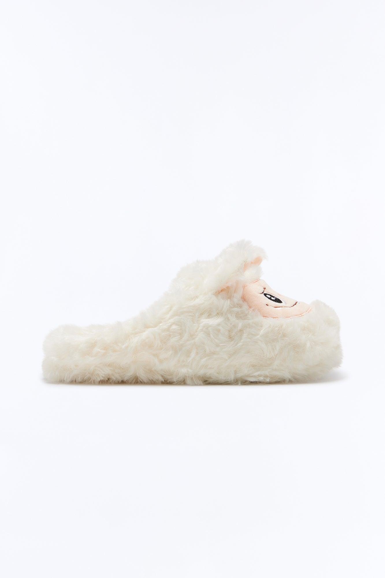 Available In Cream And Pink. Closed Toe Slippers Faux Fur Monster Face Print Ears 3D Applique Round Toe Flat Heel Imported California Proposition 65WARNING: Cancer and Reproductive Harm - www.P65Warnings.ca.gov.