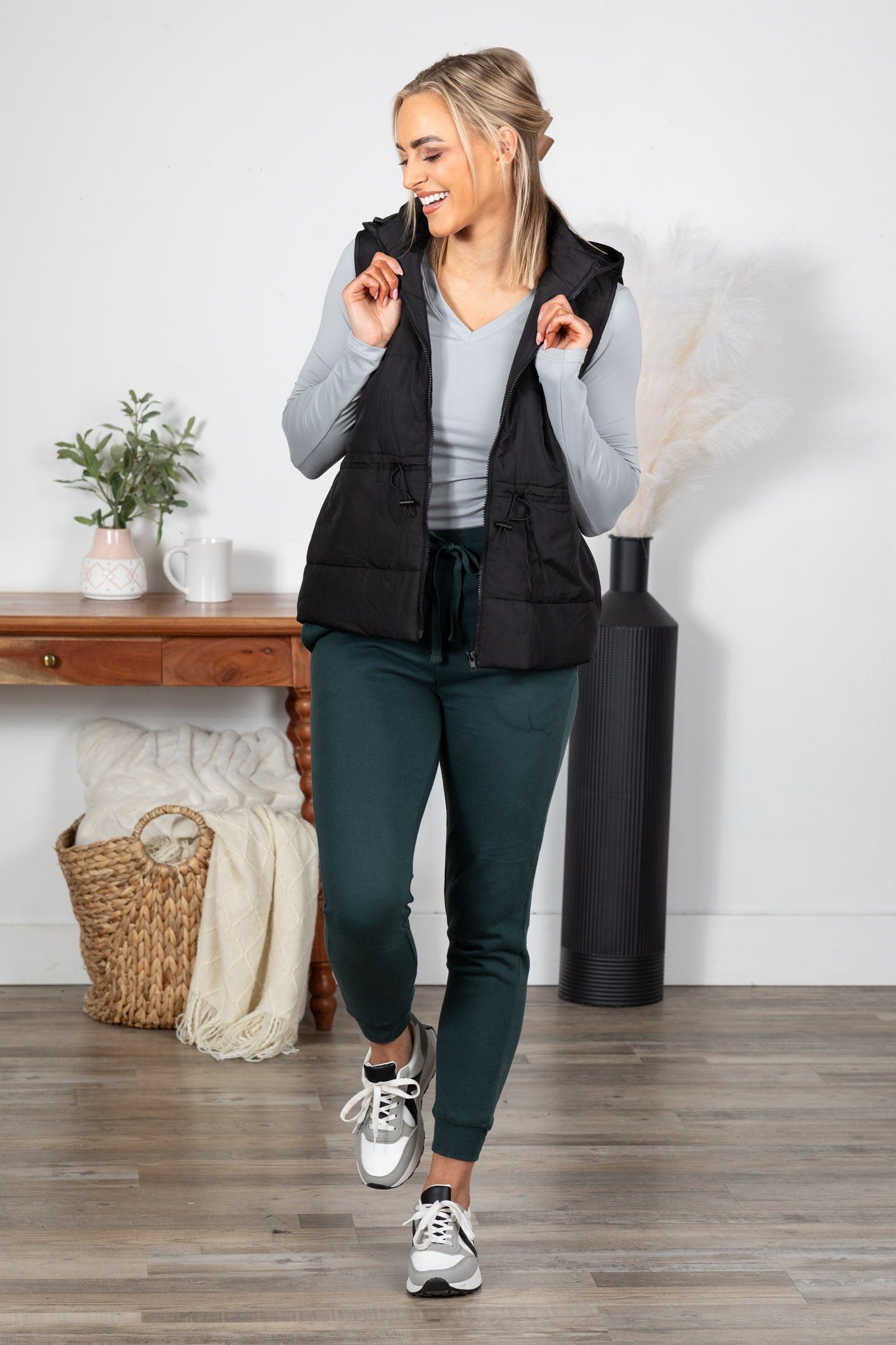 Product Details Colors: Black/ White Print: Solid Neckline: Zip Up With Detachable Hood Sleeve: Sleeveless Hemline: Straight Brand: Staccato Material and Care Self: 100% Polyester Lining: 100% Polyester Fill: 100% Polyester Hand Wash Cold Line Dry Size and Fit Small: Bust 38" Waist 40" Length 25" Medium: Bust 40" Waist 42" Length 25.5" Large: Bust 42" Waist 44" Length 26" X Large: Bust 44" Waist 46" Length 26.5" Model is 5'8 and is wearing a size small