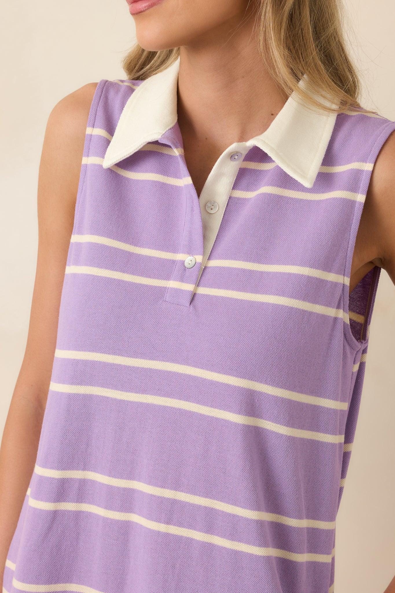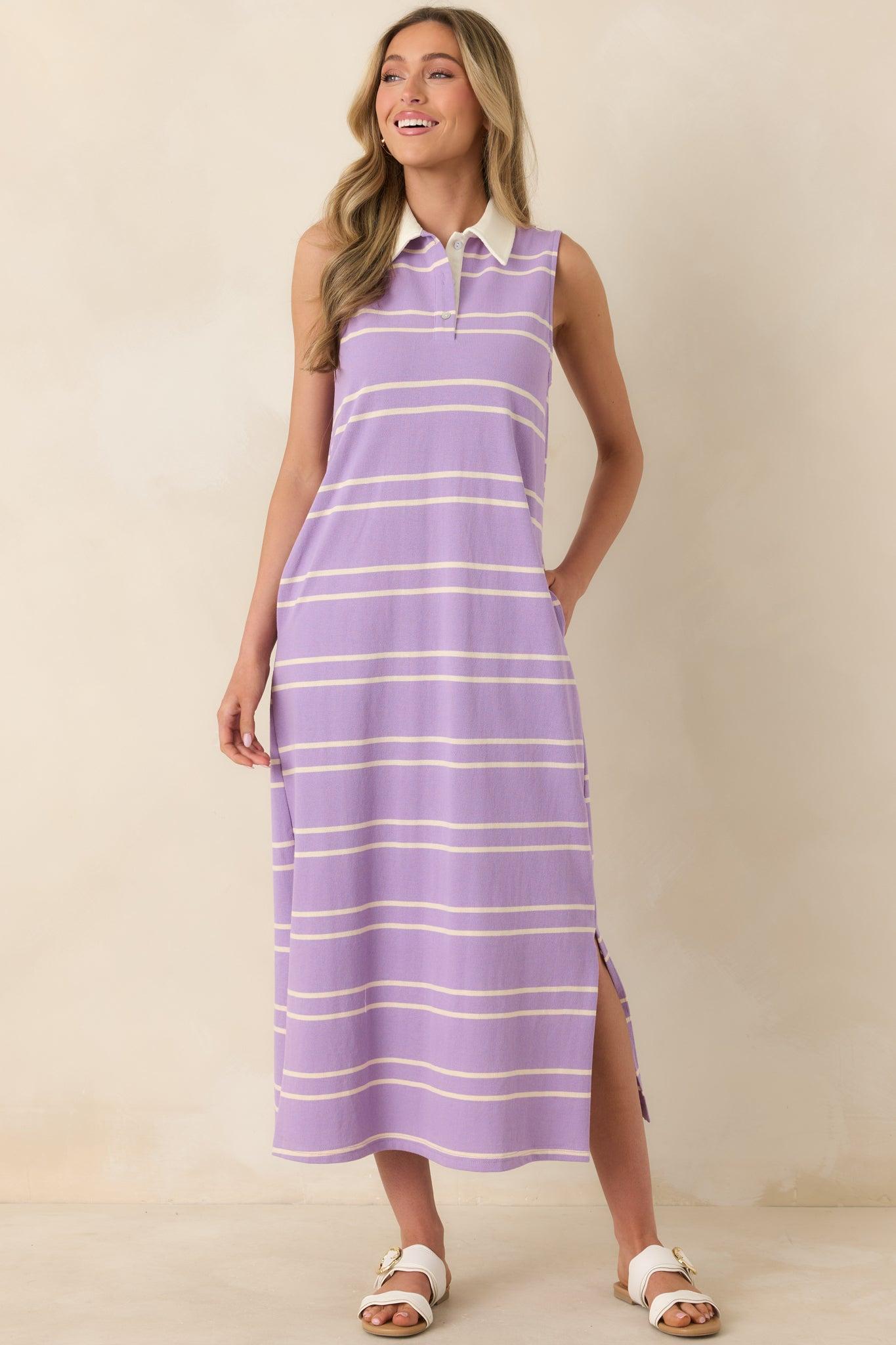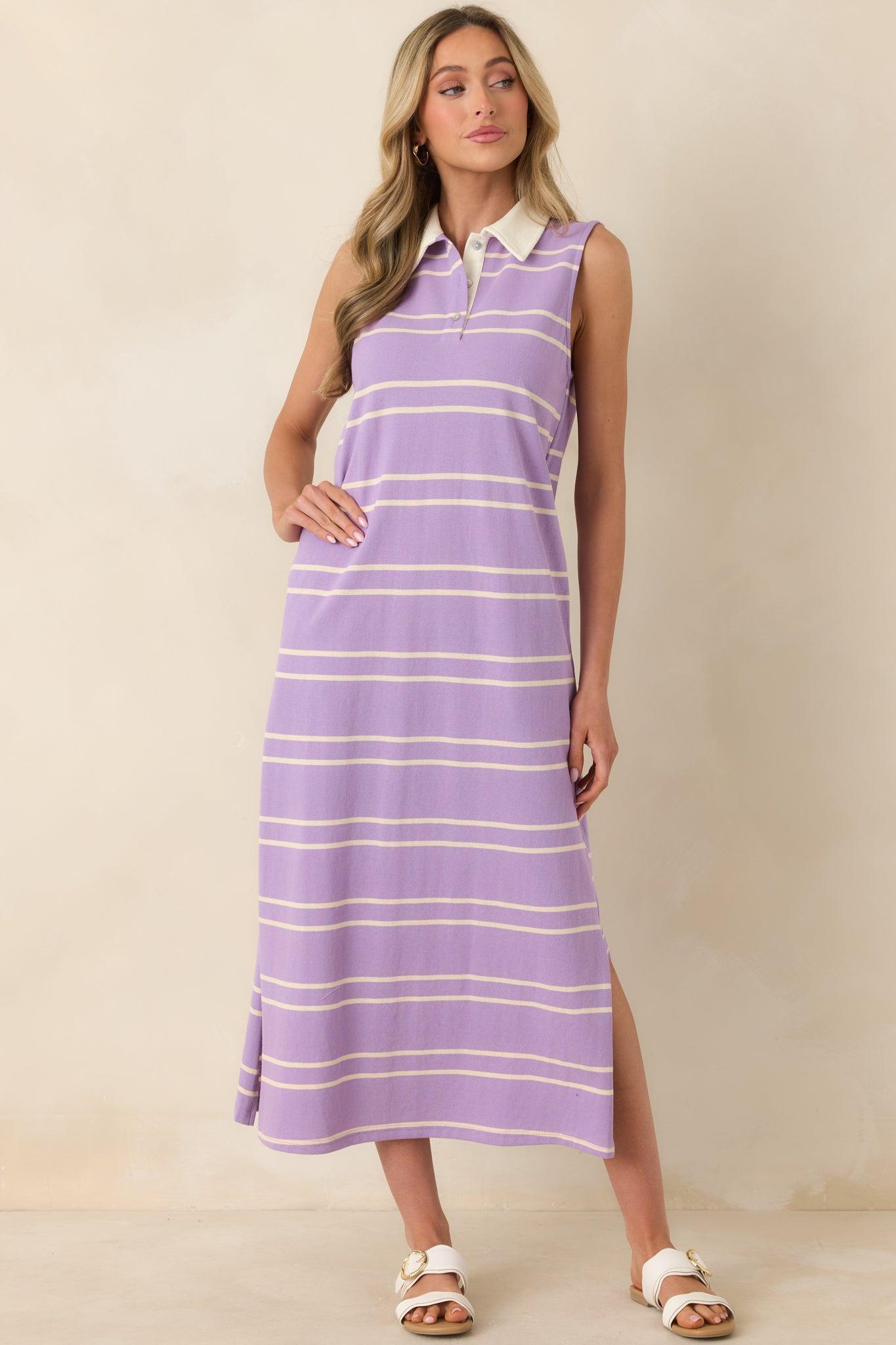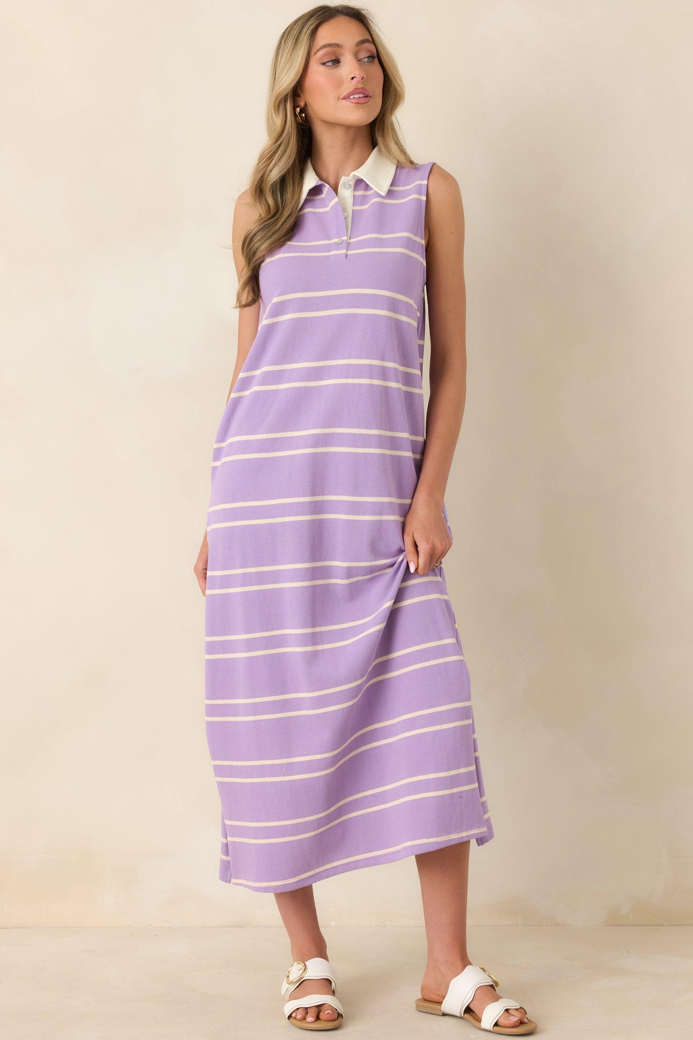 Polished Play Lavender Stripe Cotton Sleeveless Maxi Dress blends refined structure with easygoing comfort in the best way. Designed with soft lavender and neutral stripe detailing, this sleeveless silhouette features a contrasting structured collar and partial button placket for a clean, tailored touch. The straight, full-length fit creates a long, streamlined look while the breathable cotton fabrication keeps it light and wearable all day. It’s equal parts relaxed and put-together — perfect for weekend plans, casual office days, travel, or an elevated athleisure moment. Just add sneakers, sandals, or a sleek slide and let the stripes do the styling.This lavender striped maxi dress features a sleeveless silhouette, structured contrast collar, partial button-front closure, and a relaxed straight fit. Crafted from soft cotton fabric for breathable comfort and easy movement.100% Cotton Contrast: 85% Cotton & 15% PolyesterUnlined Hand Wash Cold Manufactured in China Designed in The USAModel is 5'8" and Wearing a Size Small, Clipped, Model is a True X-Small