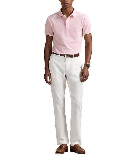 From Polo Ralph Lauren, this polo shirt features: Ribbed Polo collar with contrast tipping Concealed 3-button placket Genuine mother-of-pearl buttons Short sleeves Signature embroidered Pony on the left side of the chest Contrast tipping at the ribbed armbands Even vented hem Stretch mesh fabric Cotton/elastane Machine wash/tumble dry Imported.