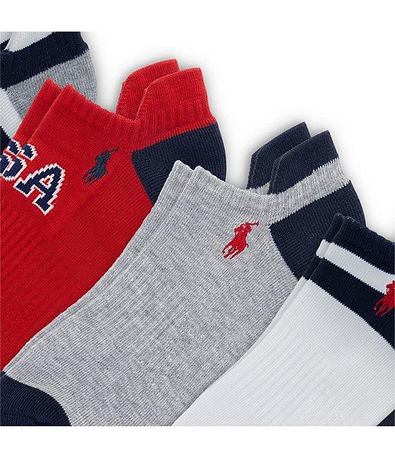 From Polo Ralph Lauren, this 6-pack of socks features: (6) pairs with various designs Embroidered "Polo" pony 144- needle count construction Moisture management 3x1 mock rib arch support Reinforced heel and toe One size fits men's shoe sizes 6-12.5 Recycled polyester/spandex (exclusive of decoration) Machine wash/tumble dry Imported.