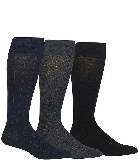 From Polo Ralph Lauren, these socks feature: custom-fit, over-the-calf ribbed dress socks feature a seamless toe and antimicrobial finish. assorted 3-pack includes one navy pinstriped pair, one charcoal dotted square pair and one black bias dotted pair One size fits men's shoe sizes 6-12.5 cotton/polyester/nylon/spandex machine wash Imported.