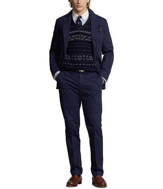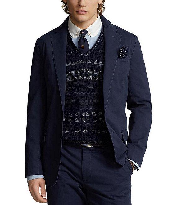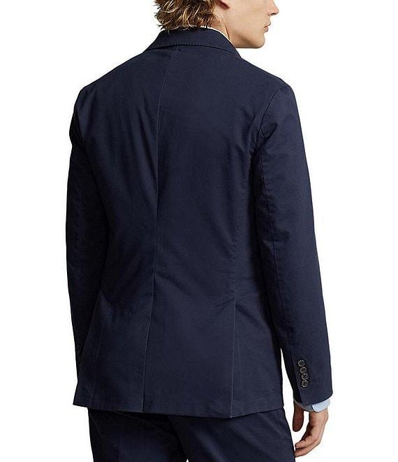 From Polo Ralph Lauren, this suit jacket features:Stretch chino that’s peached and washed for enhanced softnessTrim fit, with natural shoulders and high armholesNotch lapelsButtonhole at the left lapelTwo-button silhouetteCuffs with four decorative buttonsLeft chest welt pocketTwo front waist flapped pocketsTwo interior chest pocketsDouble ventLined at the back yoke and sleevesShell of cotton/elastane; back yoke lining of cotton; sleeve lining of viscoseMachine washable or dry cleanImported.