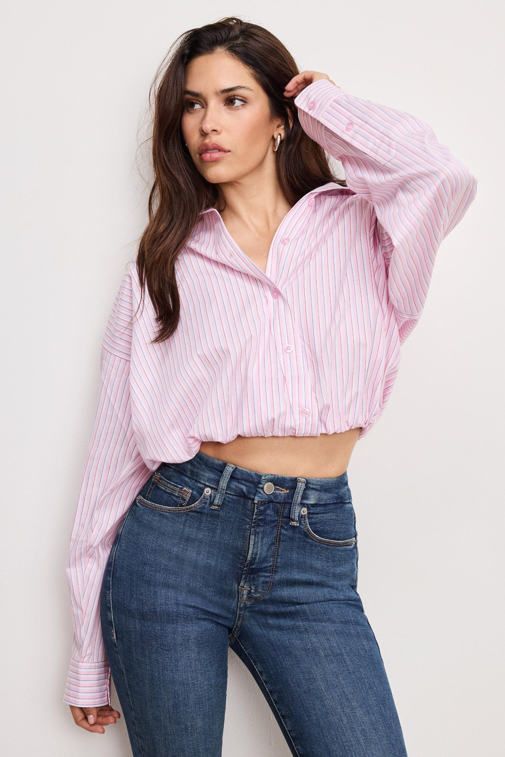 The Poplin Bubble Shirt is soft and light with a playful twist. Its voluminous shape and bold texture bring effortless attitude to any look, adding a touch of energy without trying too hard. - Collared neckline - Button-up closures at front - Elastic waistband - Long sleeves Model size is 5'8 and wearing size S Fabric: 97% Cotton, 3% Spandex Care: Hand wash cold. Hang dry or dry clean.