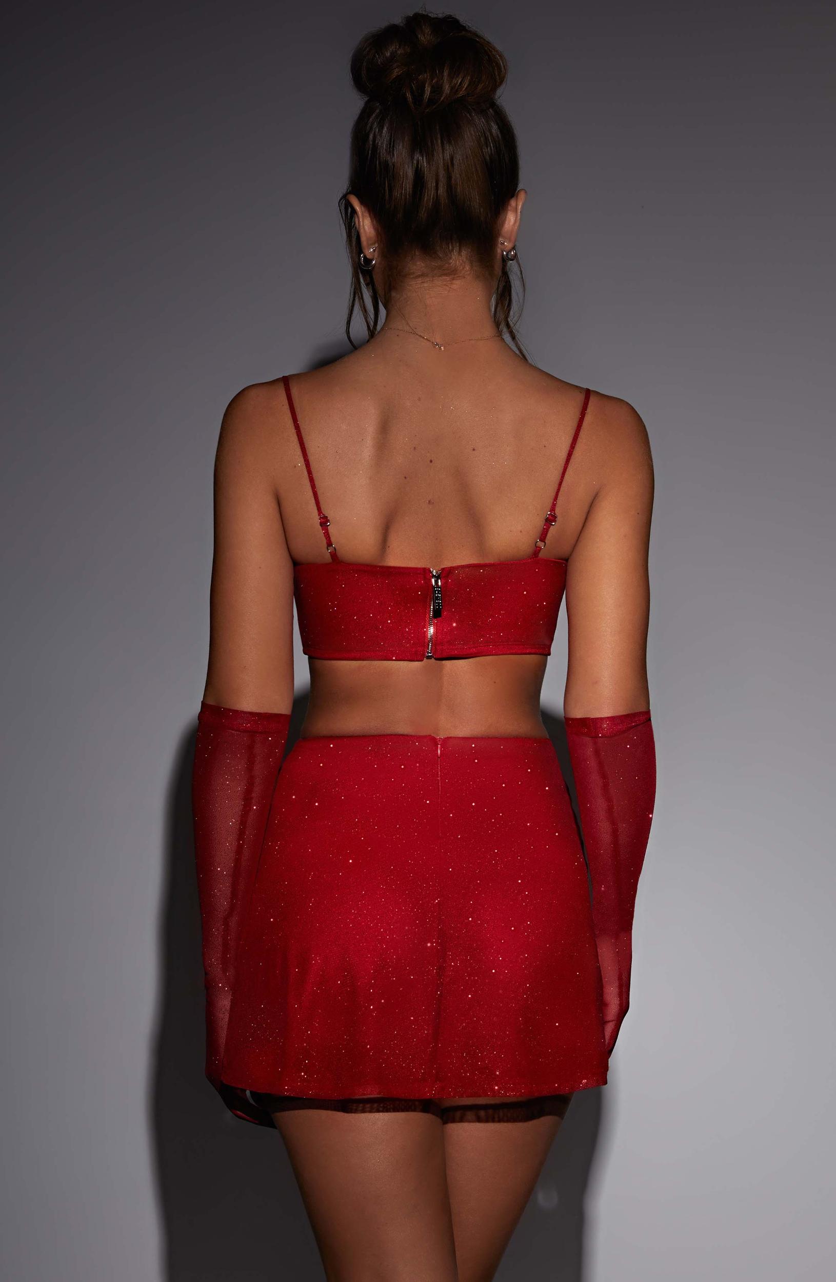 Sparkle into the night wearing the show stopping Posie mini, a skirt cut from our special custom mesh with all-over sparkle detail. The fit skims over your figure, flaring ever so slightly at the skirt with a small split for just the right amount of leg. Style with the Posie crop, Pixie elbow gloves and your highest heels. Colour: Red Sparkle. Soft sparkle mesh with stretch. High waisted. Body hugging fit that skims the figure. Leg split. Mini length. Pixie gloves sold separately Model is a size XS and is wearing an XS
