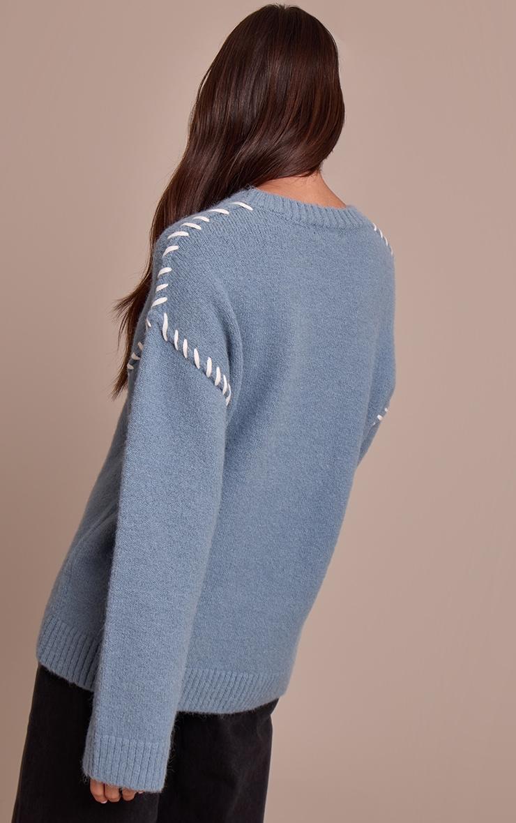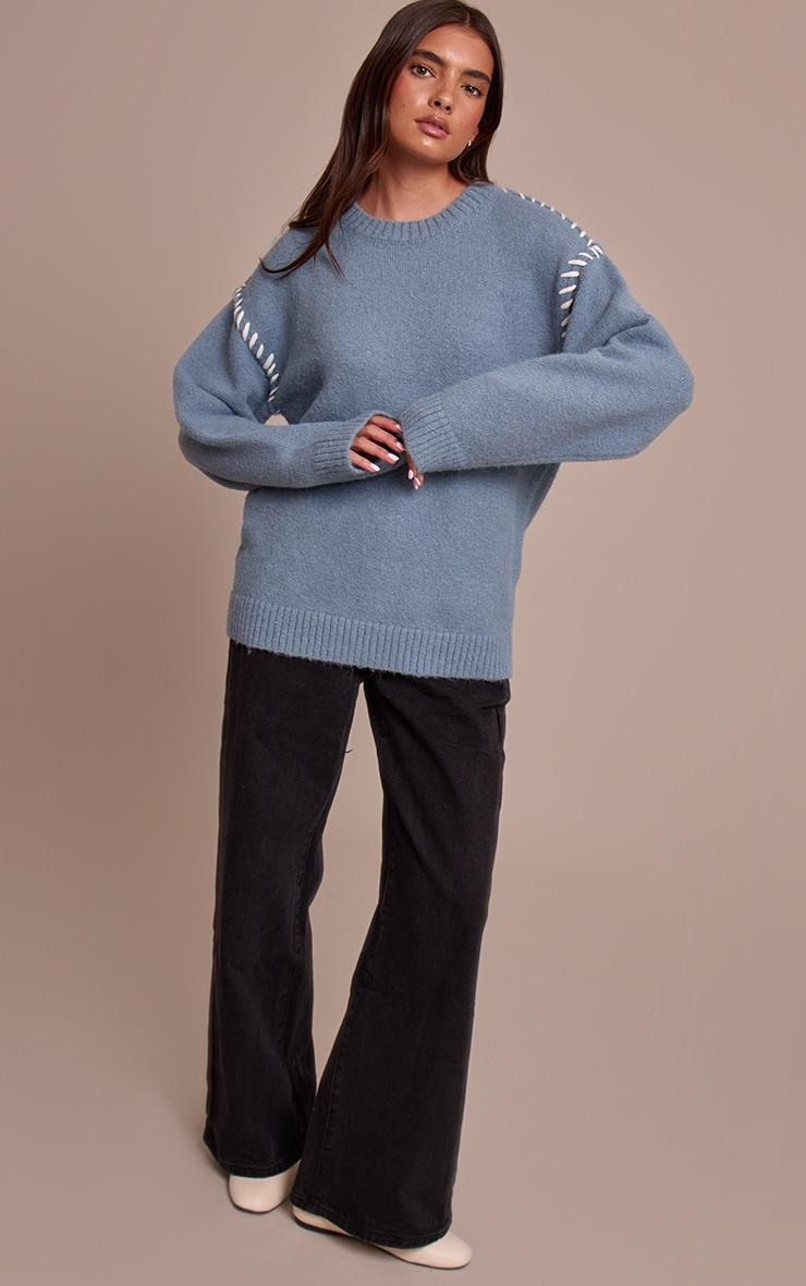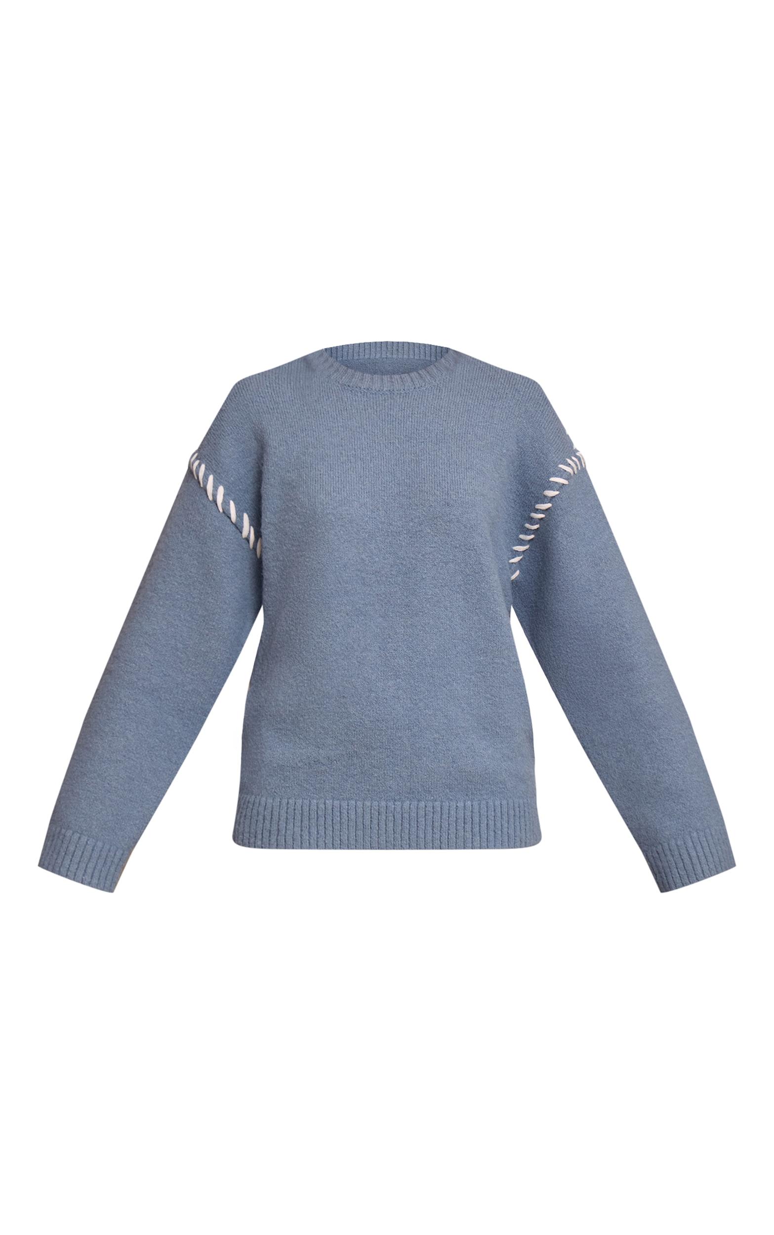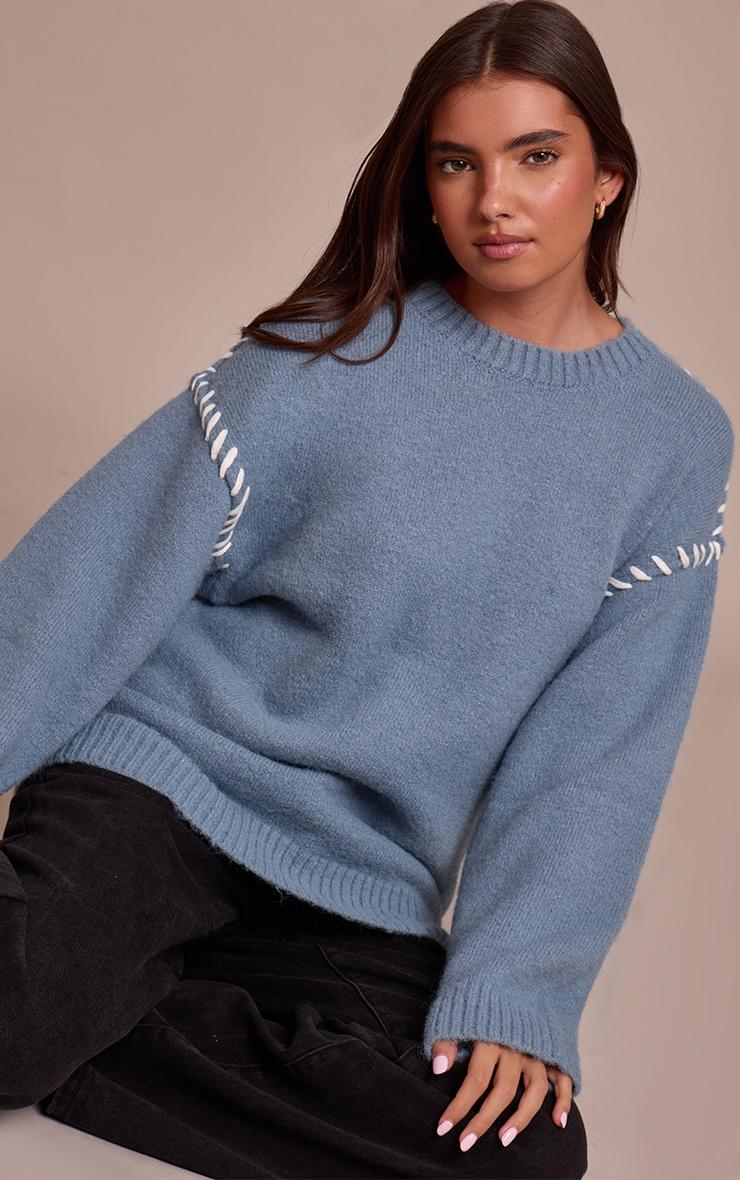Subtle statements define your daywear edit with this season's essential knit. The powder blue blanket stitch knit sweater presents an artfully relaxed silhouette, featuring a classic crew neckline and dropped shoulders accented by distinct white blanket stitch detailing along the sleeves. Its oversized shape and ribbed cuffs offer effortless comfort, ideal for daywear. Pair this confident piece with sleek dark wash jeans or tailored black pants, finishing the look with some chic knee high boots for an elevated aesthetic. Complete your ensemble with minimal gold earrings to perfectly balance the soft hue and impactful stitching.Length approx 48.5cm/19inch (Based on sample size S)Model wears size SModel Height - 5ft 7inchp]:!mb-4inch>Category: KnitwearProduct type: Oversized SweaterColor: Powder BlueMaterial: KnitOccasion: Day