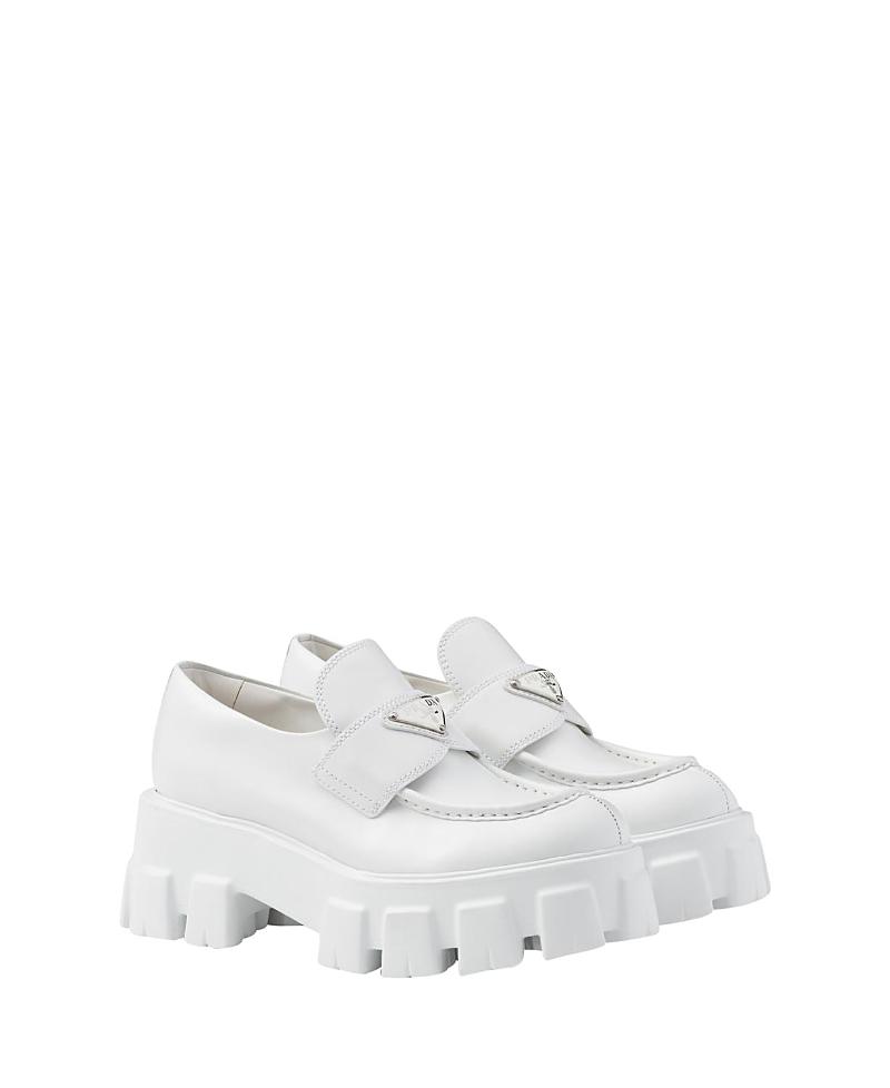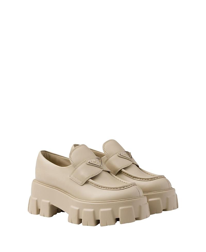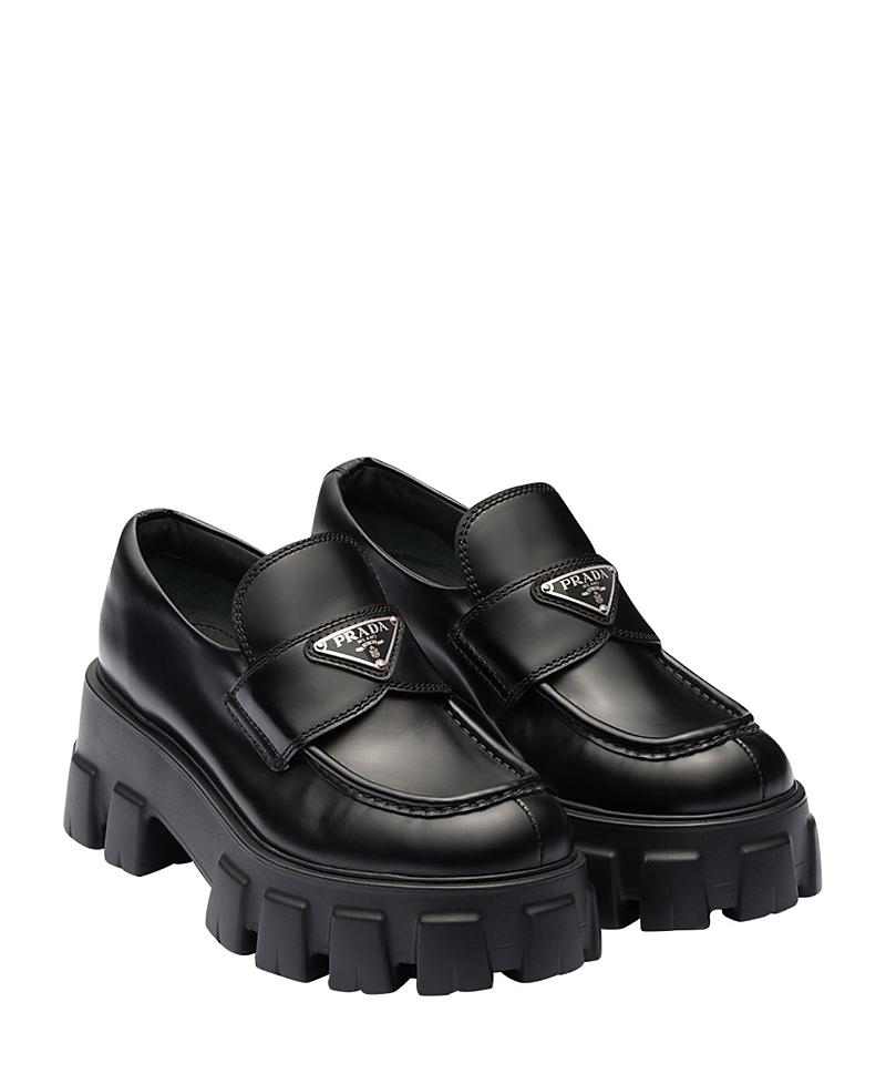 The Monolith loafers made of Pradas iconic and elegant brushed leather reinterpret the classic penny loafer in an original and contemporary way. This shoe, which takes its name from the chunky rubber sole, is an expression of timeless design that is monolithic and unique for its research, innovation, and style. Upper with leather band and metal triangle logo Apron with stitched raised edge Leather lining 55 mm / 2.1 expanded rubber lug sole Removable leather-covered insole Imported. Lsd Rtw - Prada Rtw > Prada > Saks Fifth Avenue > Barneys. Prada. Color: Black. Size: 5.