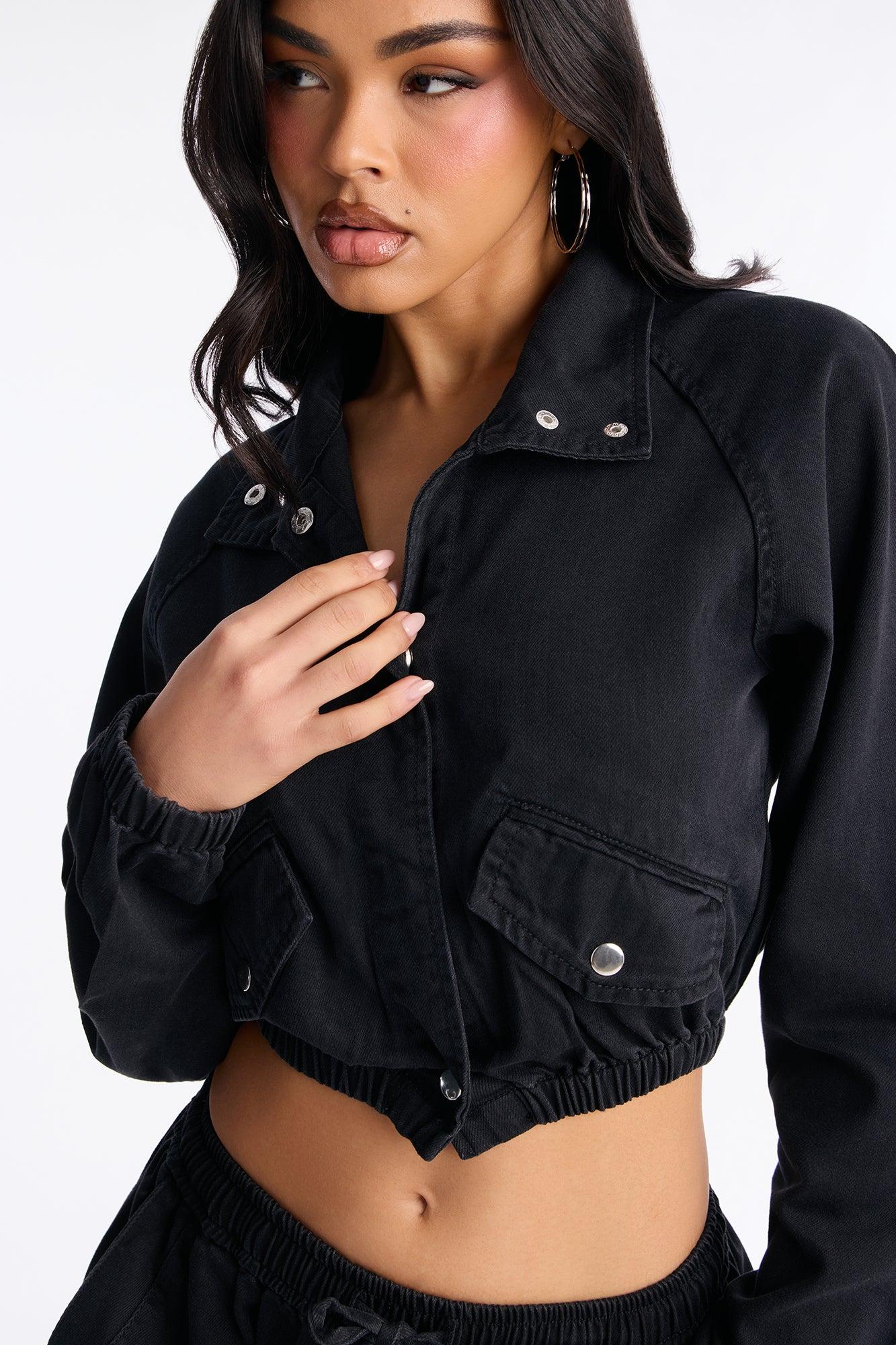 Premium Drapey Moto Denim Bomber Jacket - Black Wash Female