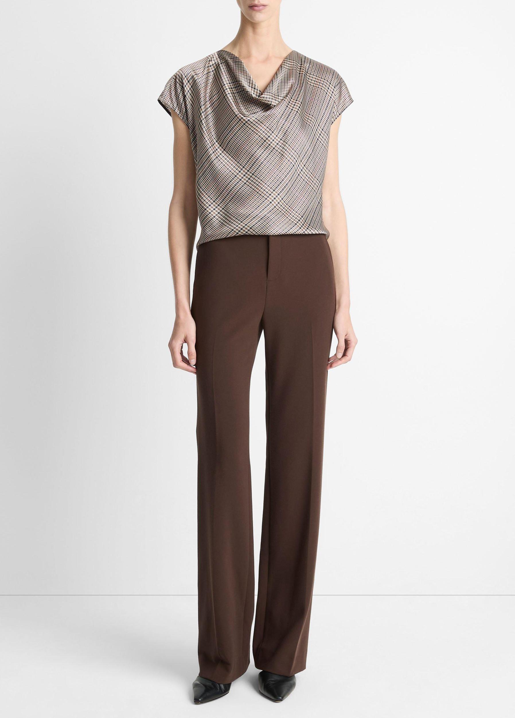 Pressed Plaid Silk Cowl-Neck Blouse