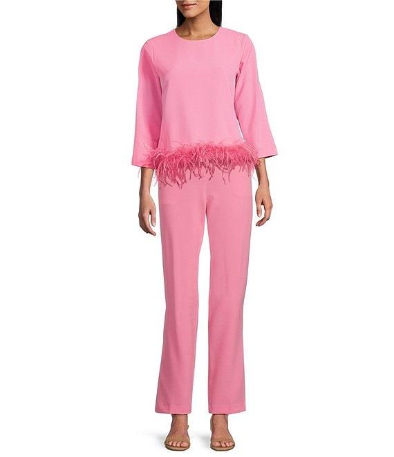 From Preston & York, this blouse features: Stretch crepe fabrication Round neckline Long sleeve Feather details Center back invisible zipper and hook & eye closure Approx. 20.75" length HPS Shell: polyester, elastane. combo 100% feather fiber content Polyester, elastane lining Spot clean Imported. Dillard's Exclusive.