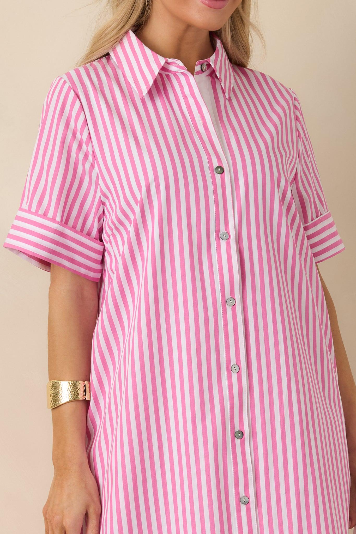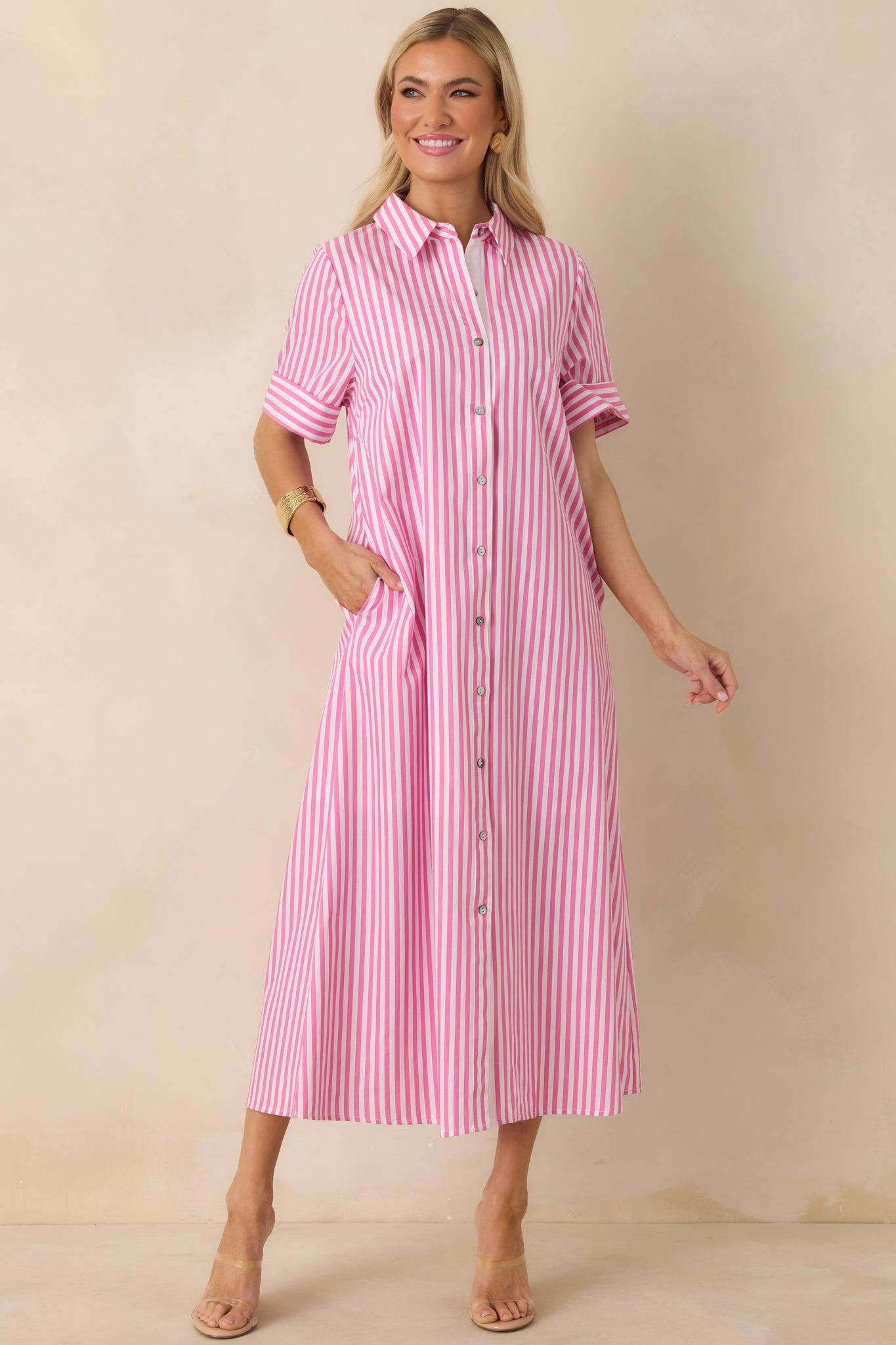 Pretty in Pinstripes Pink Cotton Stripe Button Front Maxi Shirt Dress is the kind of dress that instantly makes getting dressed feel easy. The crisp pink-and-white stripe brings a fresh, polished look while the tailored details keep it timeless and wearable. Whether you’re heading to brunch, the office, or a spring event, this is a style that always feels put-together without trying too hard. This pink and white striped shirt dress features a classic collared neckline with a full button-front closure. Designed with short cuffed sleeves, a relaxed A-line silhouette, and a center back pleat for added ease and movement. Finished with a maxi-length hemline for a clean, versatile fit that works season after season. 100% Cotton Lined Hand Wash Cold Manufactured in China Designed in The USA Model is 5'6" and Wearing a Size Small, Clipped, Model is a True X-Small