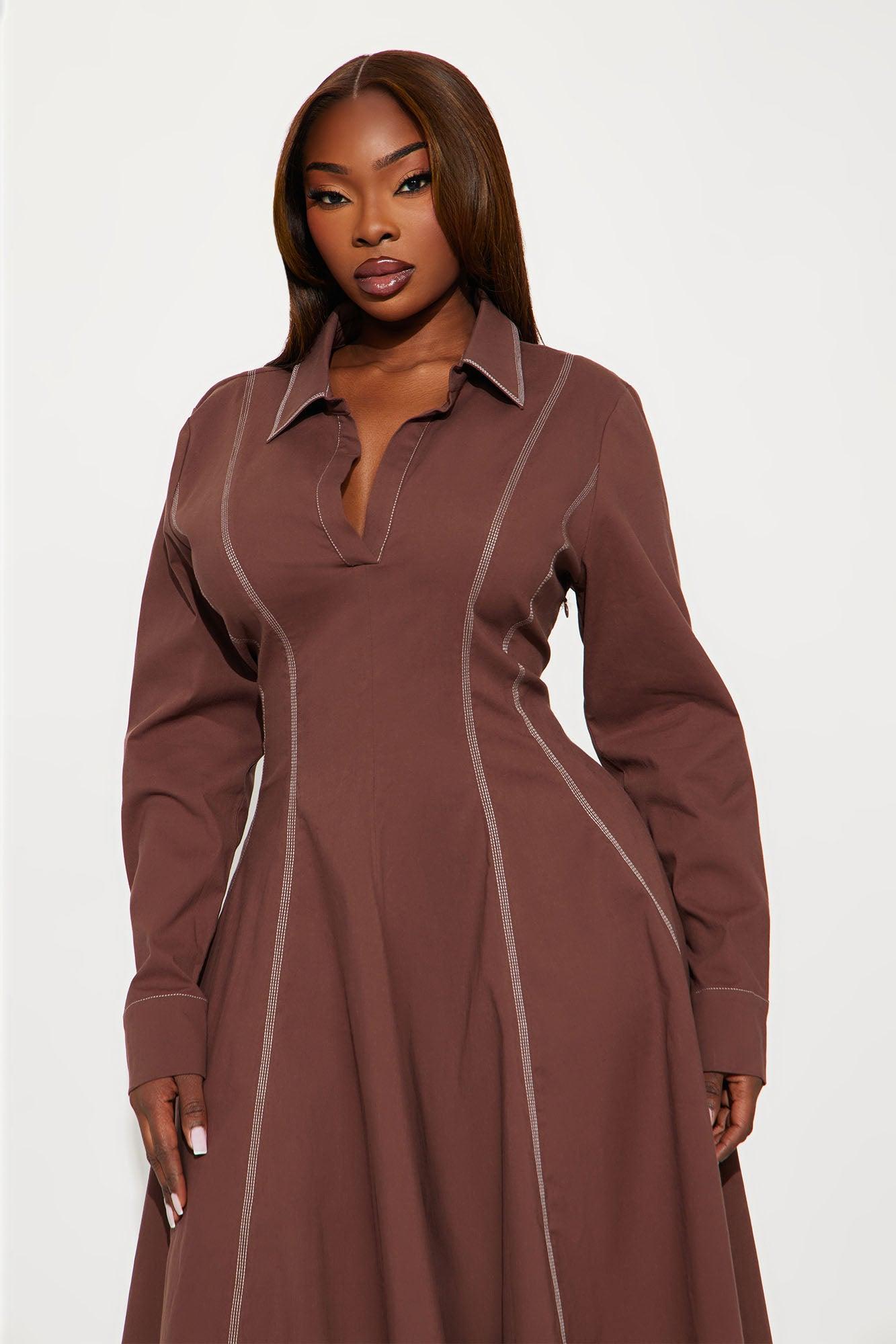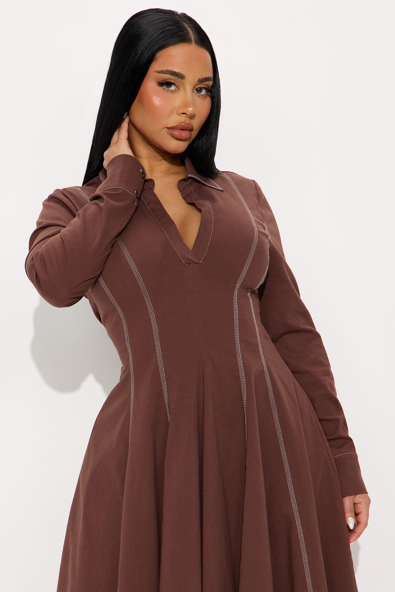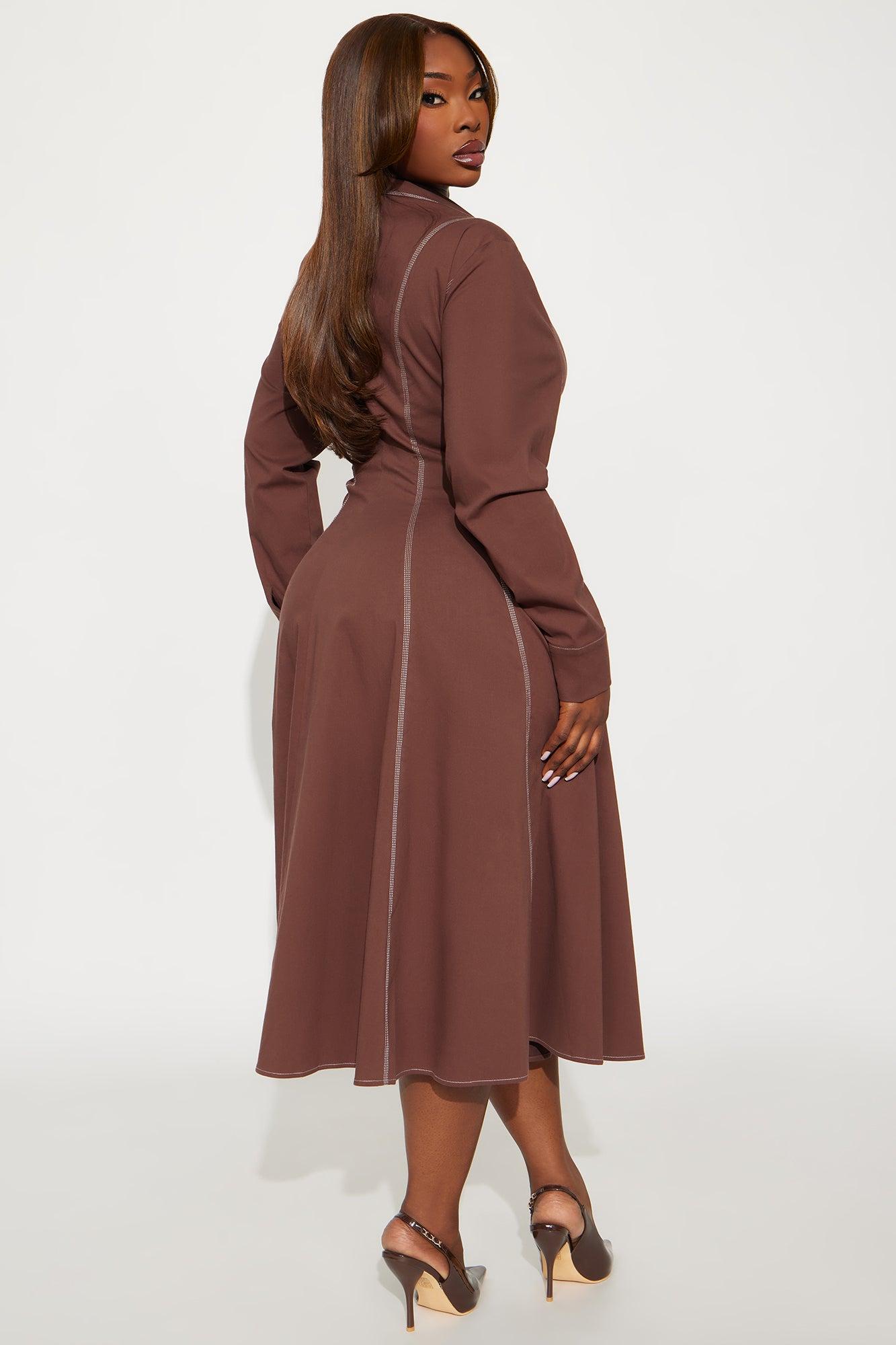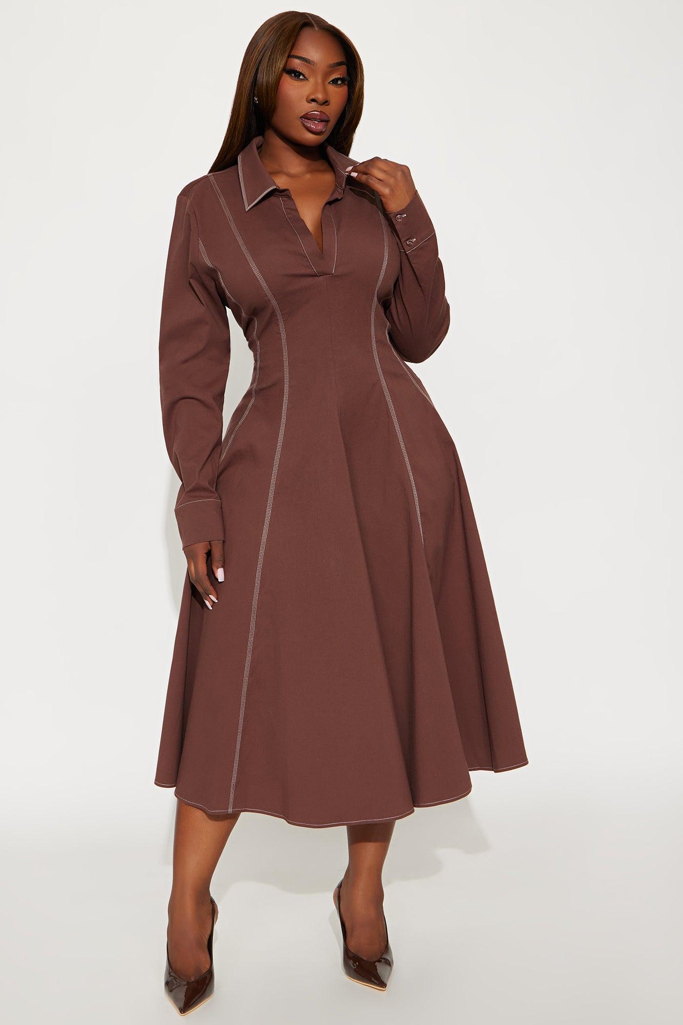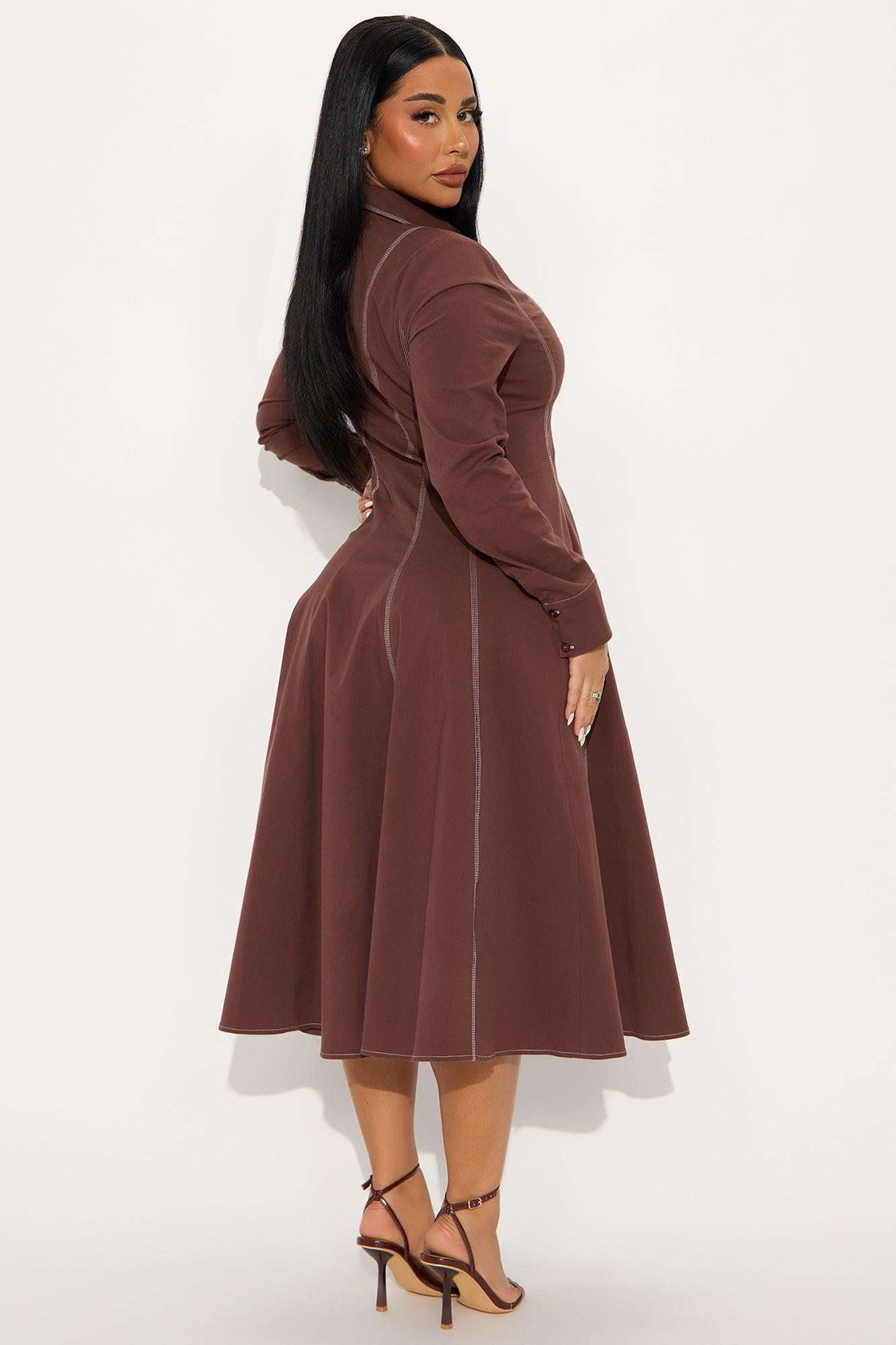 Available In Chocolate And Hunter Green. Midi Dress Collar neckline Short Sleeves Pleated Stretch Length measured flat = 44" Self : 97% Cotton 3% Spandex Imported California Proposition 65WARNING: Cancer and Reproductive Harm - www.P65Warnings.ca.gov.