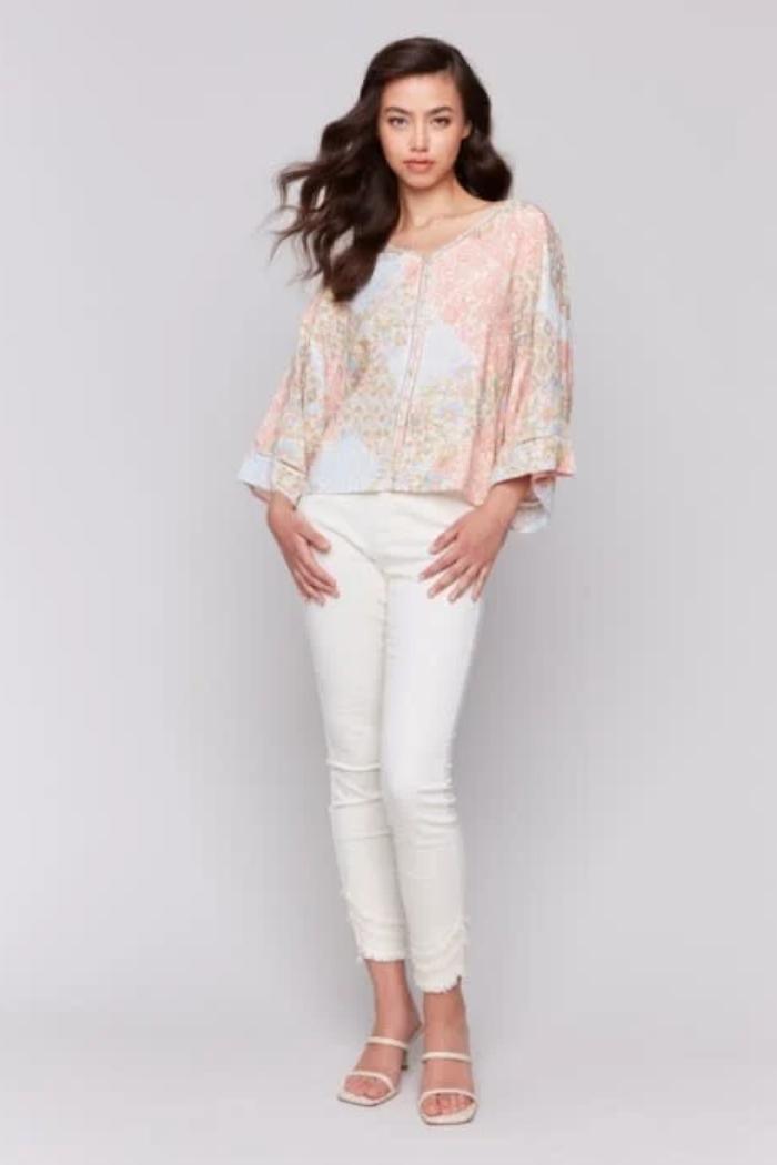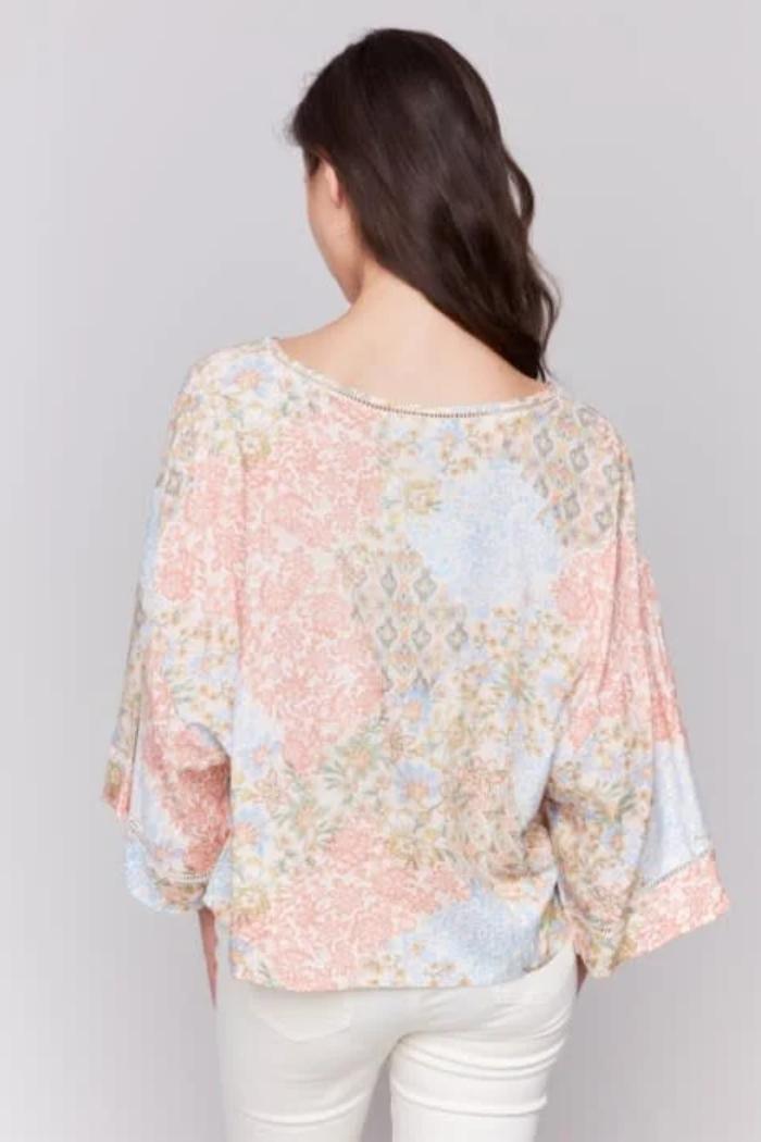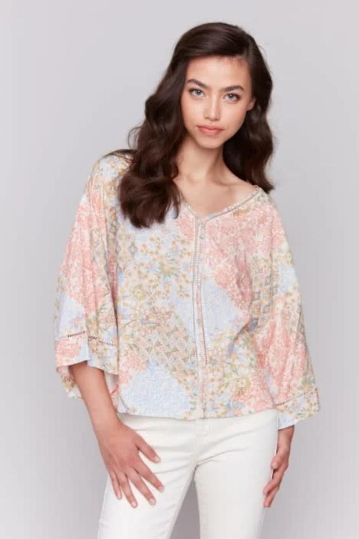 Printed 3/4 Wide Sleeve Blouse w/ Ladder Stitch Detail
