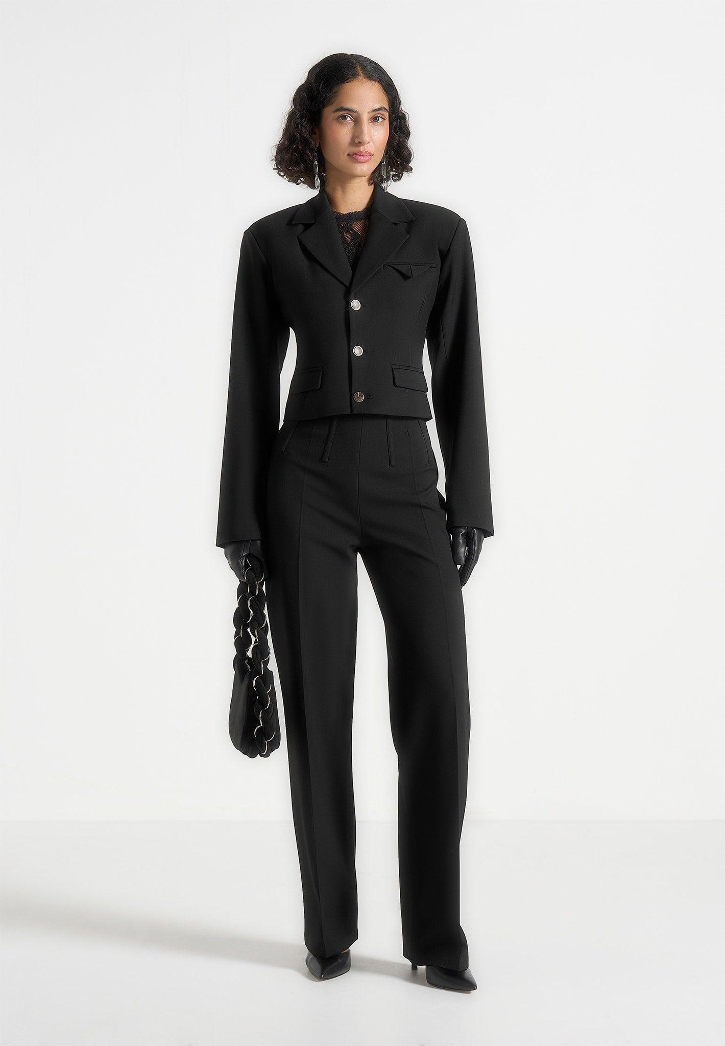 Redefine modern tailoring with this cropped tailored blazer. Designed with contour detailing, it sculpts the body for a flattering fit, while statement feature buttons add a refined finish. Front welt pockets deliver an elevated, tailored aesthetic, complemented by functional front pockets for everyday ease. Finished with a smooth satin lining for a premium feel and a cropped silhouette for a contemporary edge, it blends sophistication with versatile wearability. Cropped silhouette for a modern edge Contour detailing for a sculpted, flattering fit Statement feature buttons for a refined finish Front welt pockets for an elevated, tailored look Functional front pockets for everyday ease Smooth satin lining for premium feel Silver Manière De Voir Eiffel plaque to centre back
