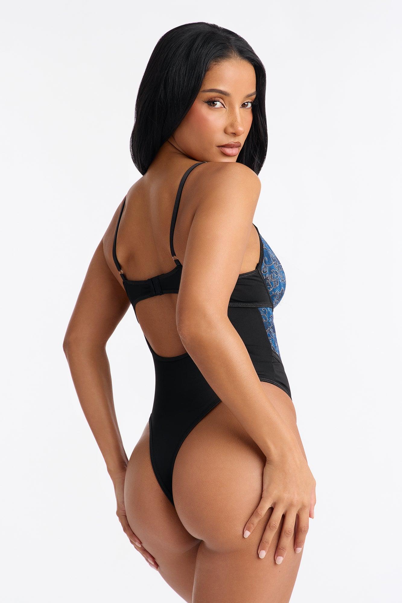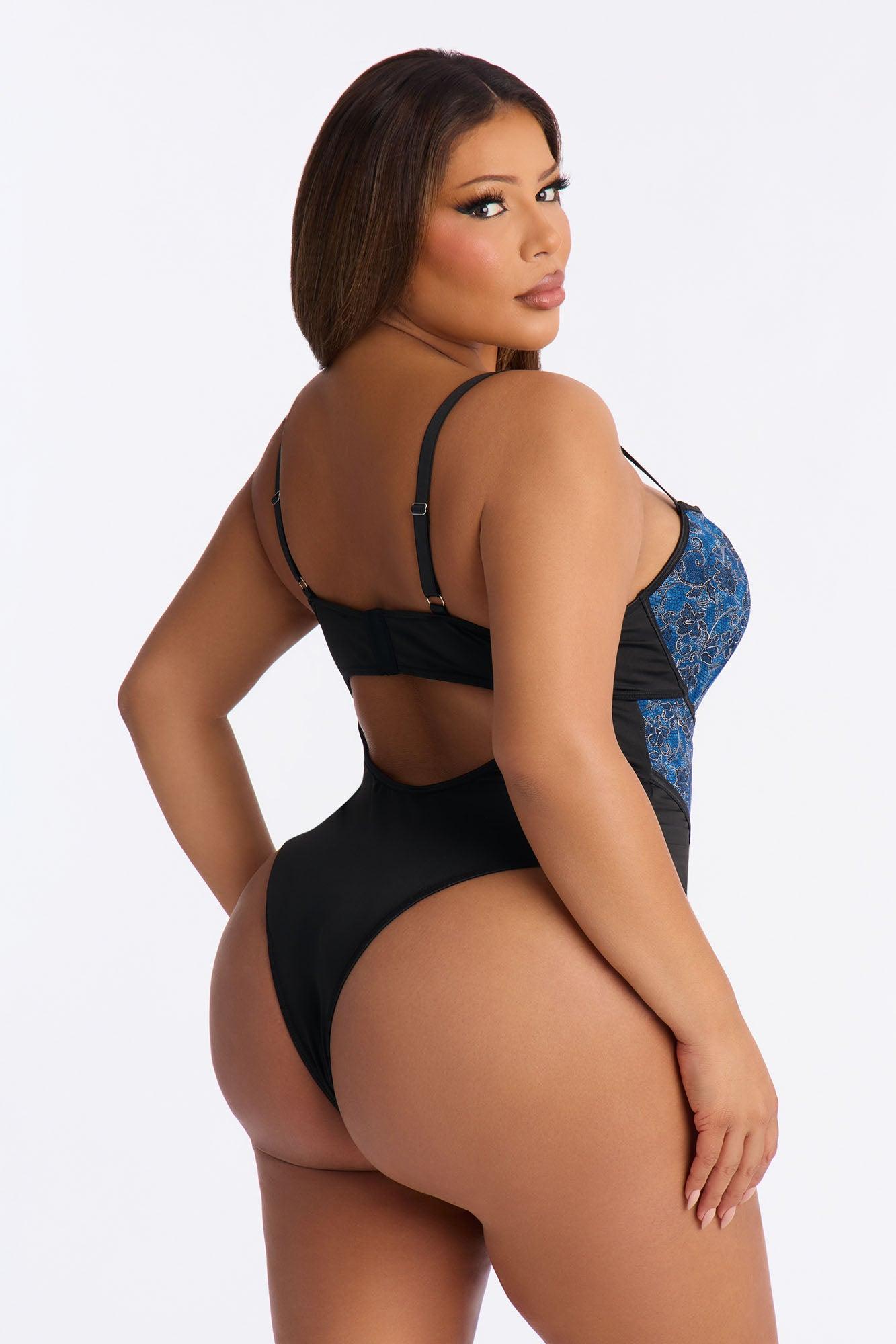 Available In Blue/Black. Lace Teddy Adjustable Straps Underwire Faux Leather Detail Lace Up Detail Thong Bottom Final Sale Self : 95% Polyester 5% Spandex Contrast 1 : 95% Polyester 5% Spandex Contrast 2 Coating : 100% Polyurethane Backing : 94% Polyester 6% Spandex Imported