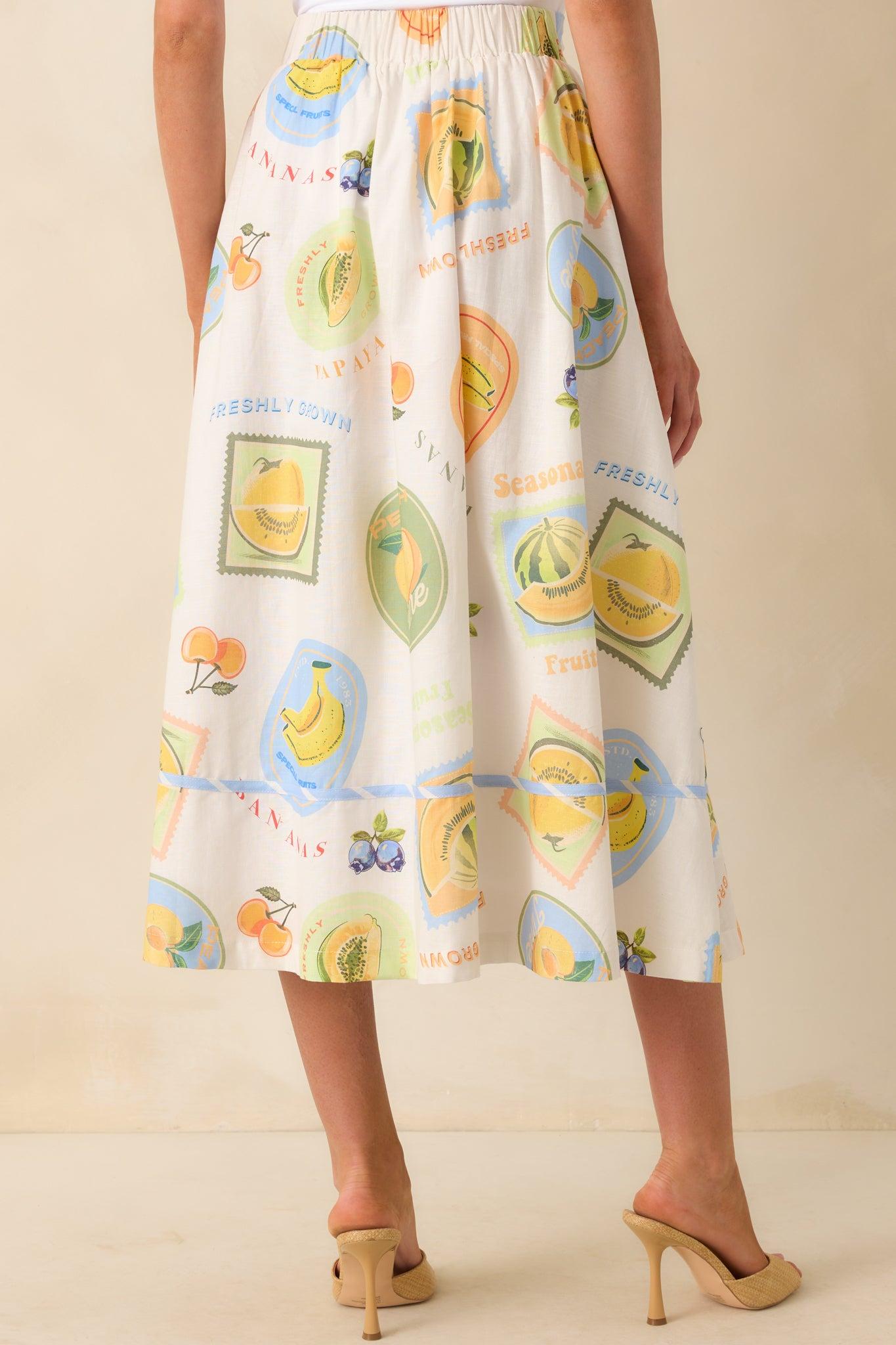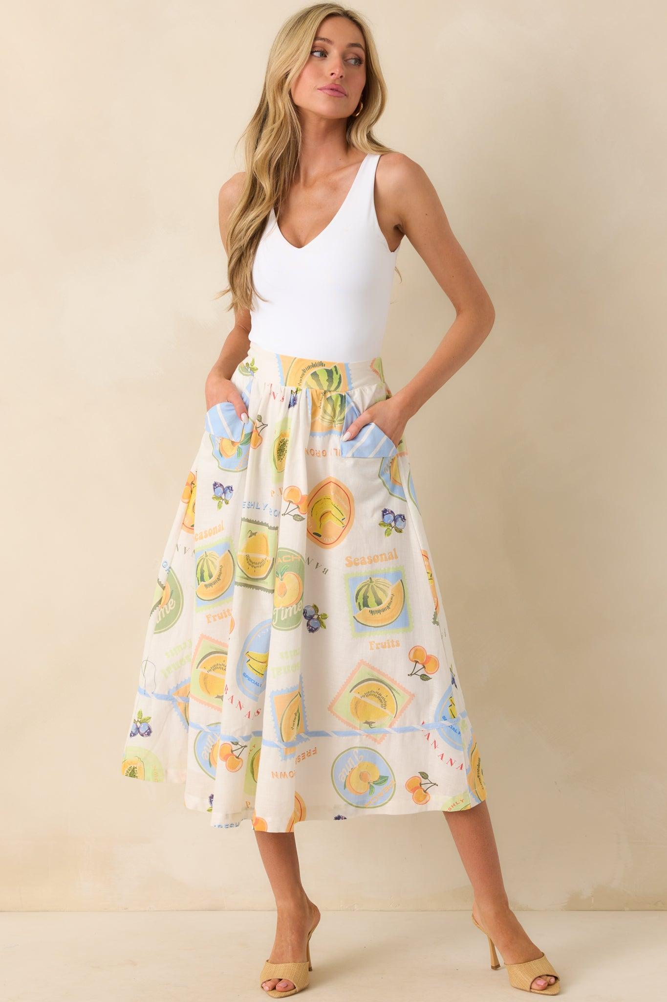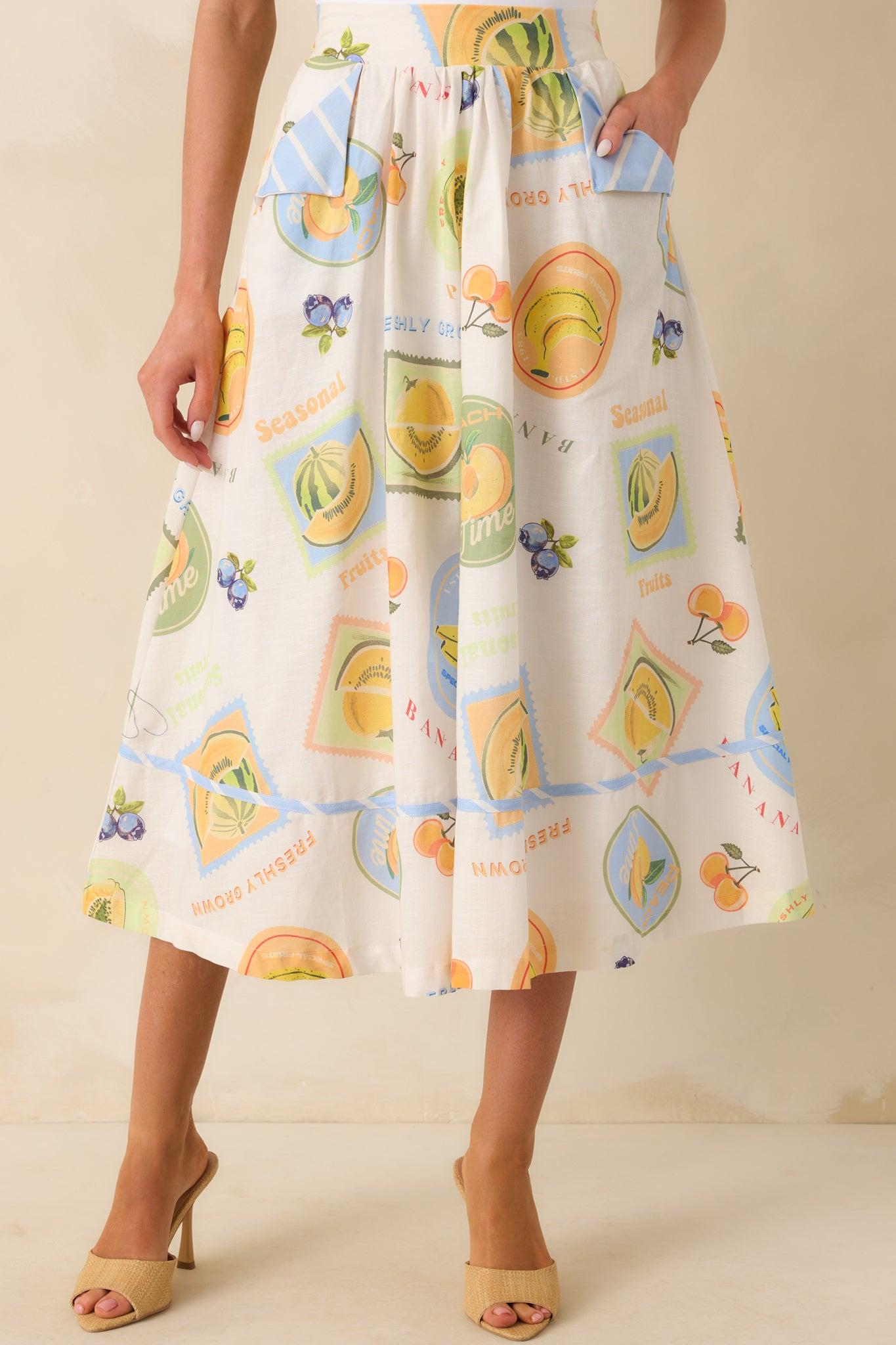 Prosperina Ivory Cotton Heirloom Orchard Print Annie Apron Midi Skirt is a gentle nod to slowing down and savoring the small things. It’s the kind of piece that turns even the simplest days into something a little more thoughtful. This ivory midi skirt features an exclusive Prosperina multicolor patchwork print, back elastic waist insert, decorative blue & white stripe pocket facing flaps, and functional pockets.