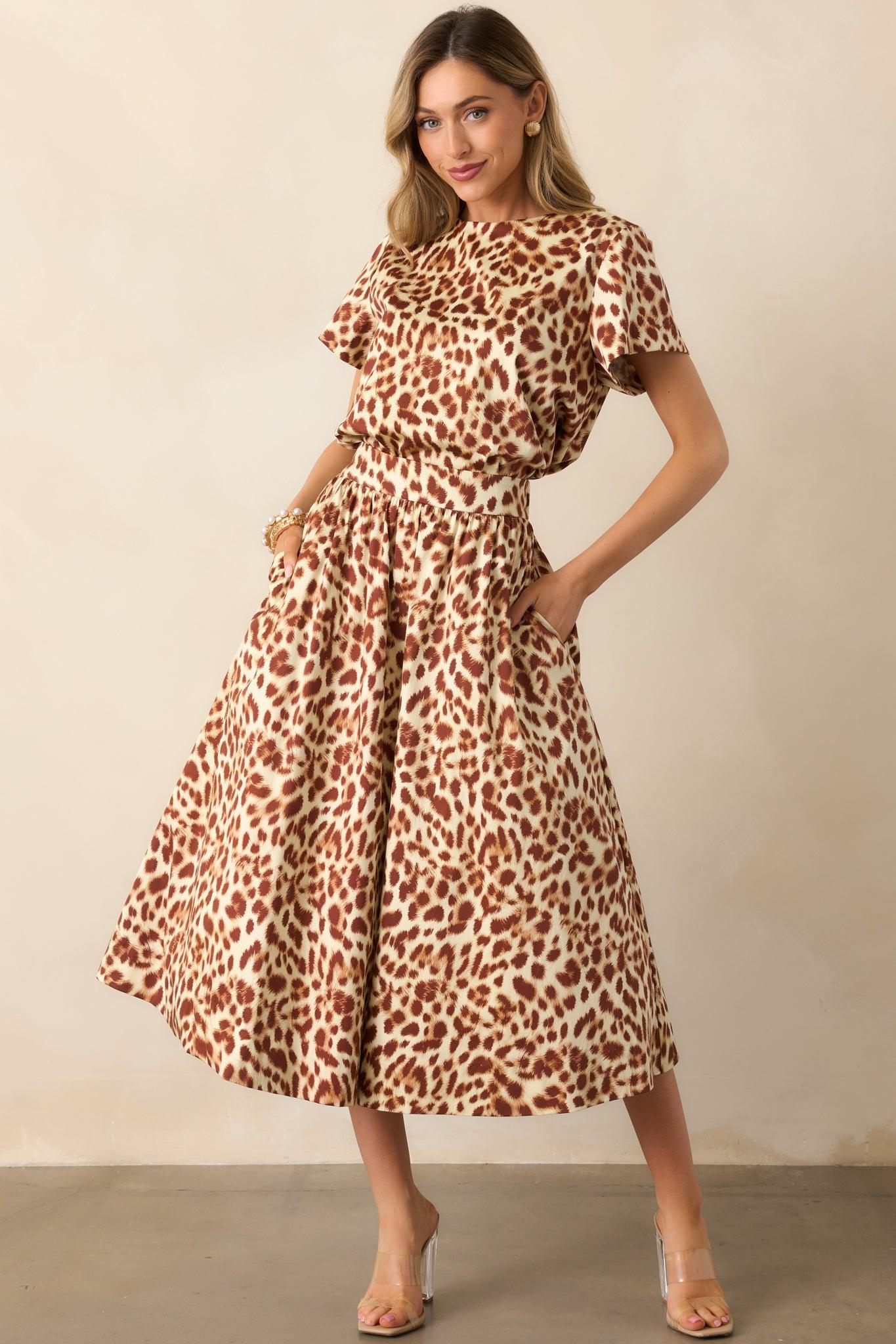 The Prosperina Erica Brown Leopard Print Cotton Midi Skirt has a graceful ease that works in any setting. Its flowing silhouette and classic feel make it a piece you’ll reach for whenever you want something effortlessly refined. This midi dress features an ivory and brown abstract leopard print, a high rise, an elastic back waist insert, full lining, and functional pockets. 97% Cotton & 3% Spandex Lined: 100% Rayon Wash inside out, with cold water on a gentle cycle Use mild detergent & avoid bleach Hand wash cold & air dry preferred Manufactured in China & Designed in The USA Model is 5'6" & is Wearing a Size X-small