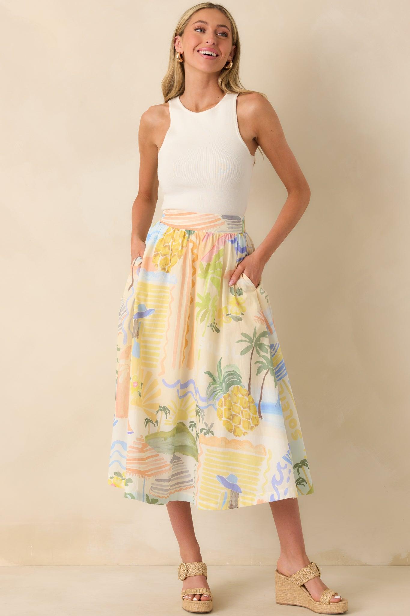 The Prosperina Erica Multi Print Cotton Midi Skirt brings joyful energy and a touch of vintage-inspired flair to your wardrobe. Breezy and full of personality, it’s perfect for market days, lunch dates, or any moment when you want your style to feel vibrant and effortlessly chic. This midi skirt features an exclusive Prosperina Citrus Splash print, elastic back waist insert, full white lining, flowy skirt, and functional pockets.