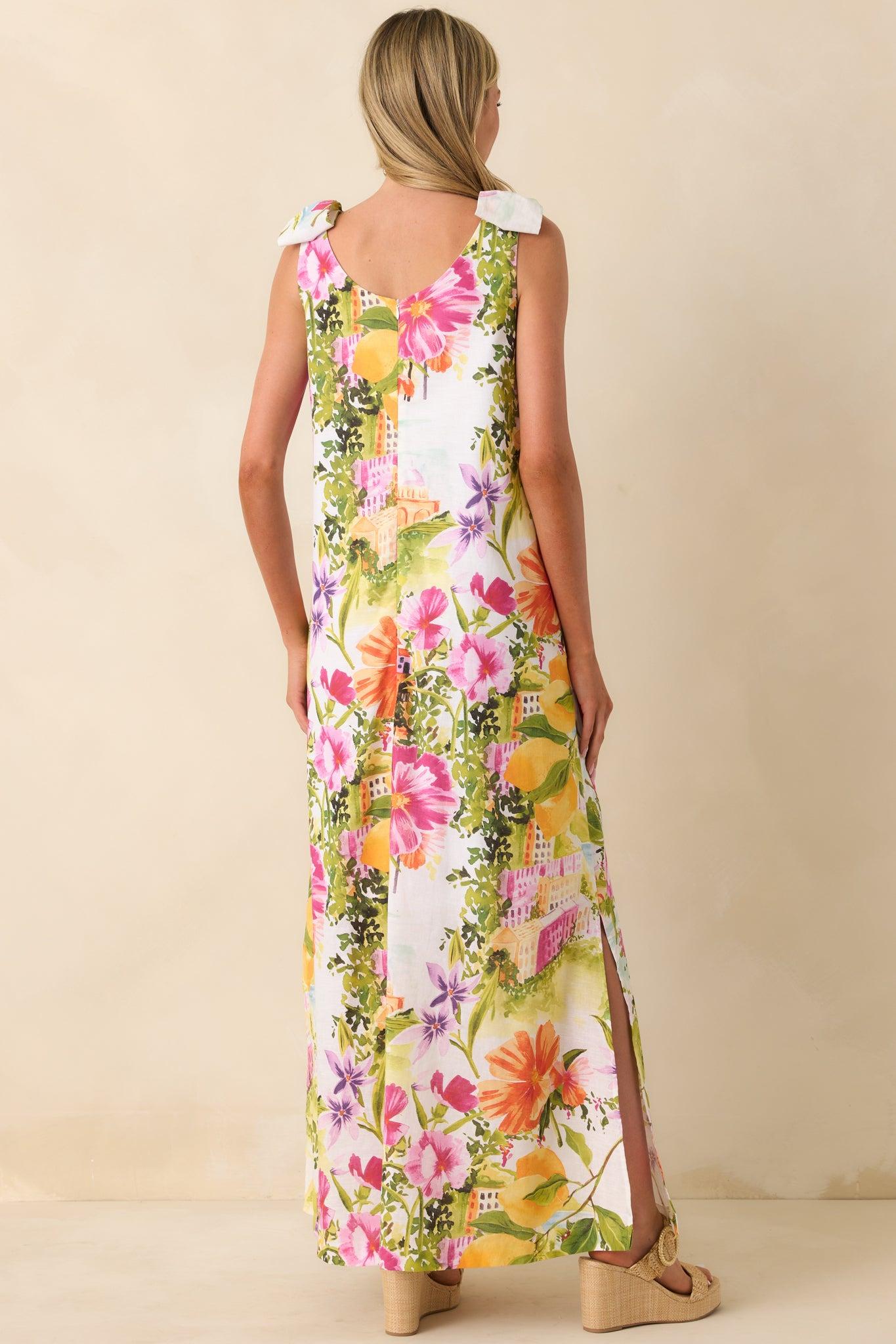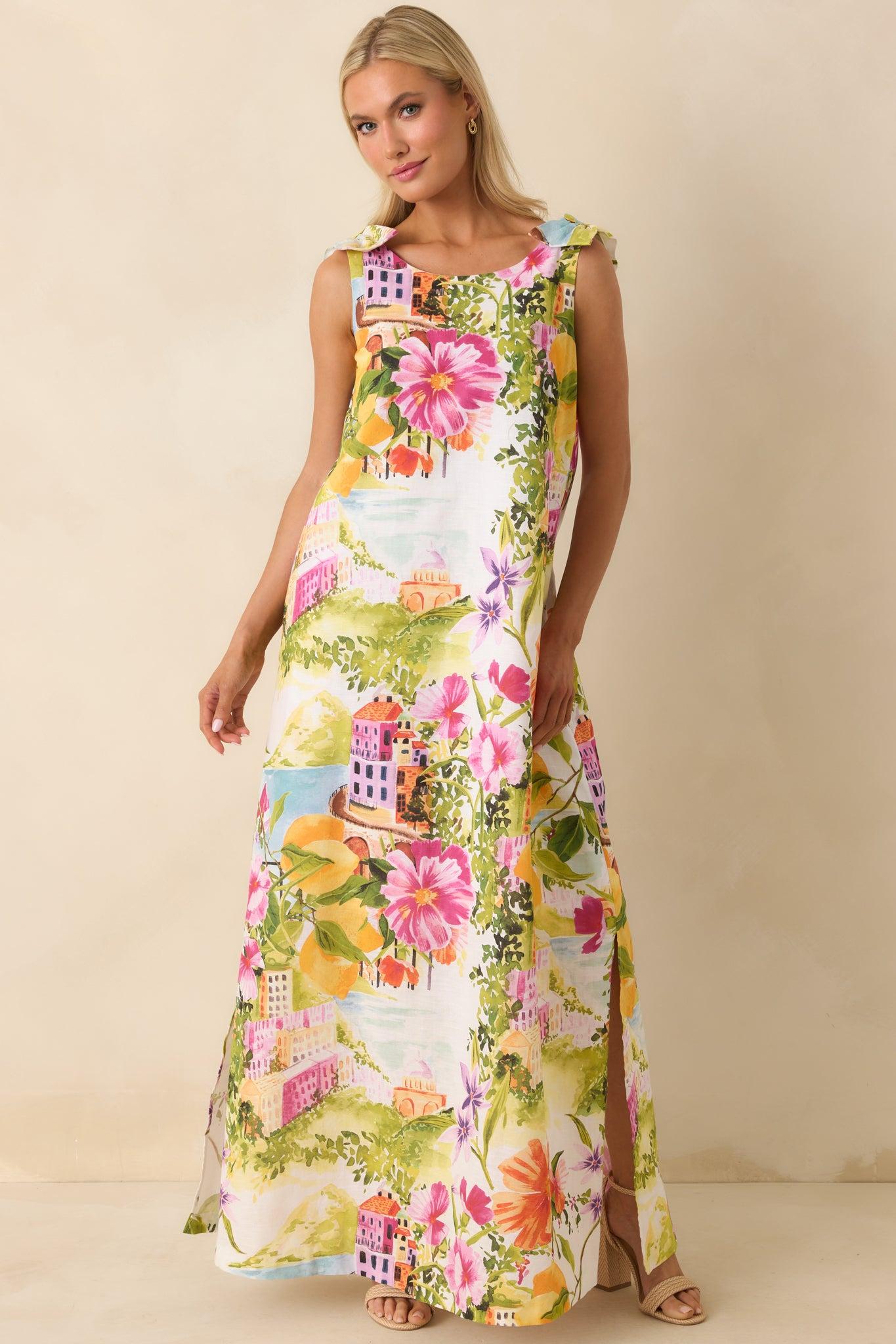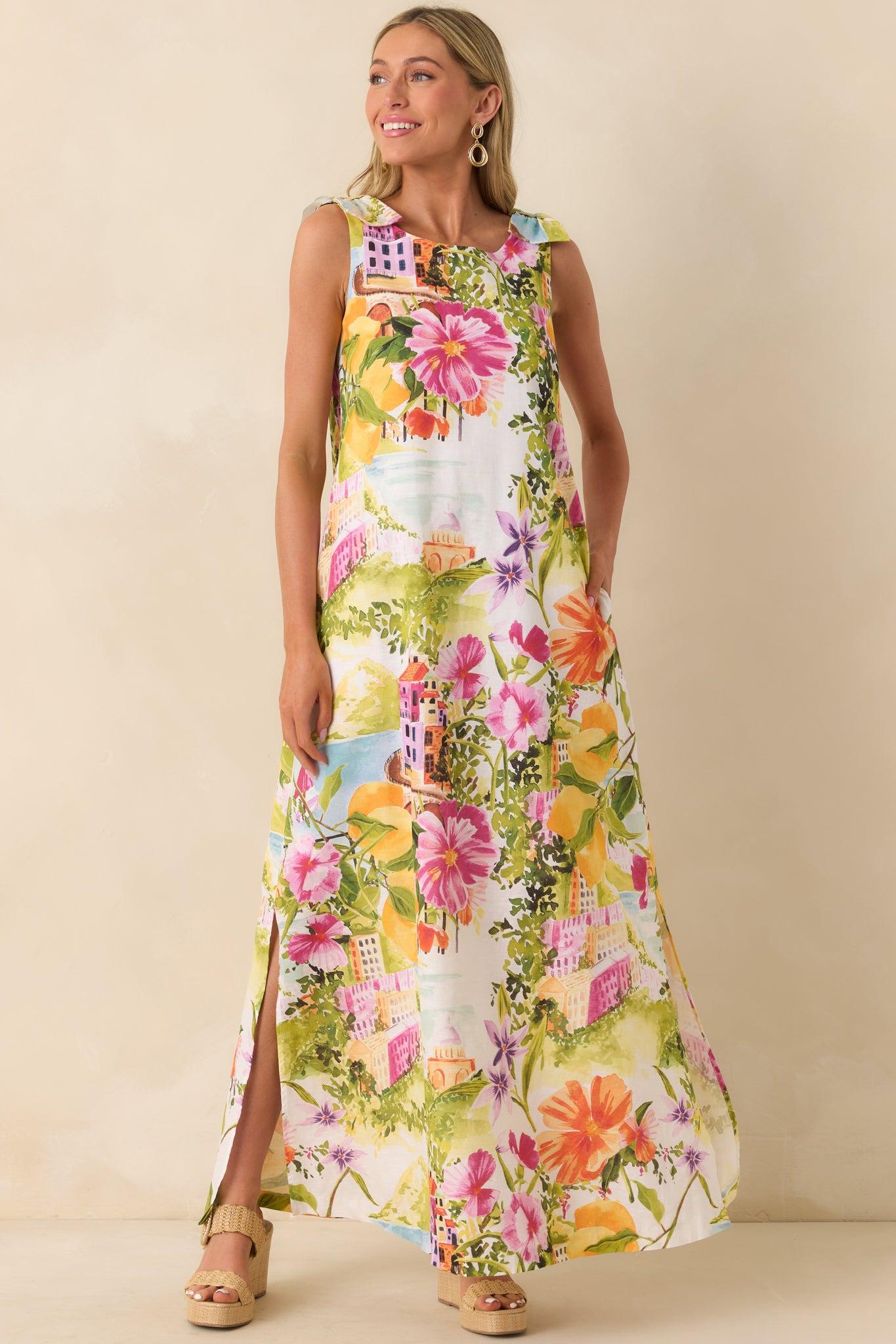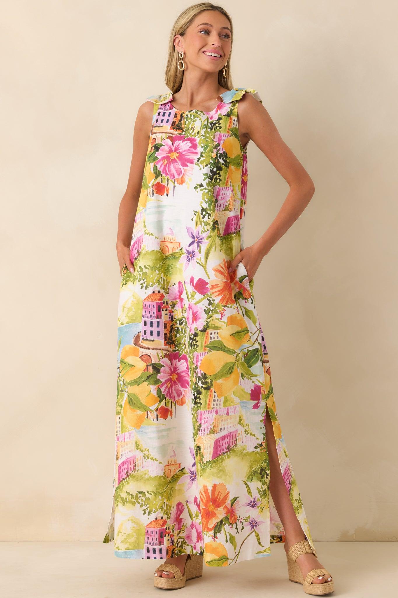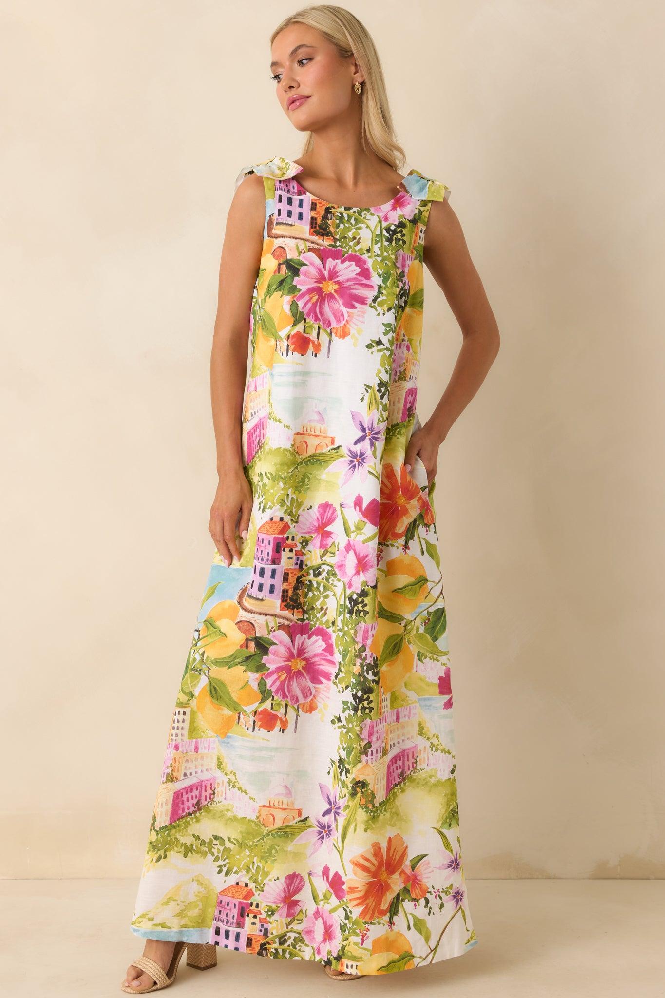 Effortlessly elegant with a touch of wanderlust charm, the Prosperina Lucie Multi Linen Blend Scenic Coastal Print Maxi Dress captures the beauty of a sun-soaked seaside escape. Featuring a vibrant scenic coastal print with blooming florals, citrus accents, and picturesque village details, this maxi feels like a wearable postcard from your dream destination. Crafted from a breathable linen-cotton blend, it offers a lightweight, airy feel perfect for warm days. The relaxed maxi silhouette drapes beautifully for an easy, flattering fit, while the sleeveless design keeps the look fresh and versatile. Subtle shoulder tie details add a soft, feminine touch, and side pockets bring effortless functionality to this statement style.