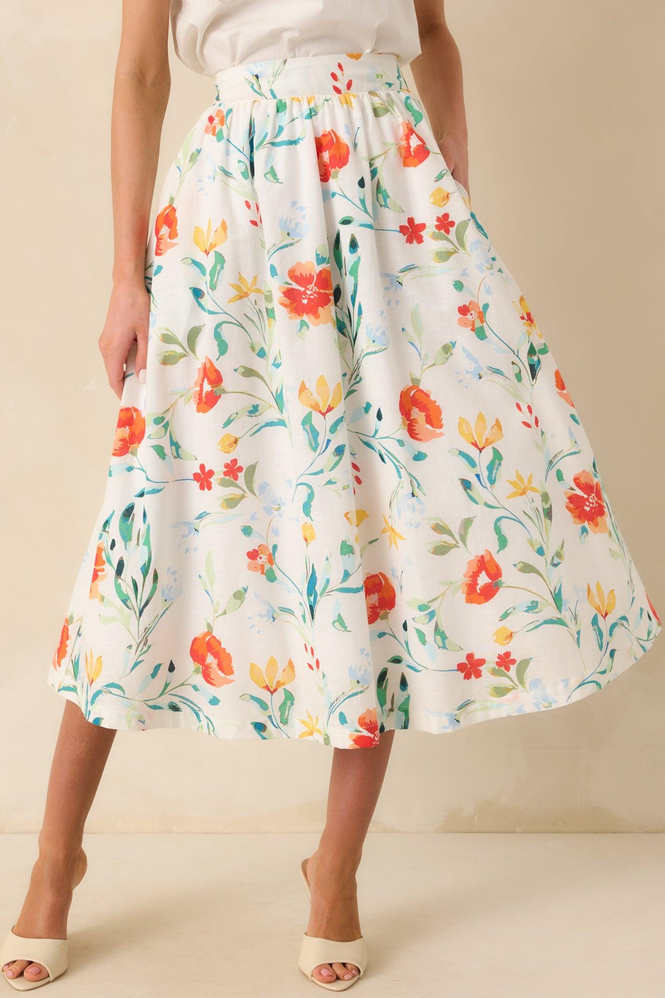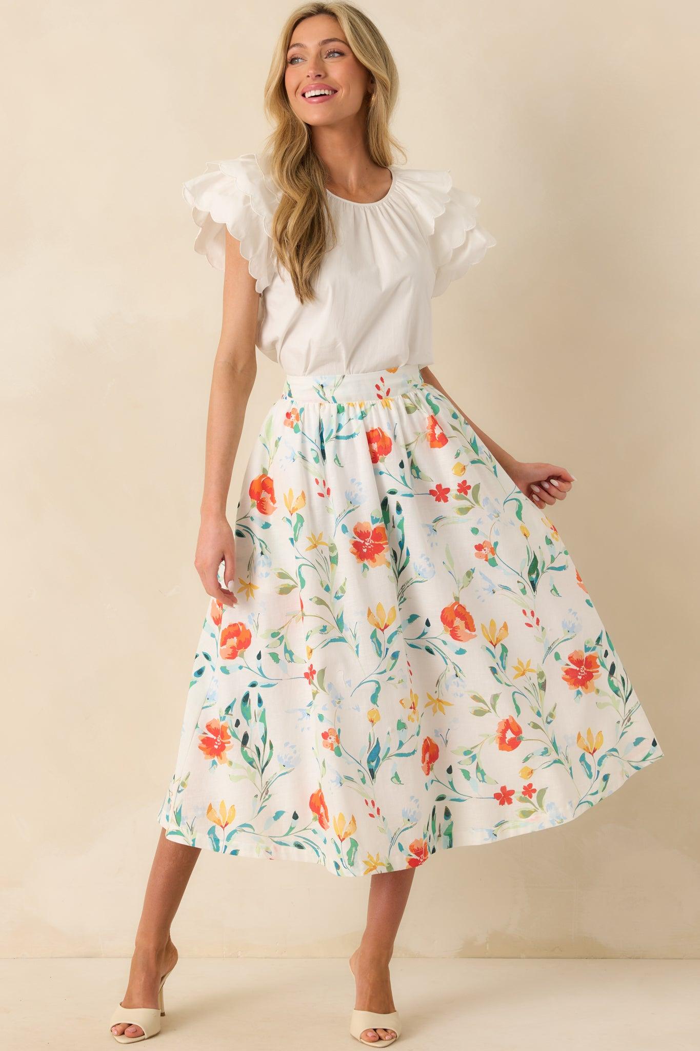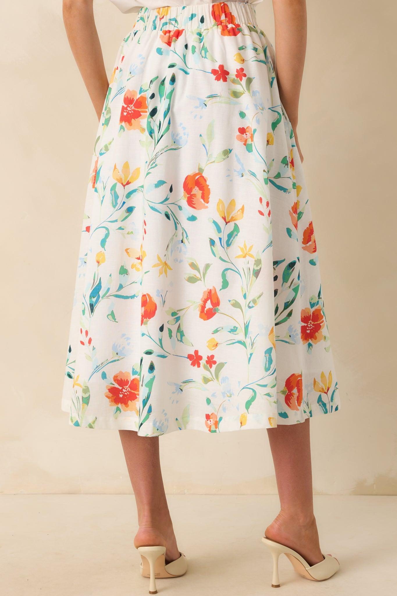 Prosperina Ivory Cotton Wild Poppies Print Maddie Midi Skirt brings a soft sense of whimsy to your routine. With its lively print and easy charm, it’s made for adding a little color to the quiet moments you’ll remember most. This ivory midi skirt features an exclusive Prosperina multicolor floral print, a high rise, back elastic waist insert, ivory lining, and functional pockets.