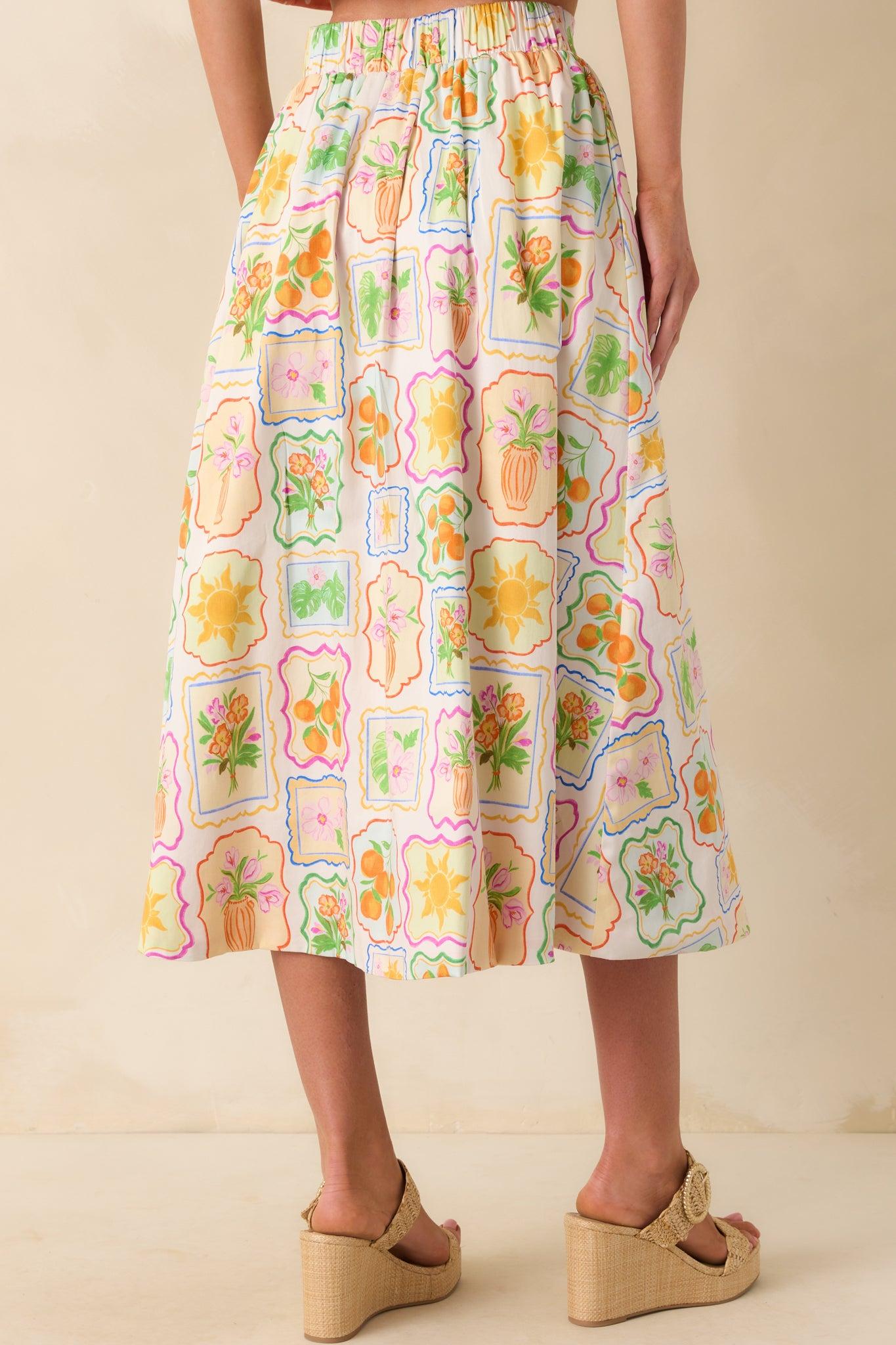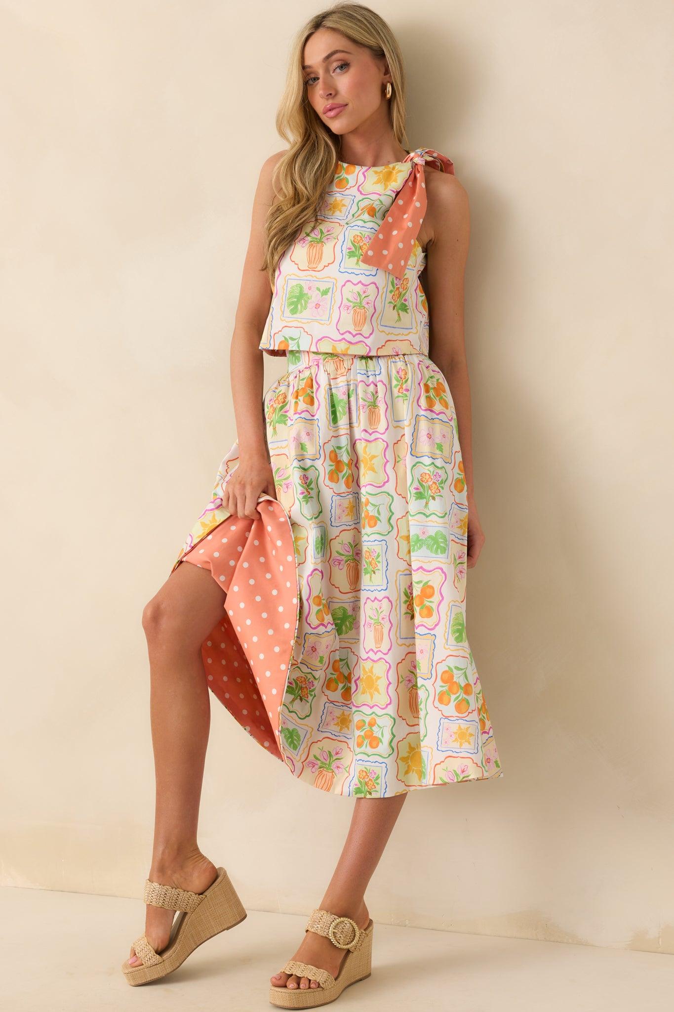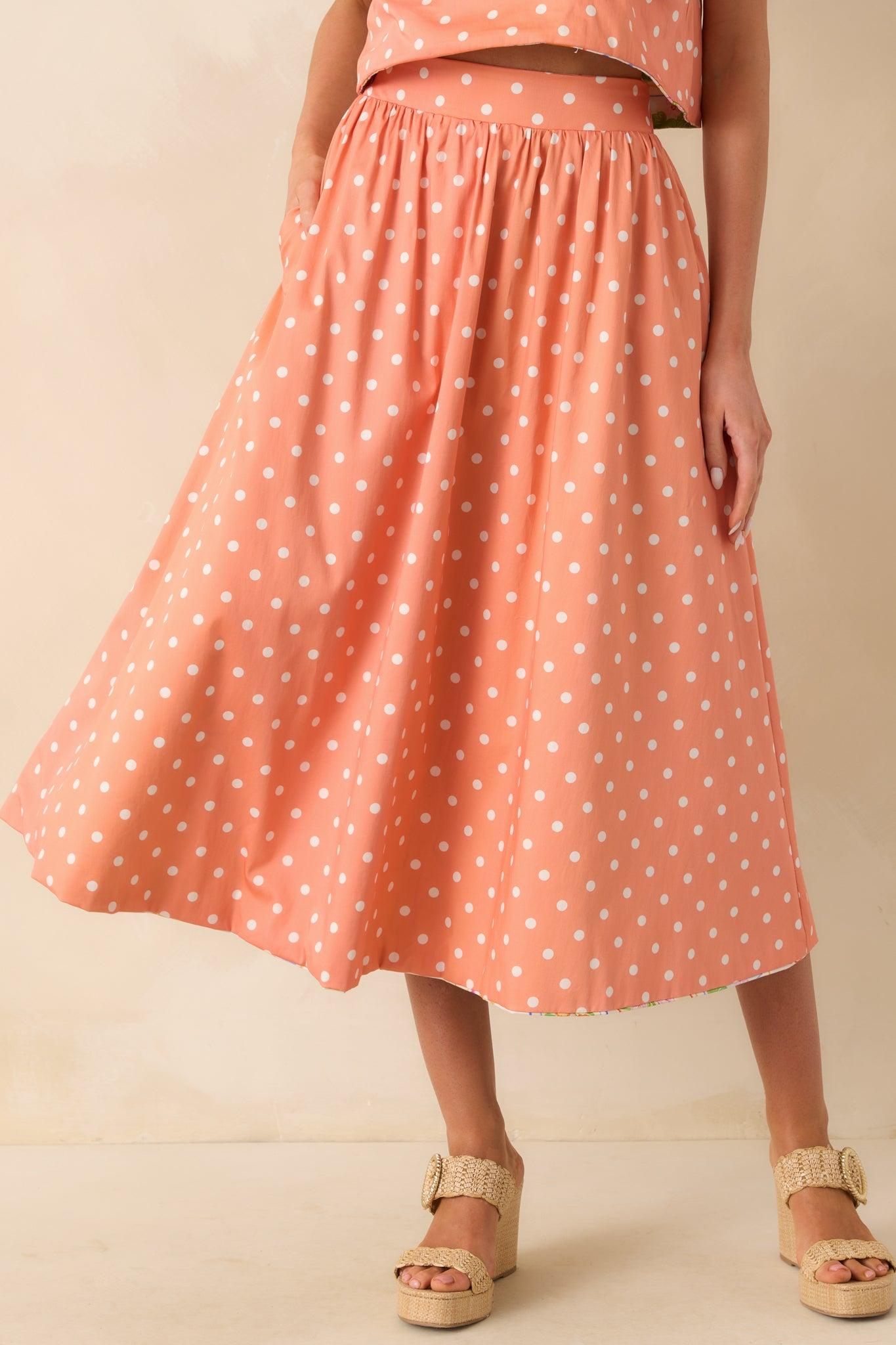 Prosperina Reversible Cotton Vintage Vignettes Print Maddie Midi Skirt is for the moments that shift and surprise you. Quietly playful and endlessly wearable, it’s made to move with you—wherever your day decides to go. This reversible midi skirt features an exclusive Prosperina peach patchwork print on one side, peach & ivory polka dot print on the other, a back elastic waist, and functional pockets.