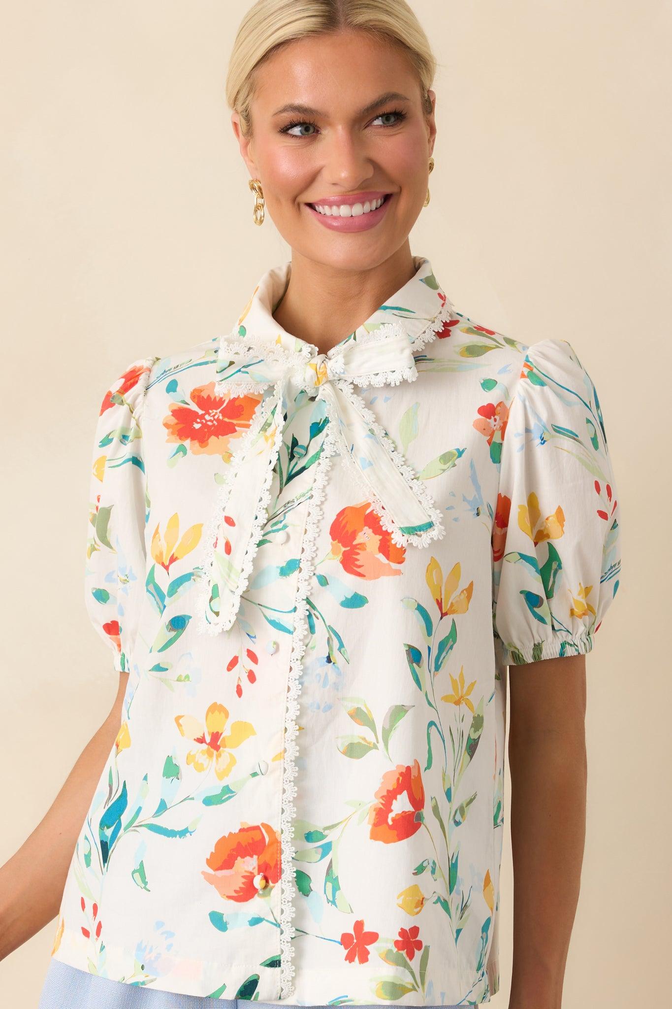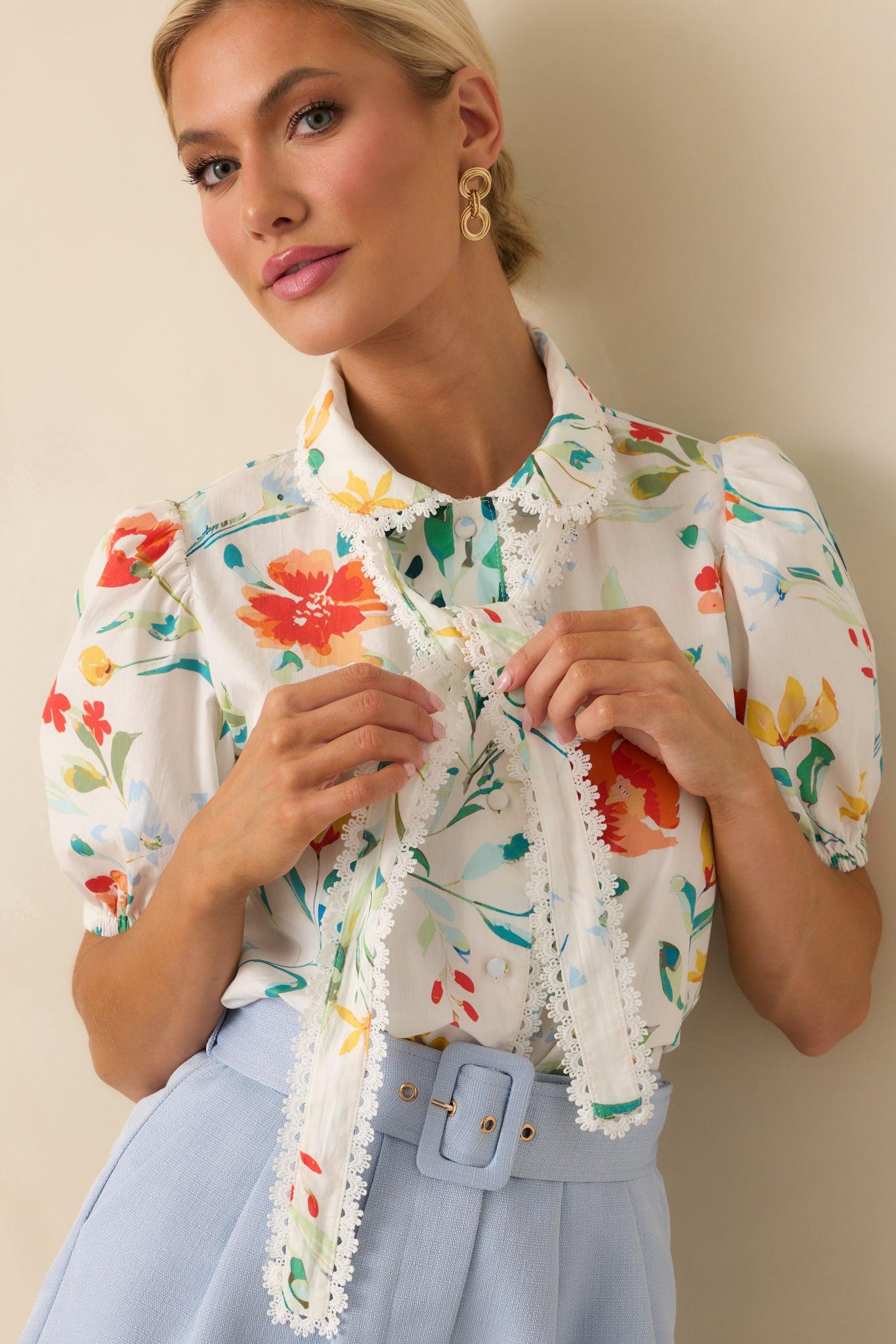 Prosperina Ivory Cotton Wild Poppies Print Willow Top brings a hint of brightness to your day with easy charm and playful spirit. It’s the kind of piece that feels fresh, fun, and ready for whatever’s ahead. This ivory top features an exclusive Prosperina multicolor floral print, collared neckline, optional self-tie bow neck, lace scallop hem trim throughout, puff sleeves, elastic cuffs, and a functional button front.