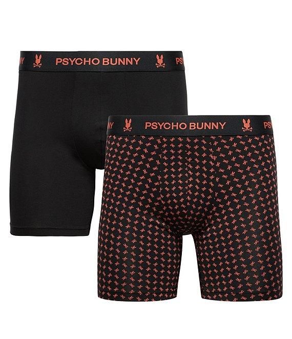 From Psycho Bunny, this boxer brief 2-pack features: One pair of bunny logo-patterned boxer briefs One pair of tonal-colorway boxer briefs Snug fit Mid rise Jacquard-woven bunny logo at the elasticized waistband No-fly paneled front Ultra-soft jersey cotton/modal Machine wash/tumble dry Imported.
