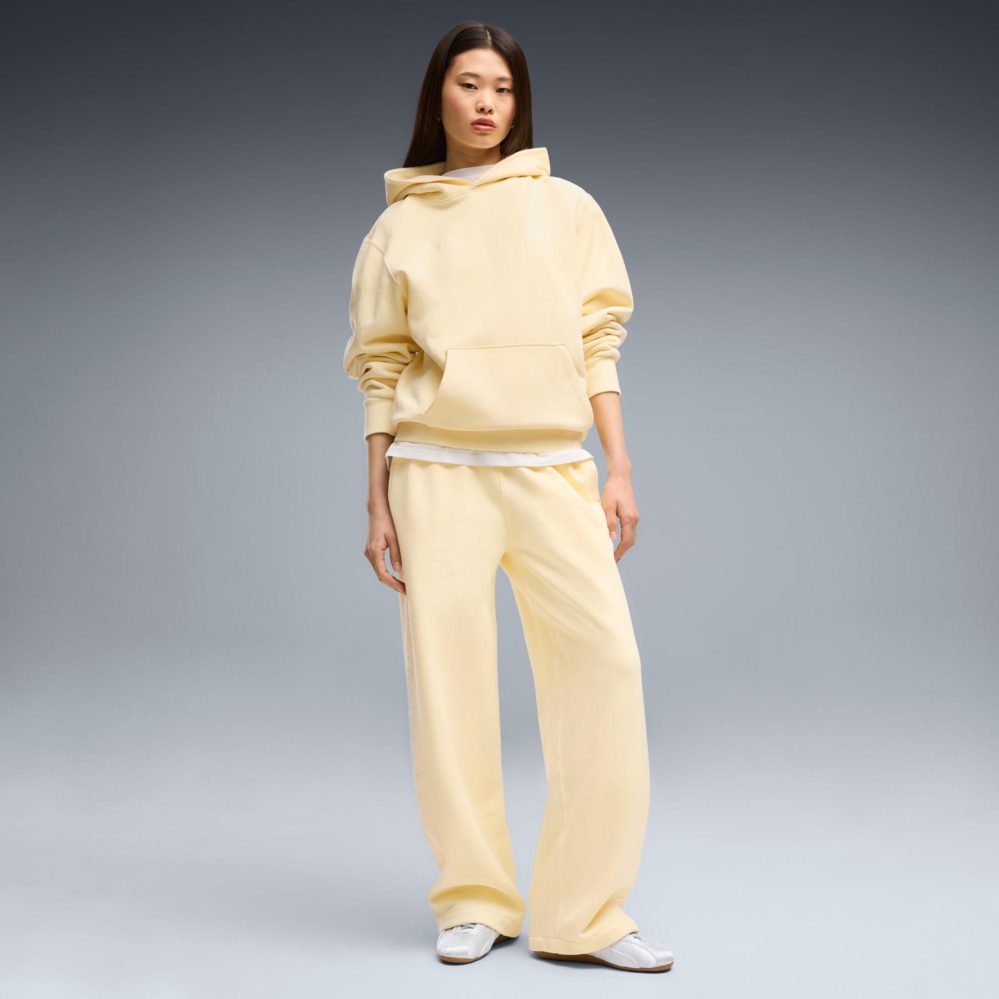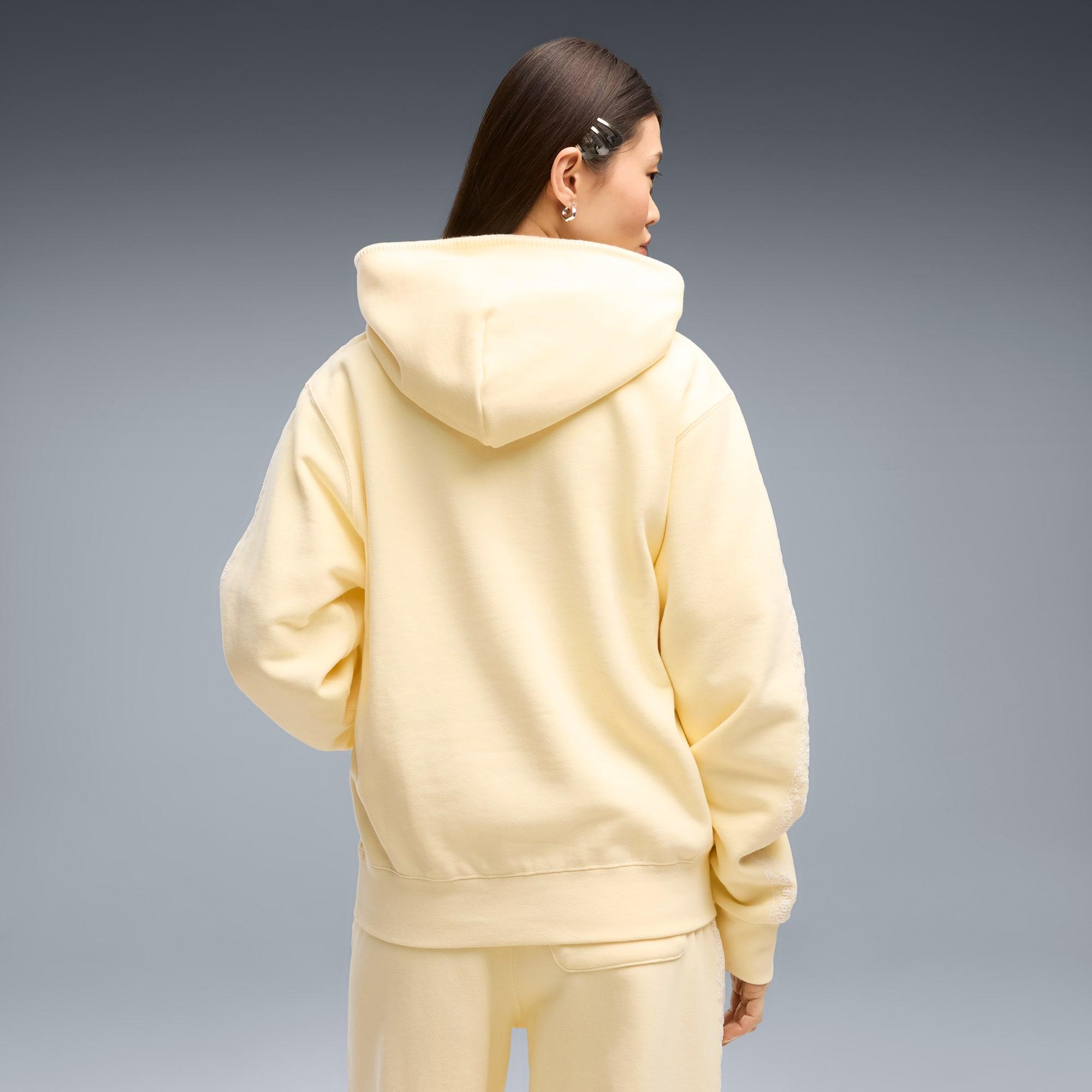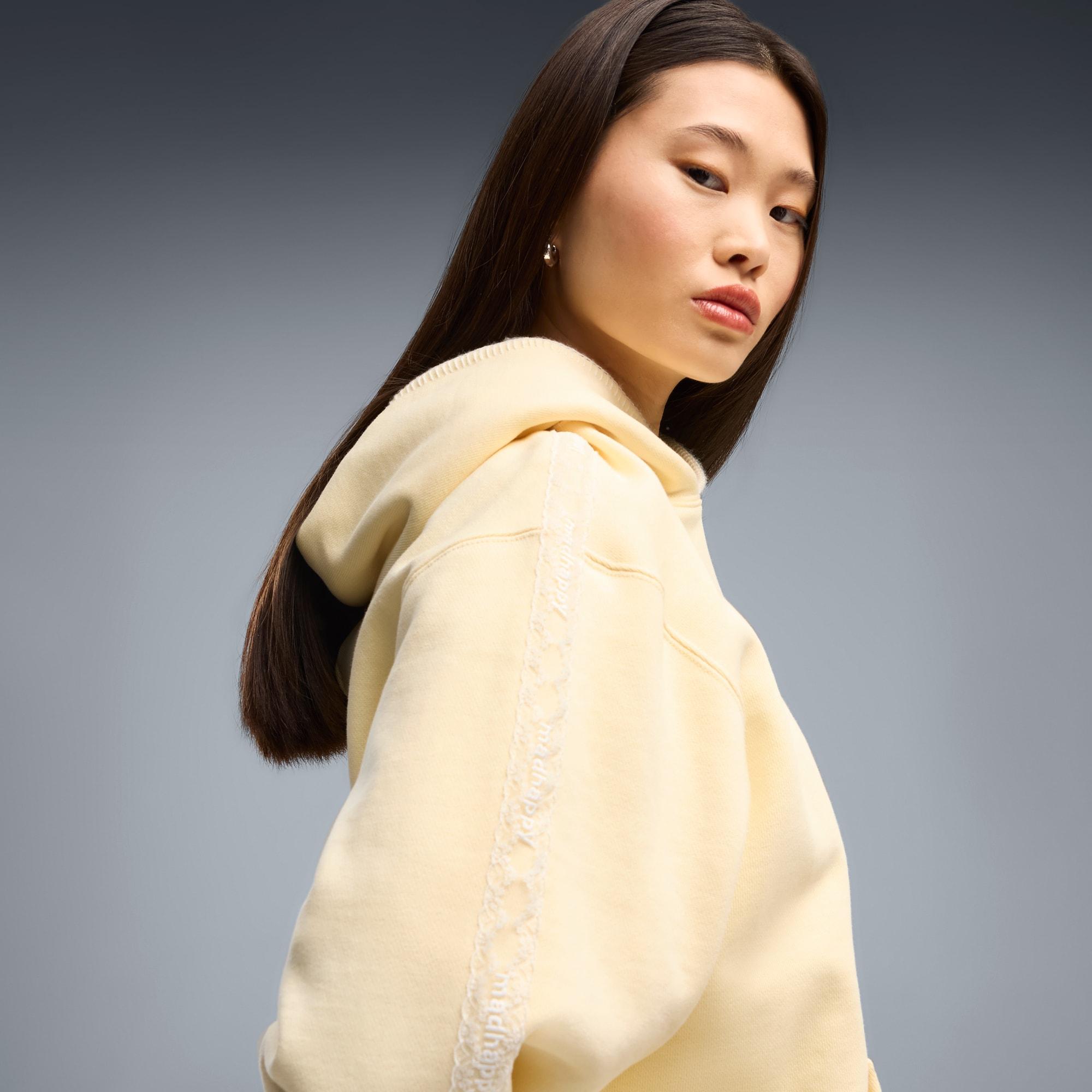 descriptionGood vibes only. The PUMA x MADHAPPY collection consists of classic sportswear and feel-good loungewear designed to lift the mood. Elevated details like pointelle and lace add softness and texture to athletic silhouettes. The PUMA x MADHAPPY Relaxed Lace Hoodie brings that energy to a laid-back essential, with lace accents on the sleeves for a fresh take on everyday comfort.Style: 637564_35Color: Creamy Vanillafeatures & benefitsMade with at least 20% recycled cotton.detailsFit: RelaxedMain material type: FleeceHoodedLong sleevesContrast stitching along the hoodLength: RegularLace tape down the sleevesPockets: Kangaroo pocketCo-branding detailsmaterials & careMaterial informationShell: 100% cottonRib: 97% cotton, 3% elastaneCare instructionsExclusive of DecorationWash with similar coloursUse only mild detergentDo not use fabric softenerDo not iron printWash garment in a washing bagWash and iron inside out