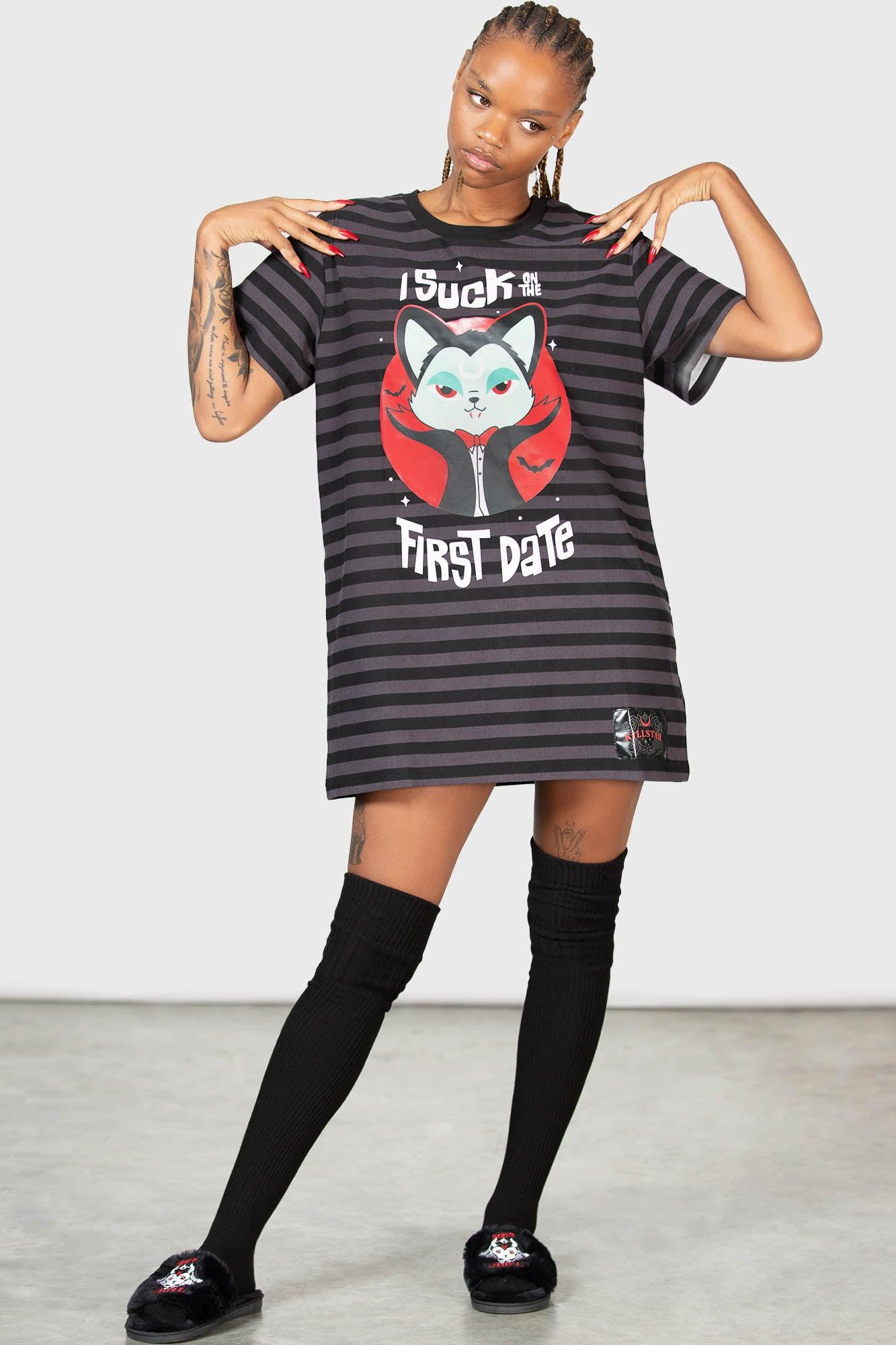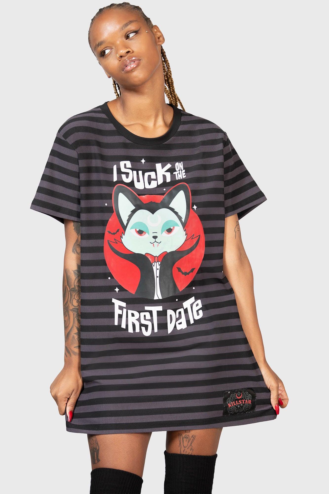 PURRFECT PAIRING. - Soft stretch fabric.- Statement Vampurr graphics.- Contrasting stripe pattern.- Text reads "I suck on the first date".- Short sleeves.- Relaxed fit.With KILLSTAR branding, 95% Cotton, 5% Elastane. Machine wash delicate 30°c / Do not bleach / Do not tumble dry / Iron at low temperature / Do not dry clean. Imported.