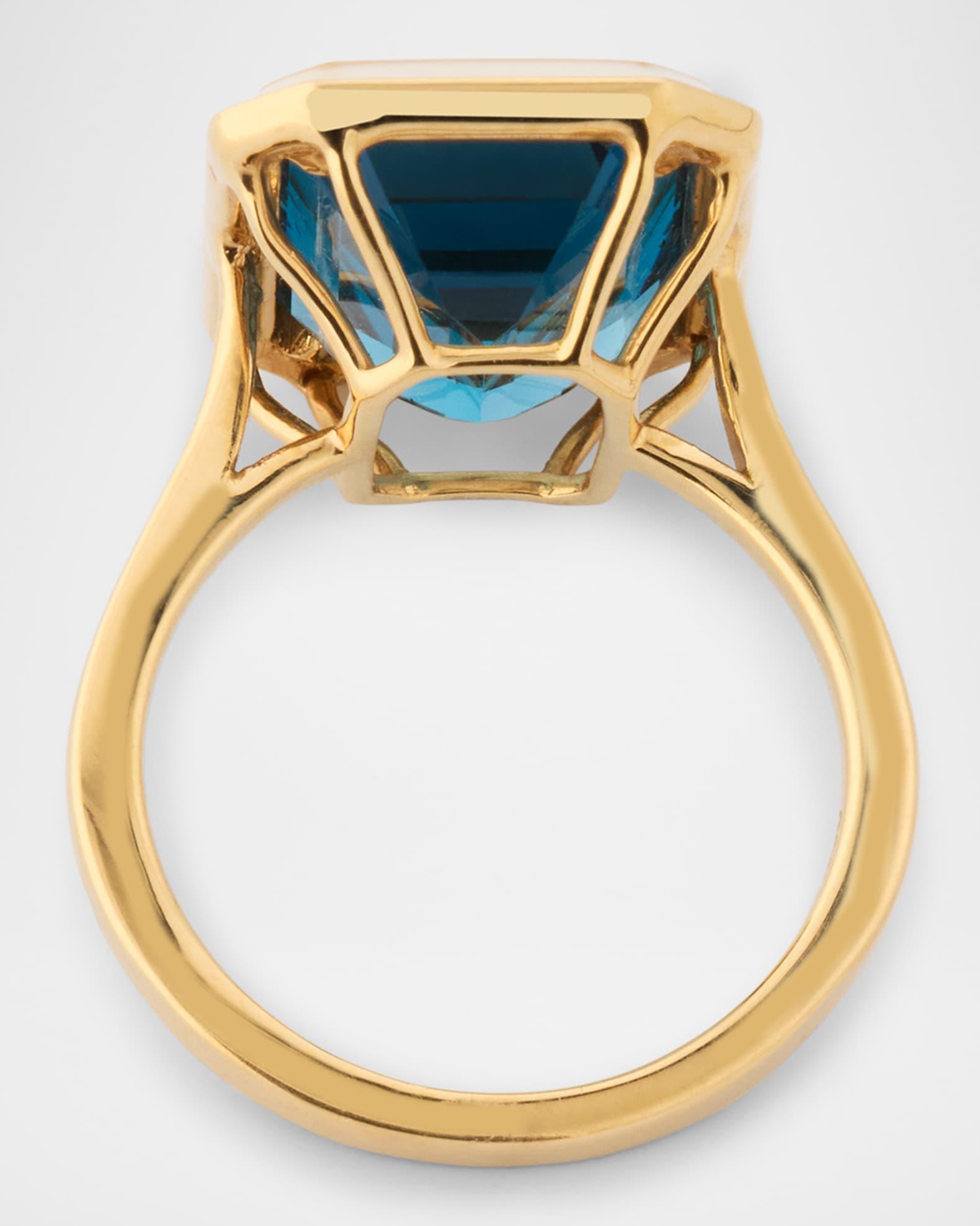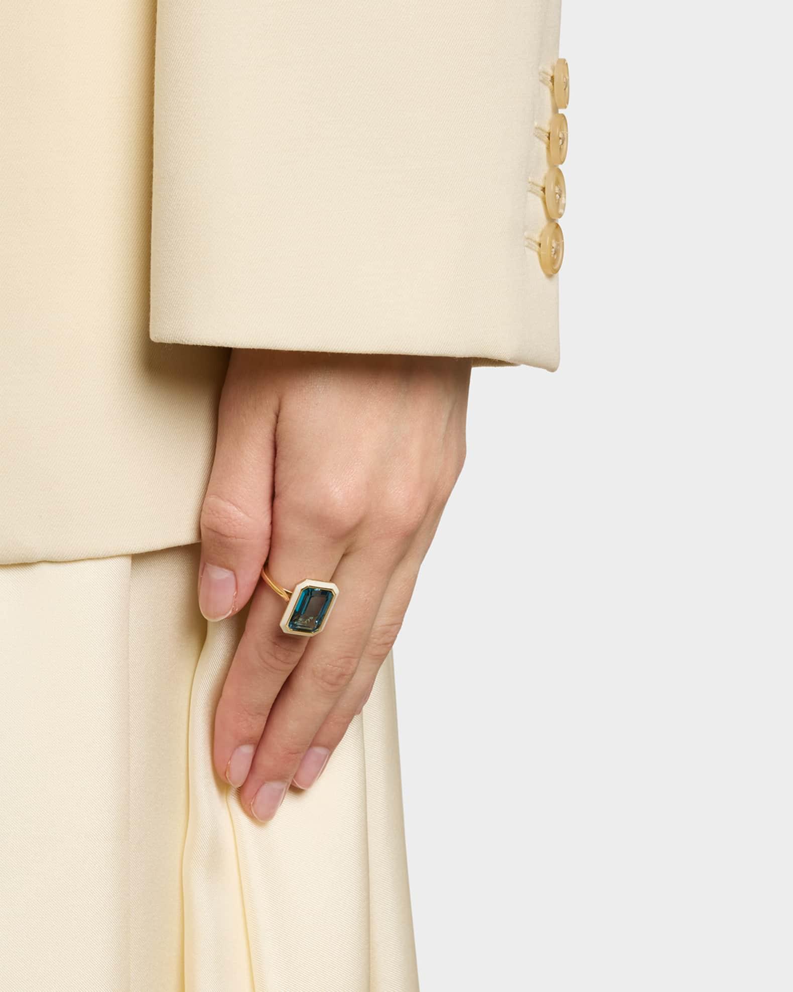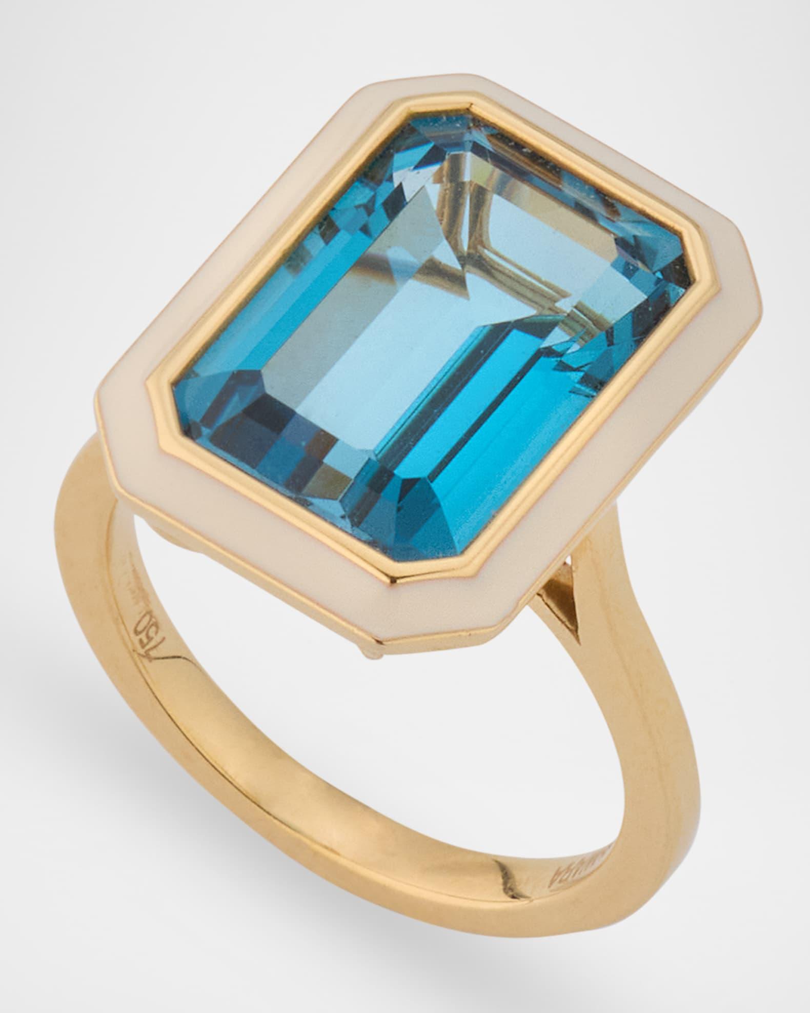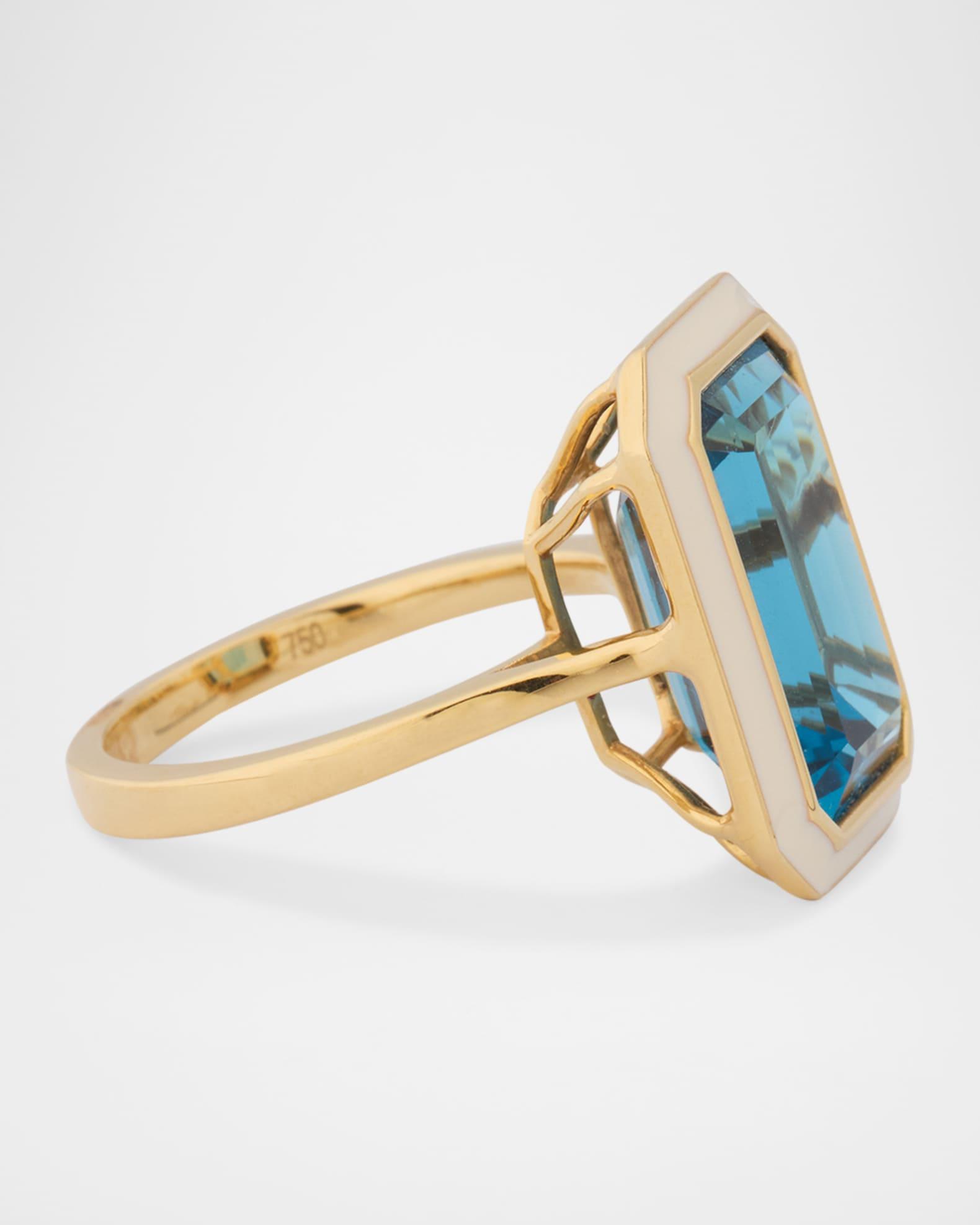 This cocktail ring from the Goshwara Queen collection is crafted with a 10mm x 15mm London blue topaz. A white enamel bezel surrounds the deep blue stone. Approx. 0.5" length Polished 18-karat yellow gold 9.35 total topaz carat weight Imported