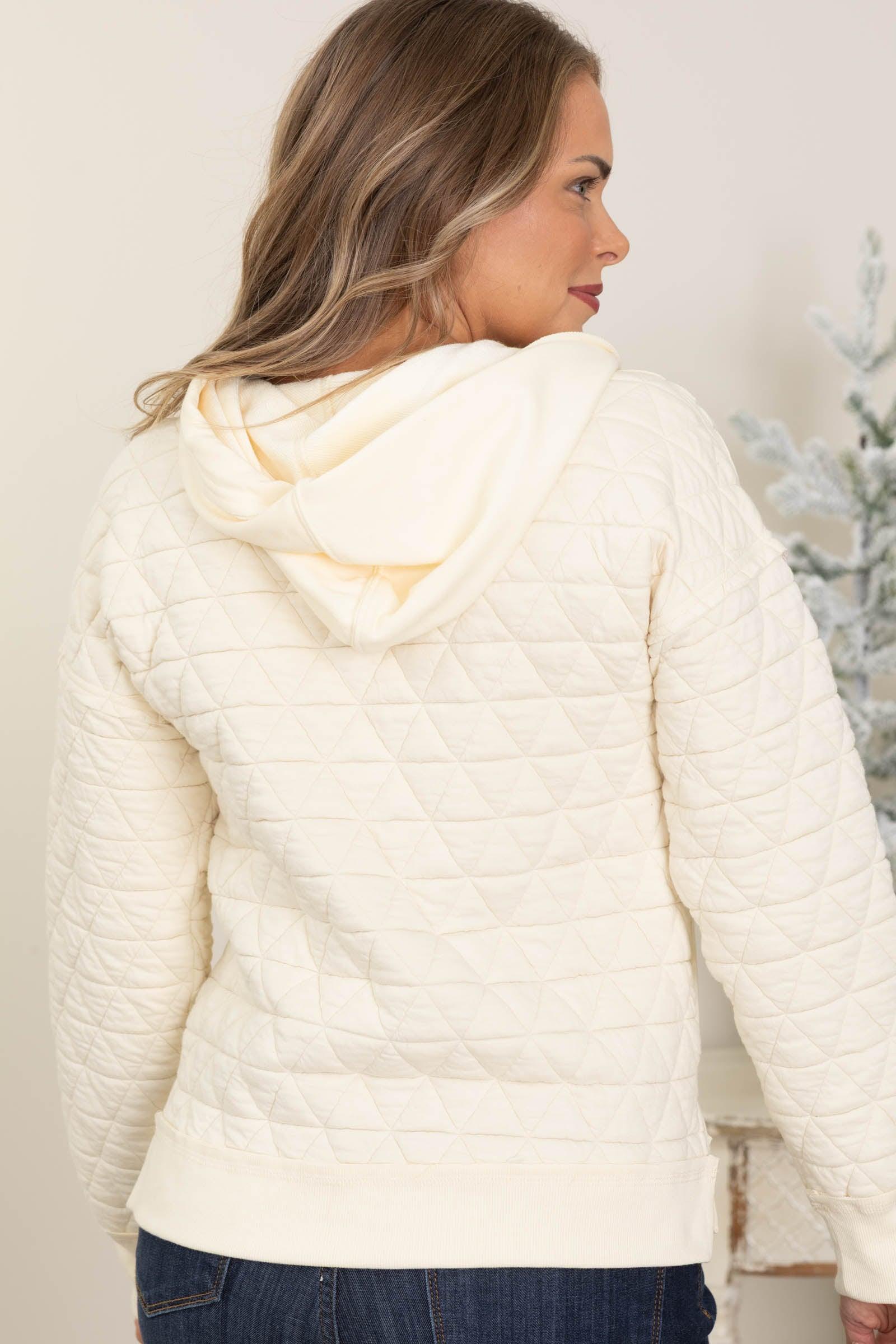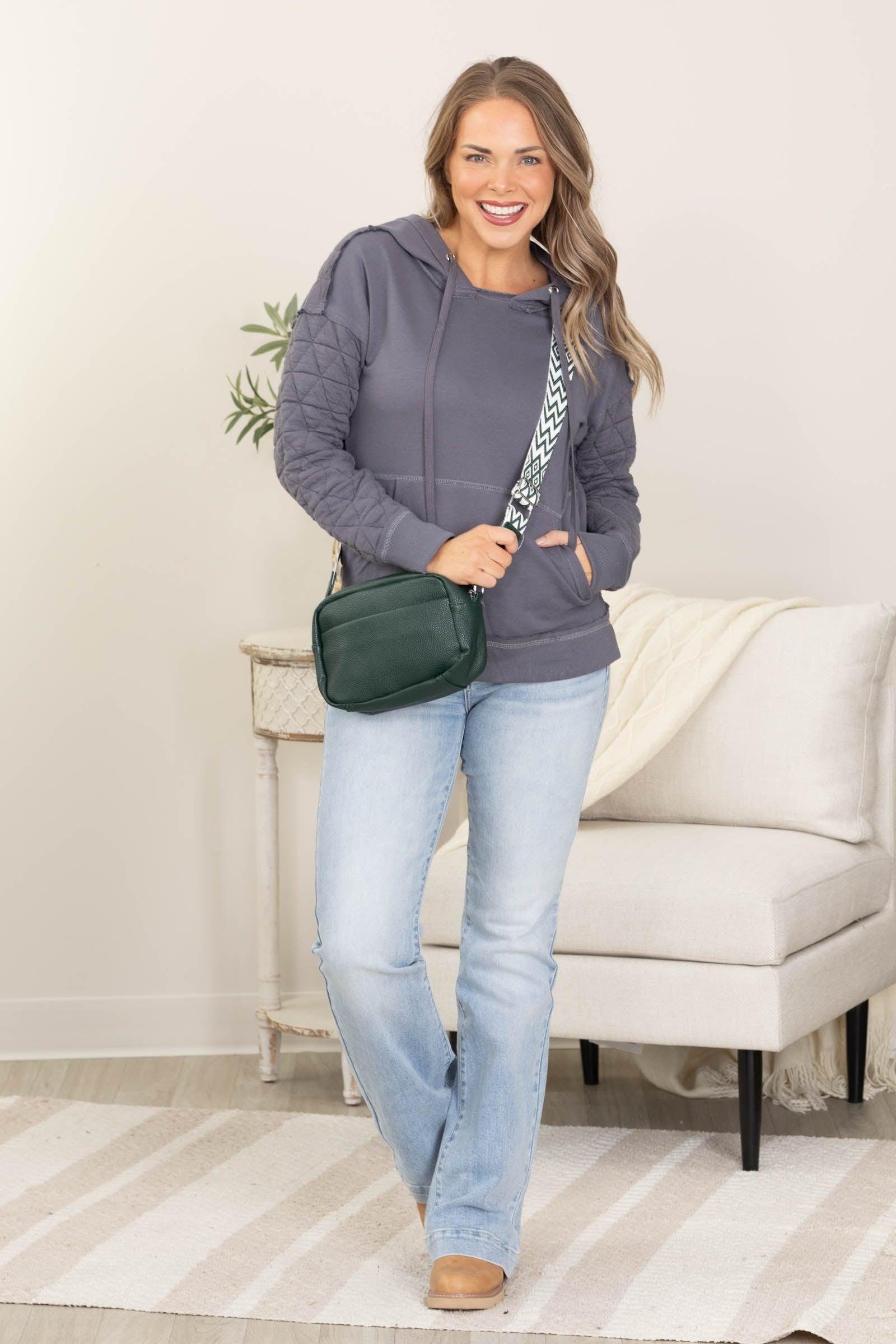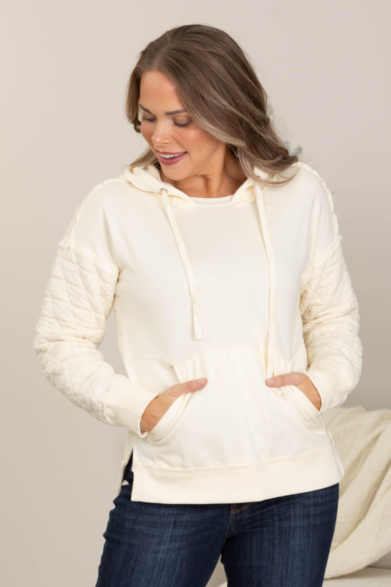 Product Details Colors: Charcoal/ Cream Print: Solid Neckline: Round With Hood Sleeve: Long Sleeve Hemline: Straight Brand: Staccato Material and Care Self: 79% Polyester 21% Cotton Contrast: 100% Cotton Hand Wash Cold Hang/ Line Dry Size and Fit Small: Bust 38" Waist 36" Length 24" Medium: Bust 40" Waist 38" Length 24.5" Large: Bust 42" Waist 40" Length 25" X Large: Bust 44" Waist 42" Length 25.5" Erica is 5’7” and wearing her true size small, but would prefer a medium for a more relaxed fit