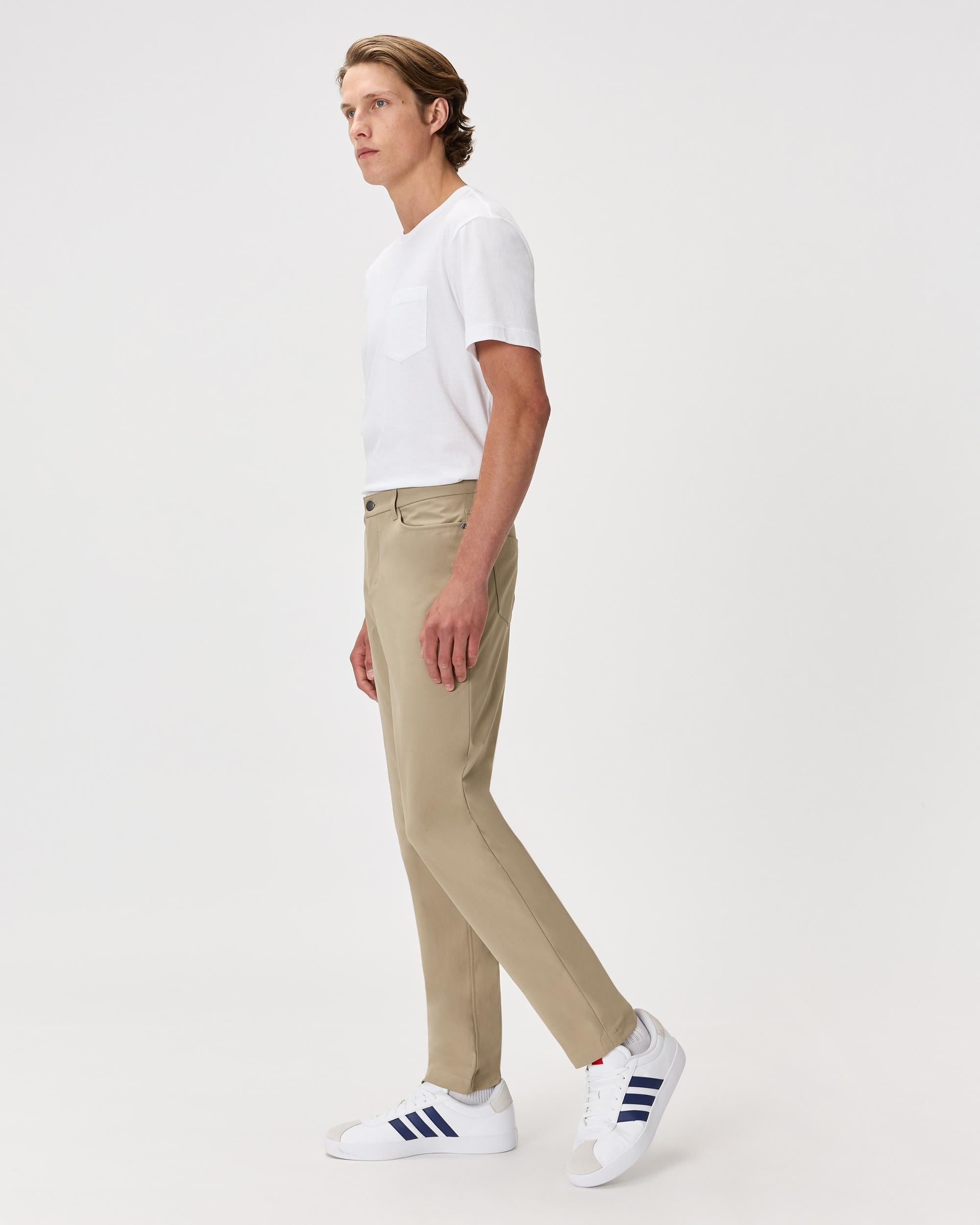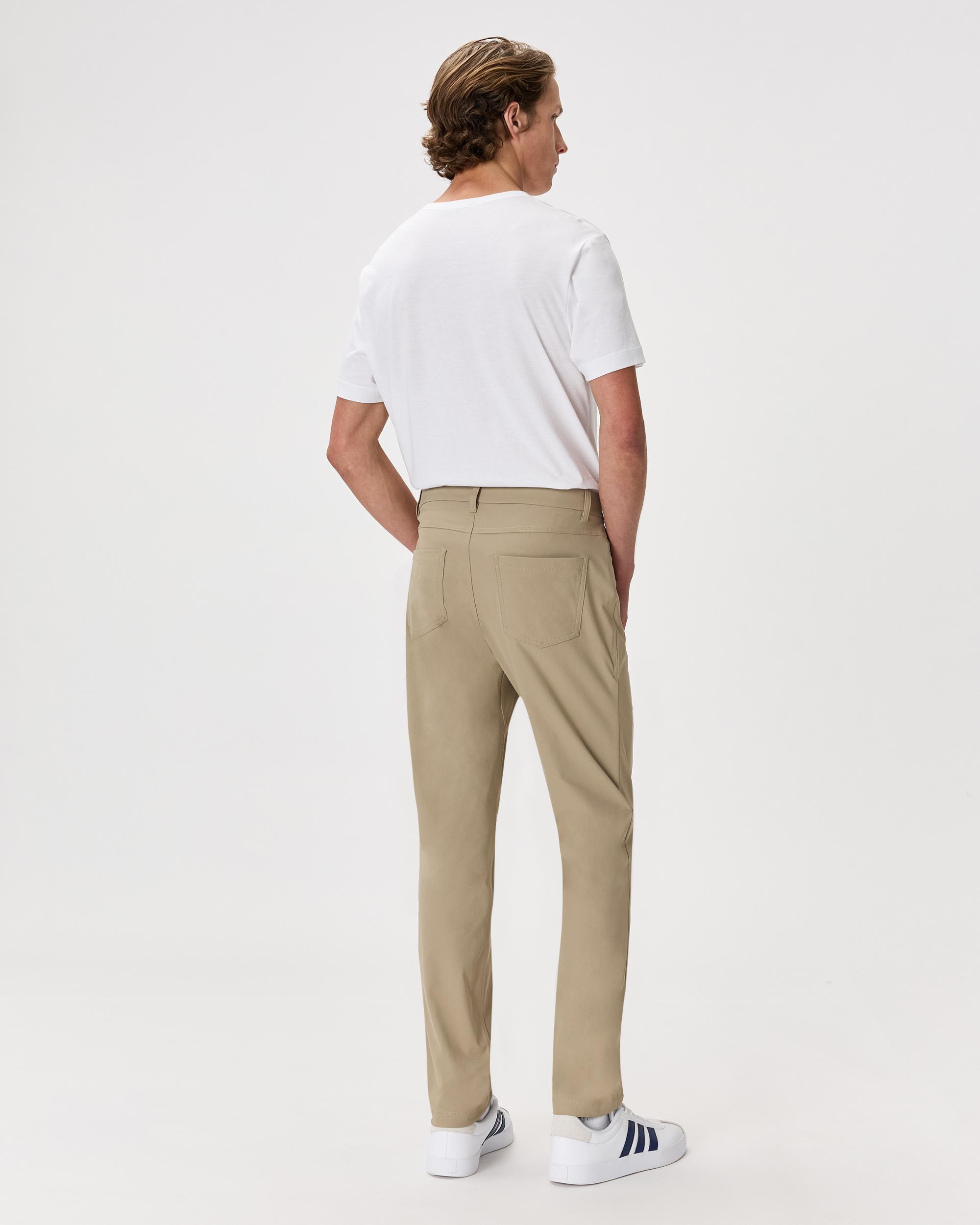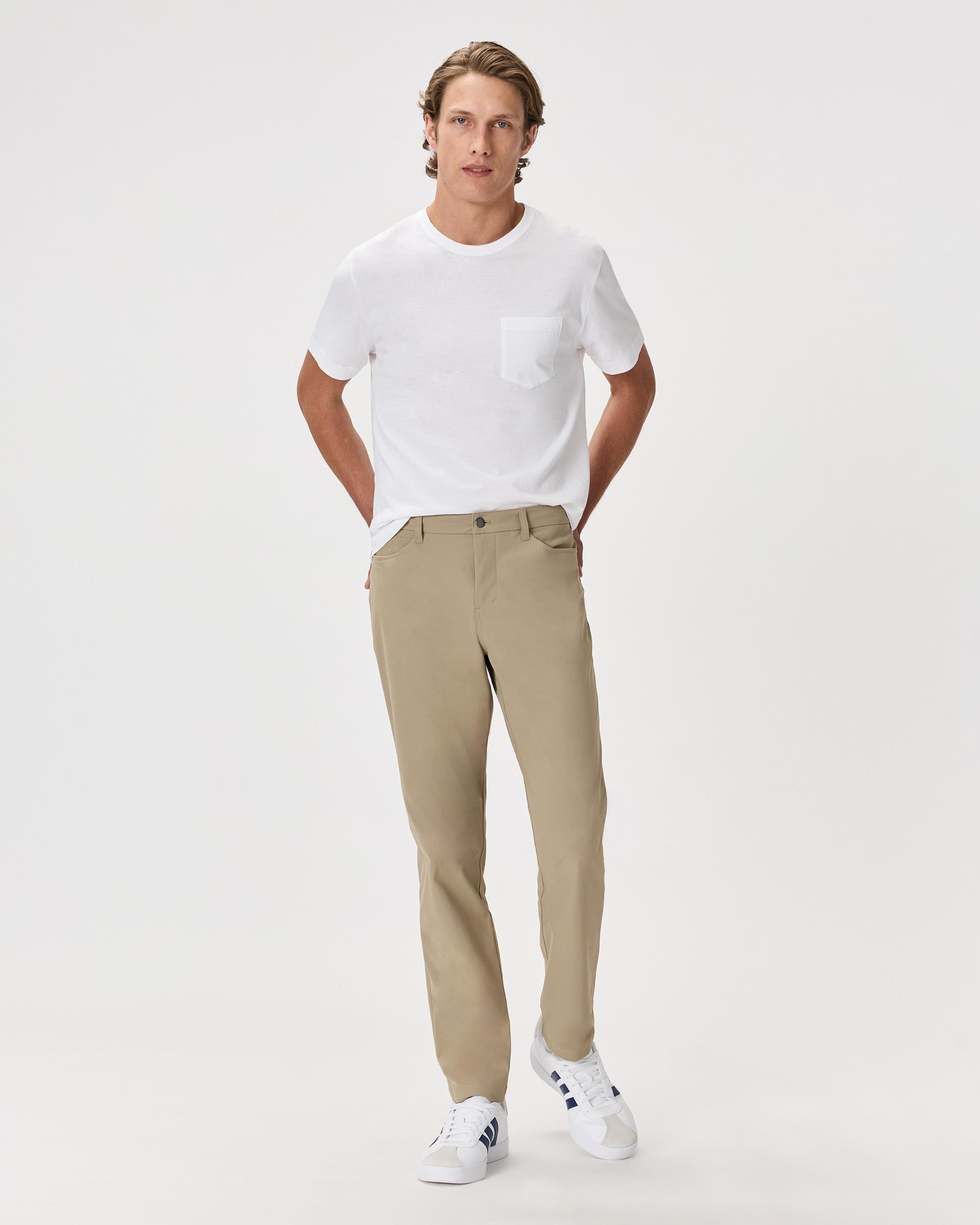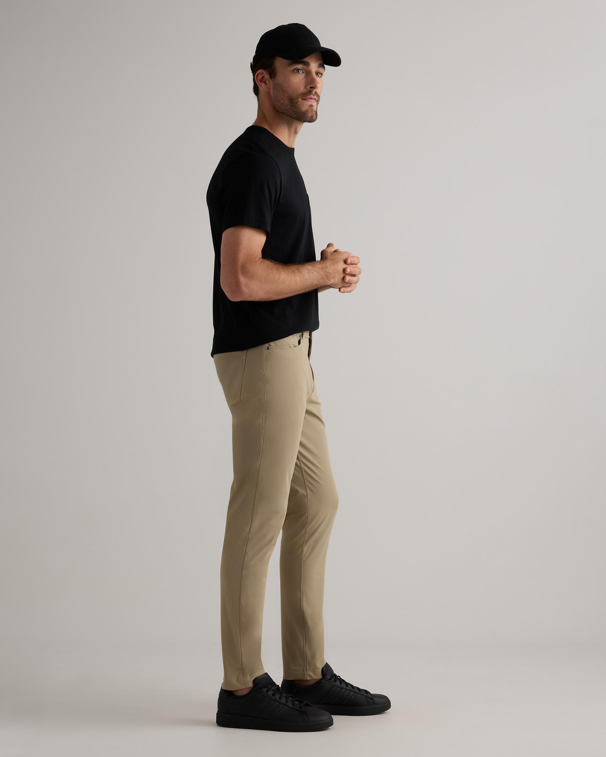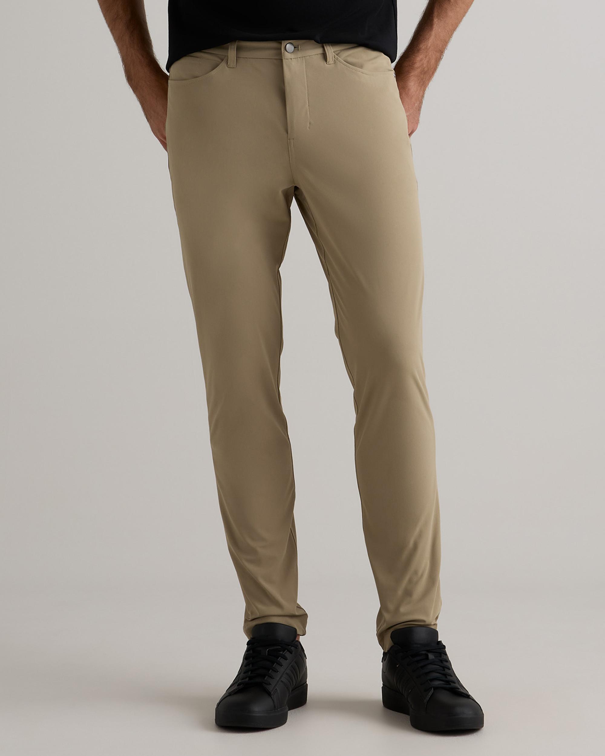 Your go-to for everything from office hours to off-duty plans. Designed with a classic 5-pocket silhouette, this pant leans more casual—like a cleaned-up pair of jeans, but crafted from lighter-weight performance fabric. Moisture-wicking, wrinkle-resistant, and built with 4-way stretch, it delivers all-day comfort and modern style. A hidden zippered back pocket and gusseted construction keep you moving (and organized) wherever the day takes you. | Quince | Men's Everyday 5-Pocket Tech Pants in Sand Dune, Size 30X30, Recycled Polyester