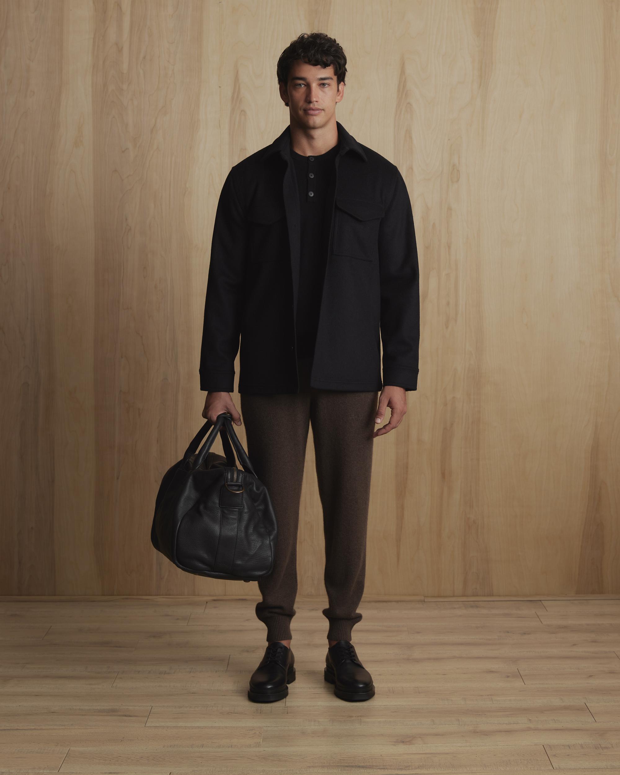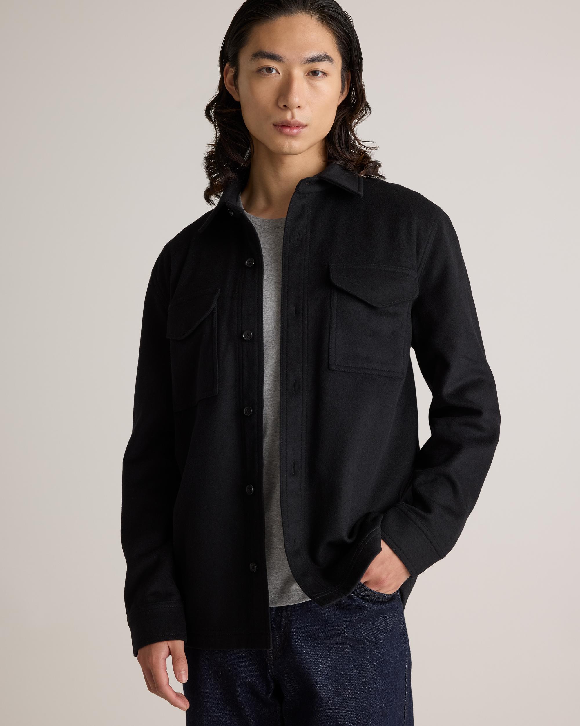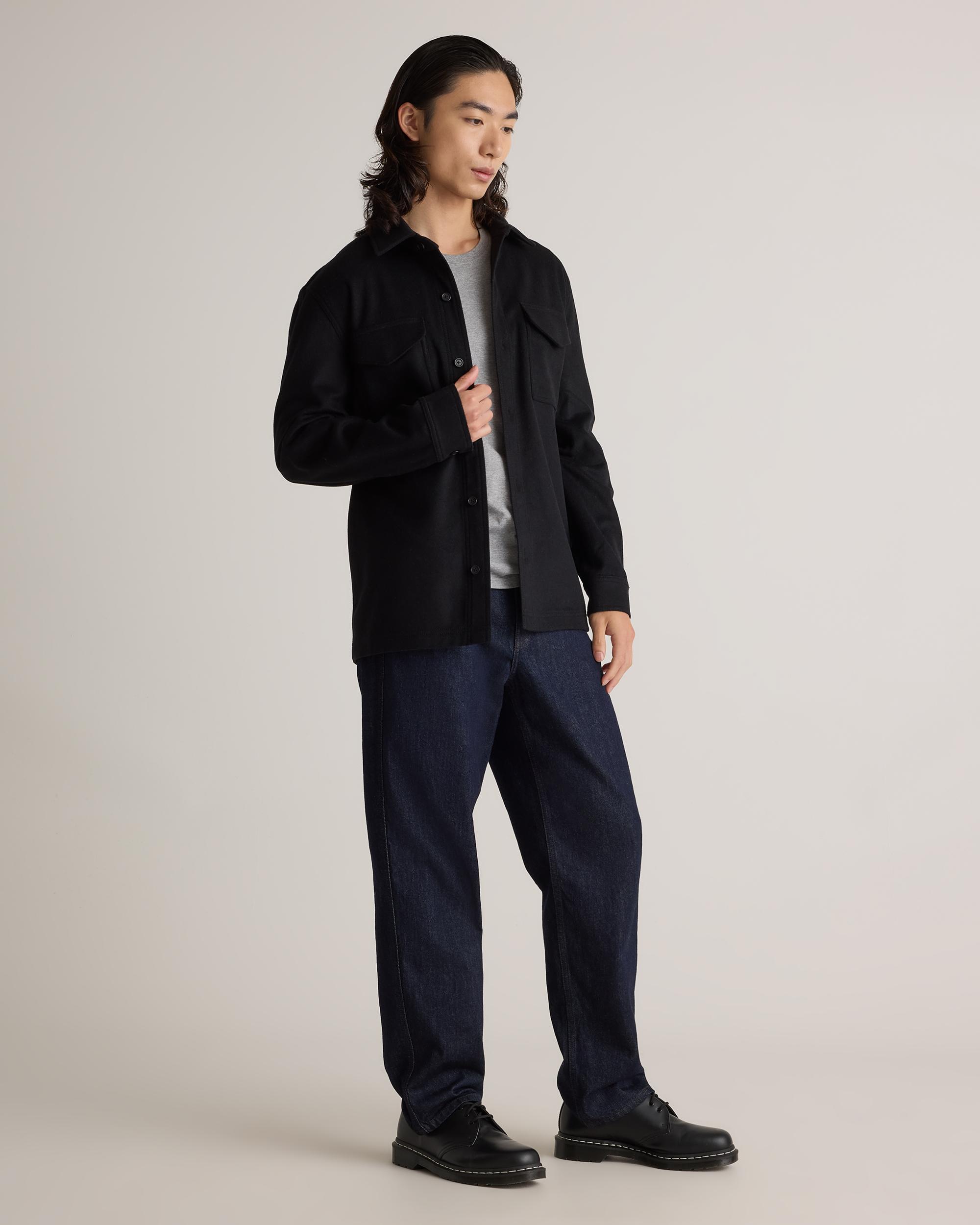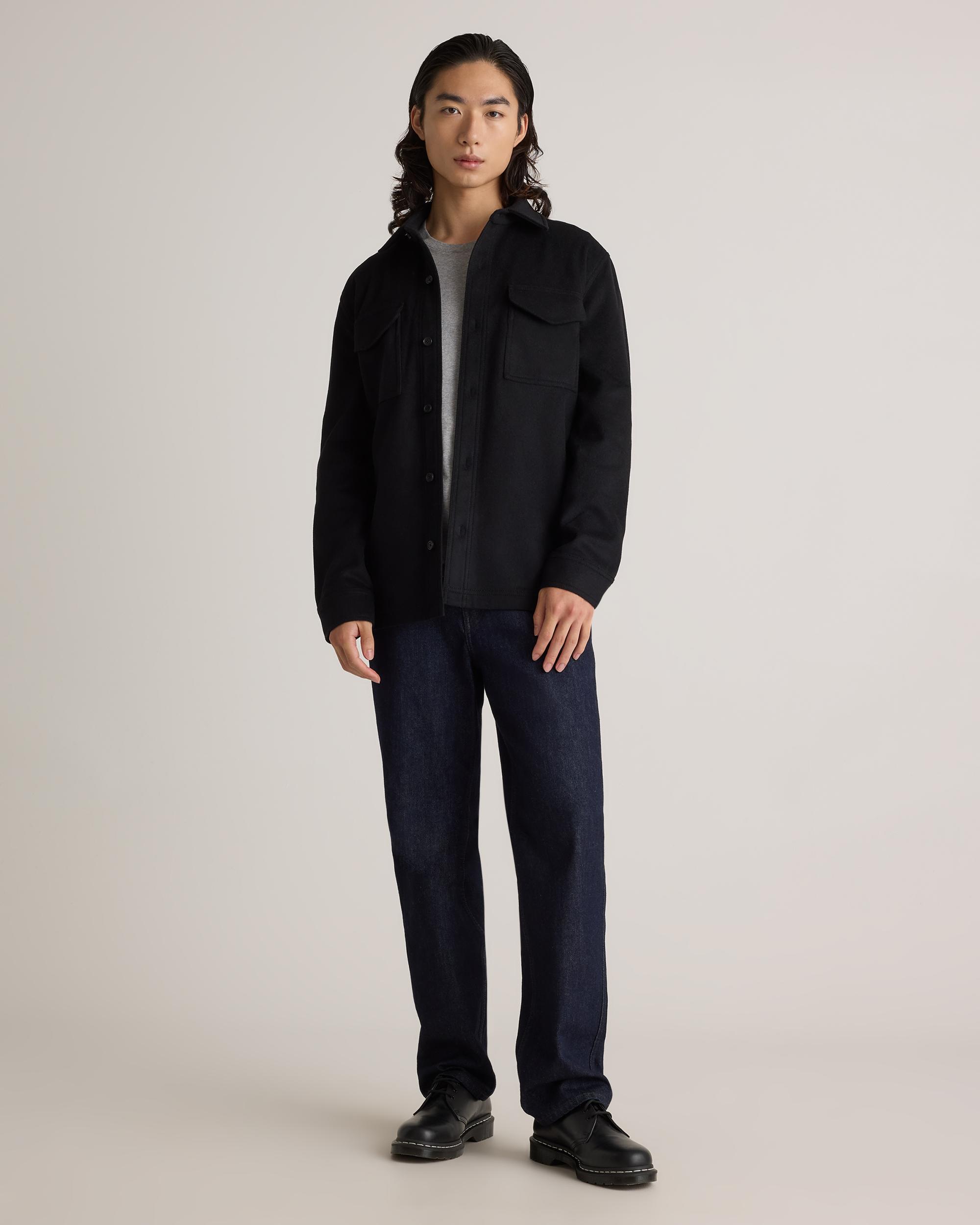 Looks like a relaxed shirt, feels like a just-right jacket. Our Italian Wool Overshirt is made from a warm, durable wool blend, and the classic, unlined structure makes it easy to layer over everything from shirts and tees to thicker sweaters. With a tailored yet low-key look, you'll be reaching for it every day of the week. | Quince | Men's Italian Wool Overshirt in Black, Size Medium, Wool/Nylon