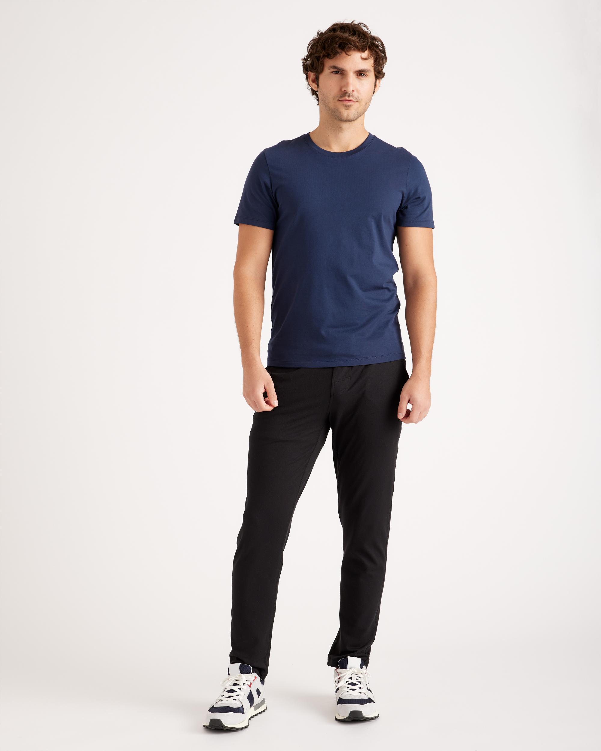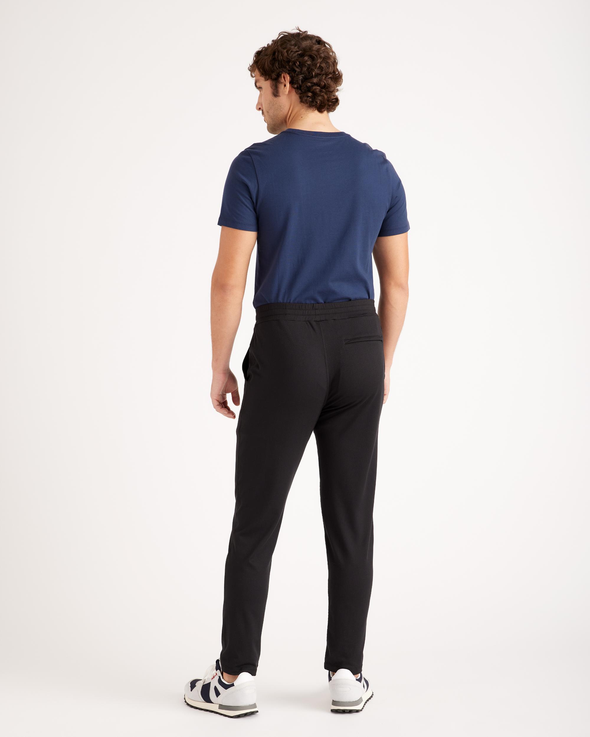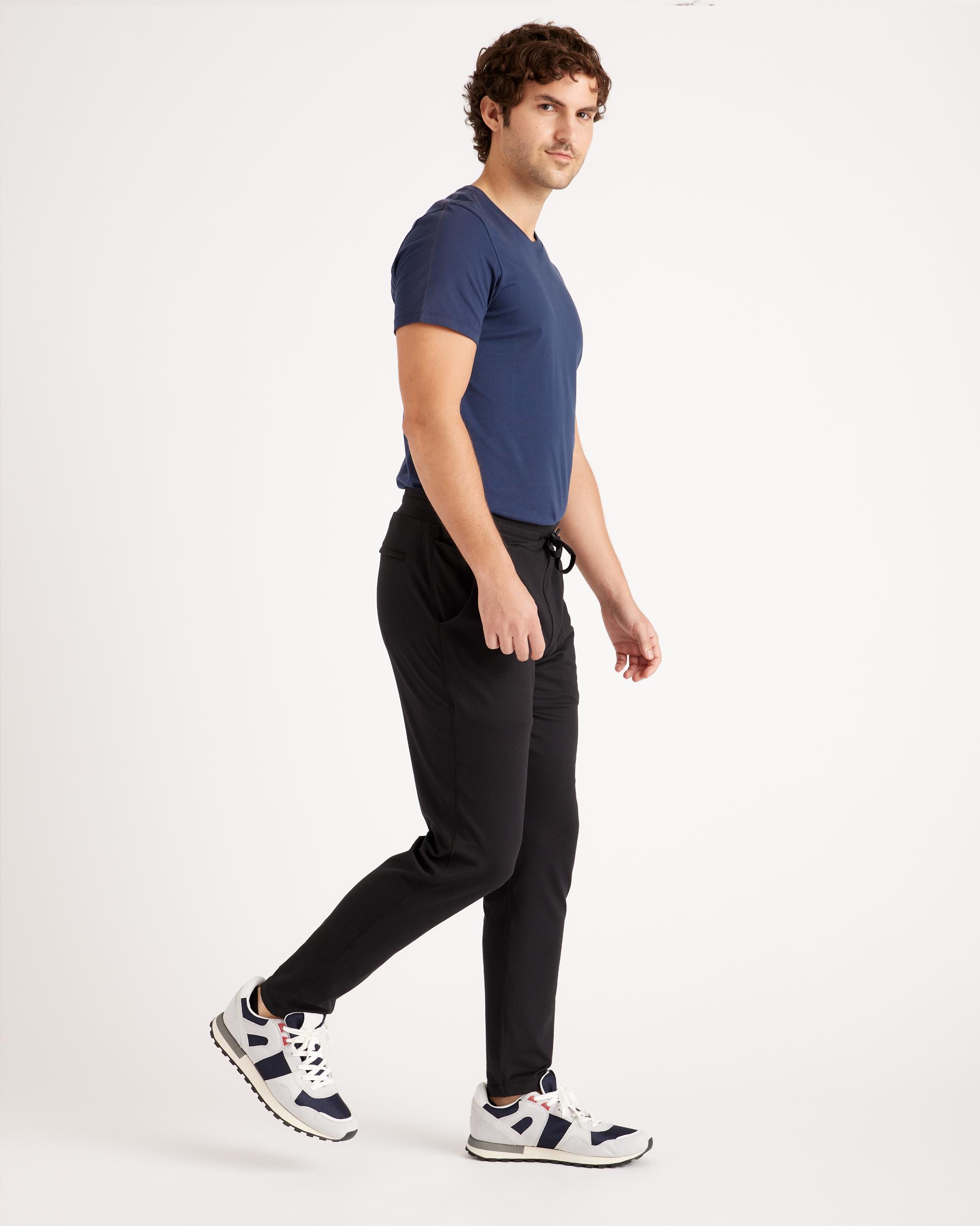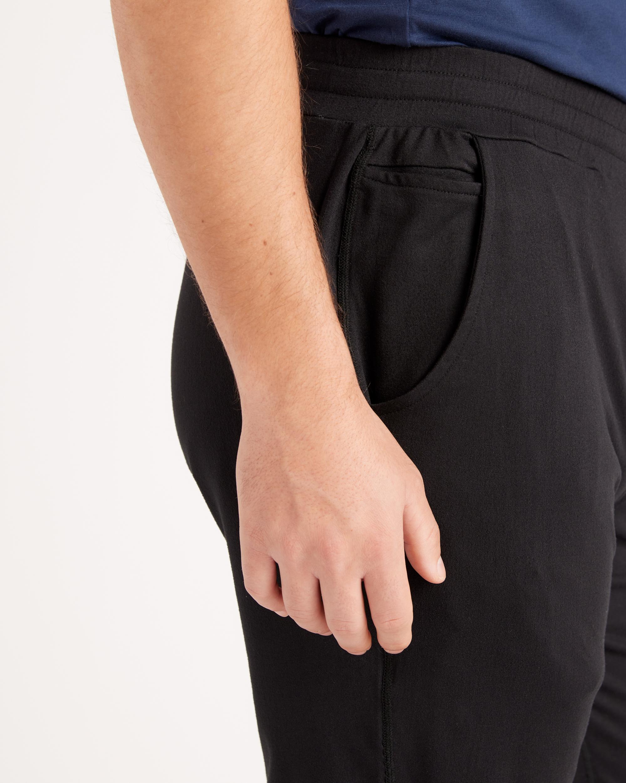 Our favorite performance joggers are a slim but relaxed fit with the perfect amount of stretch for ultimate comfort. Thick drawstrings, cuffed ankles, and two pocket design give them a premium feel. Our Flowknit is made from Global Recycle Standard poly yarn, which diverts and recycles plastics destined for landfill or the ocean, so you can feel and look good in what you wear. | Quince | Men's Super Soft Performance Pants in Black, Flowknit Activewear, Size Large, Recycled Polyester