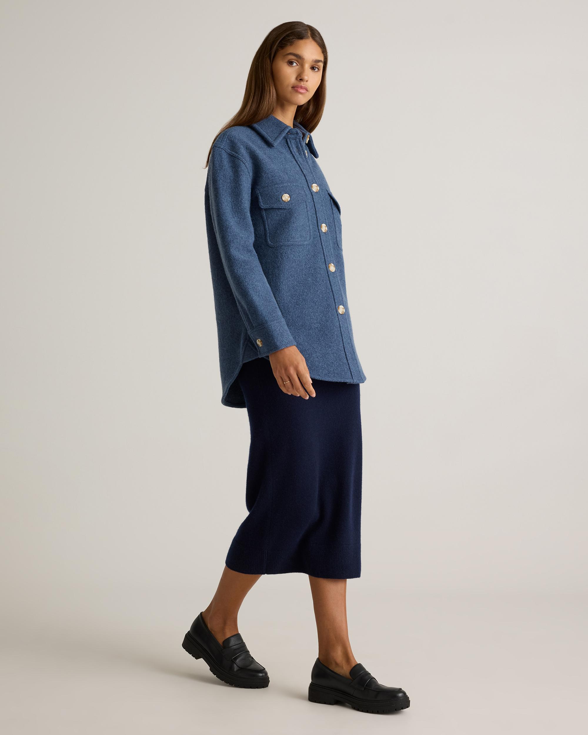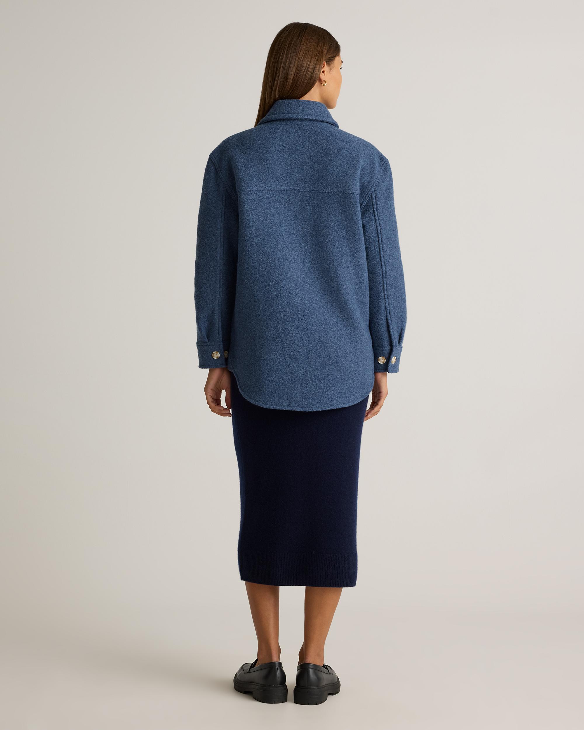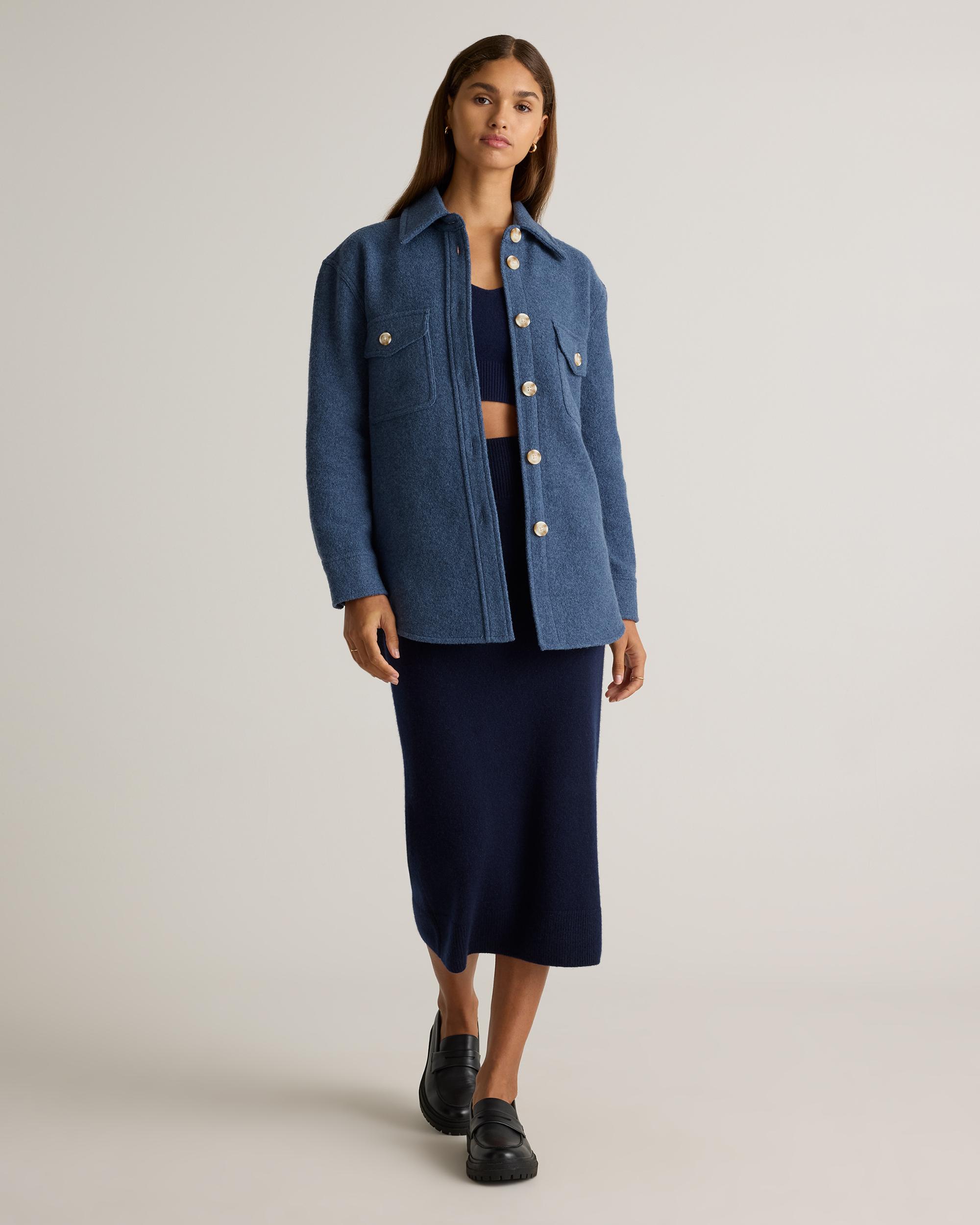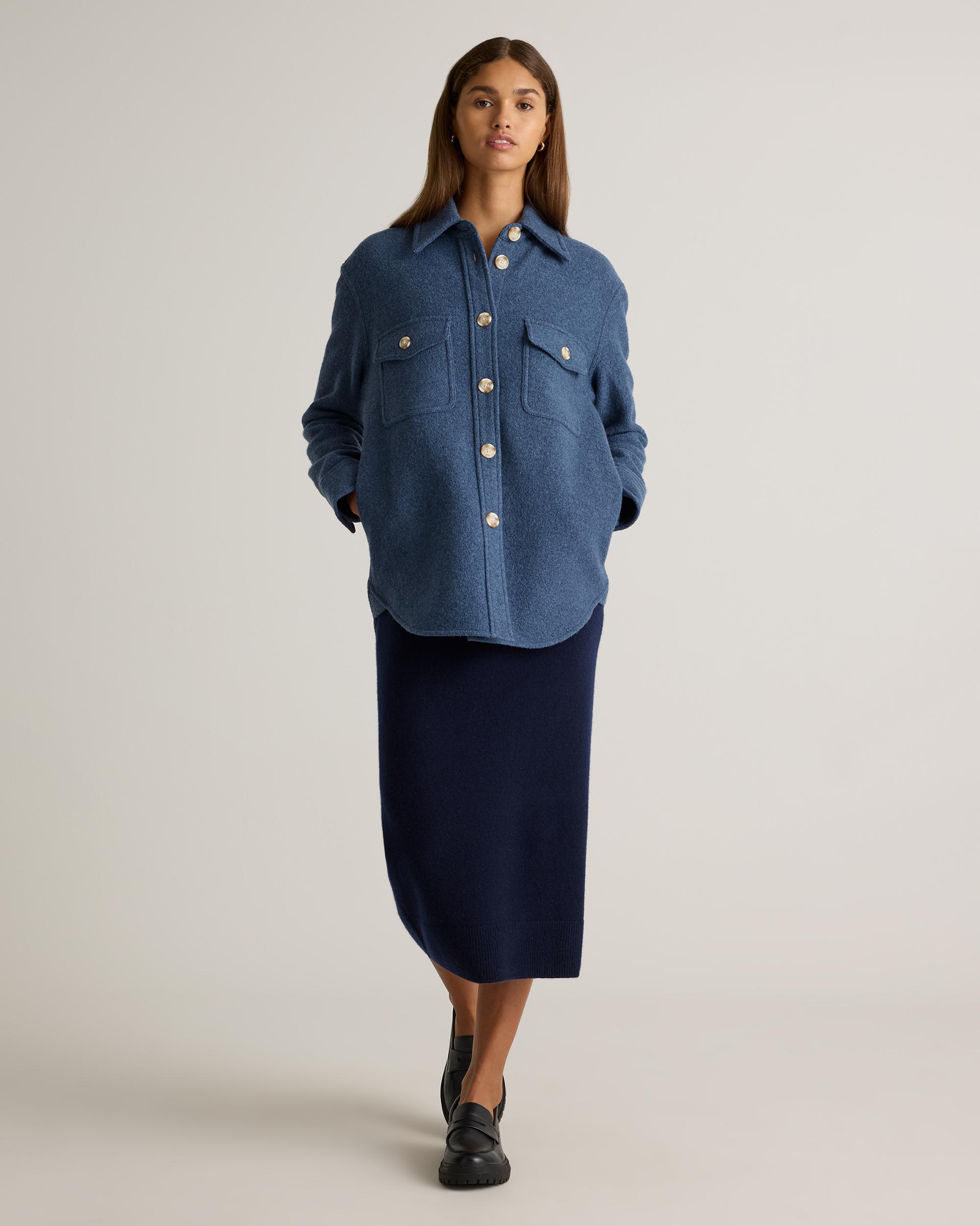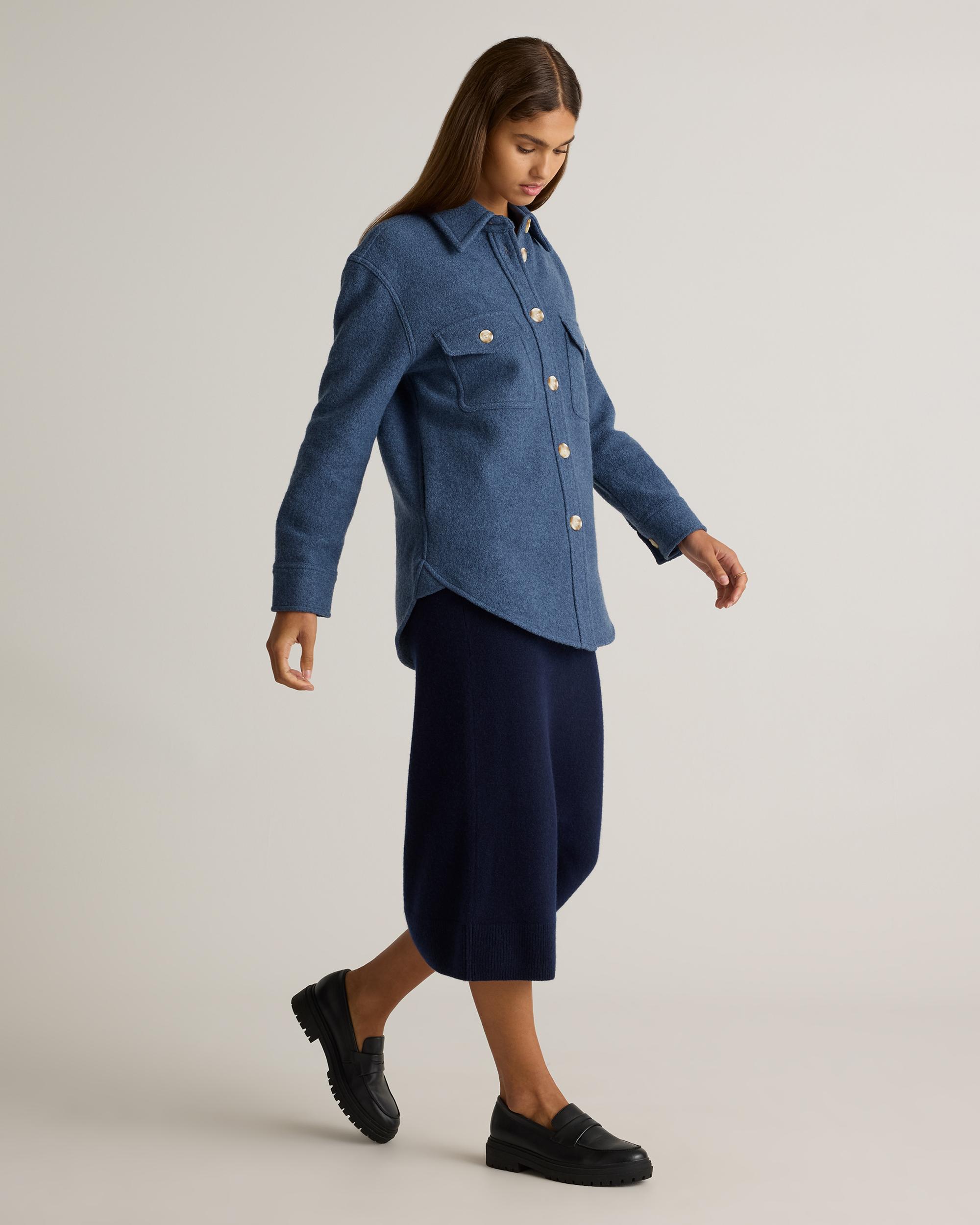 Our 100% Merino Wool Shirt Jacket is your perfect go-to style as the temperature starts to drop. Expertly tailored with boiled merino wool, this shirt jacket - shacket - has the relaxed silhouette of a shirt, but provides the warmth of a jacket. With an intentionally oversized look, it's perfect for layering and made to throw on over any outfit with ease. | Quince | Women's 100% Merino Wool Shirt Jacket in Denim Blue Melange, Size Small