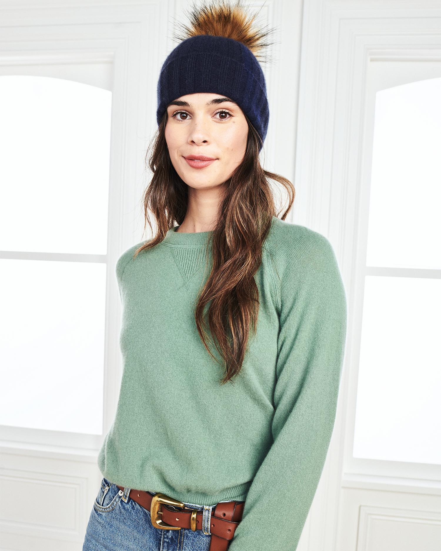 Our best-selling cashmere beanie with a playful pom pom detail to instantly add the perfect dose of warmth style, whether you're running errands or hitting the slopes. With a ribbed texture and adjustable folded cuff you can wear it exactly how you like it. Our quality cashmere is incredibly long-lasting and three times as warm as wool, sourced sustainably and ethically. Read more on what makes it special in our Cashmere 101. | Quince | Women's Cashmere Pom Pom Beanie in Navy Grade A Mongolian Cashmere, Winter Hats